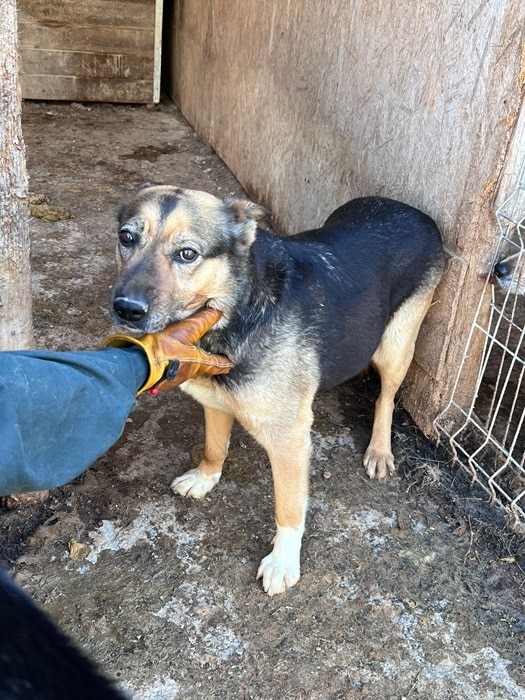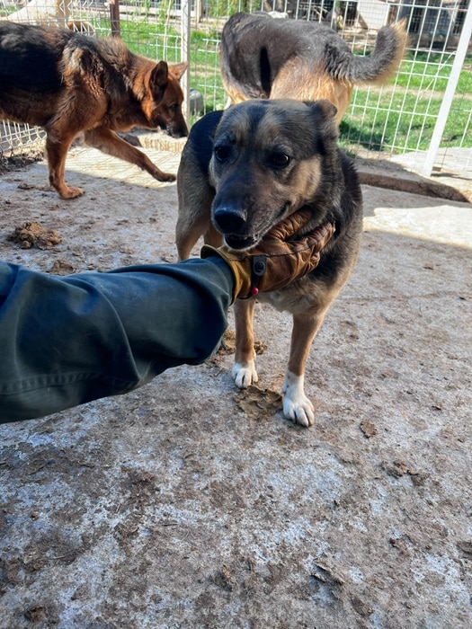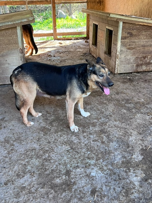 Die ältere Hündin ist sehr freundlich zu uns und den anderen Hunden. Sie lässt sich gut anfassen und ist zutraulich. Mit den anderen Hunden ist sie verträglich. Ihr Gesäuge ist deutlich sichtbar, sie hatte sicher schon einige Welpen und einige Zähne fehlen auch schon. Sie wird sicher schon einiges im leben erlebt haben.