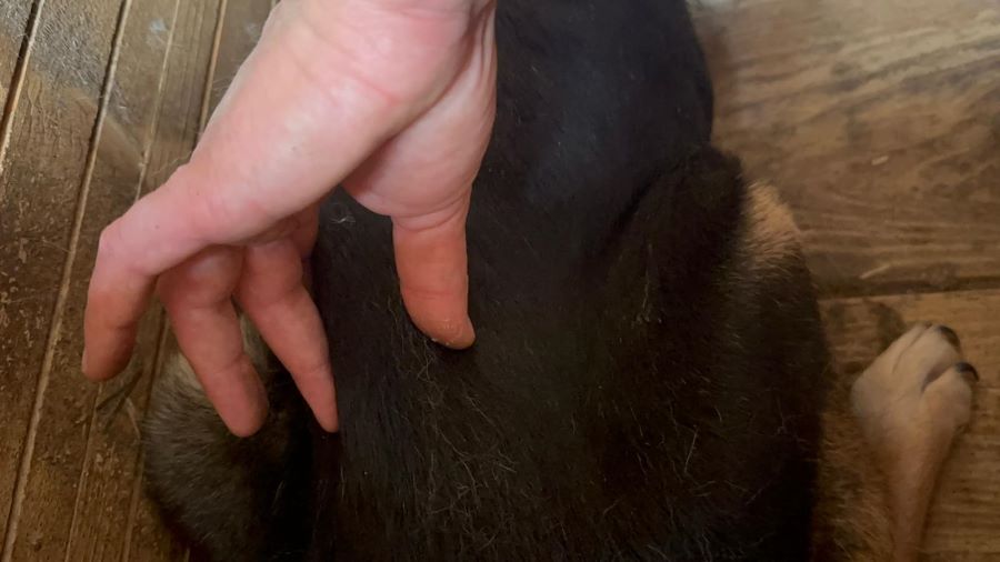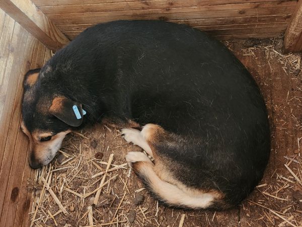 GYPSI ist nicht mehr zu dünn. Sie ist weiterhin unsicher uns Menschen gegenüber und saß bei unserem Besuch nur in der Hütte. Sie wollte dort keine Leckerlies von uns annehmen, wir konnten sie aber problemlos streicheln. GYPSI konnte das zwar nicht genießen, zeigte aber keinerlei Abwehrverhalten. Eher versuchte sie, sich hinter einem anderen Hund zu verstecken.