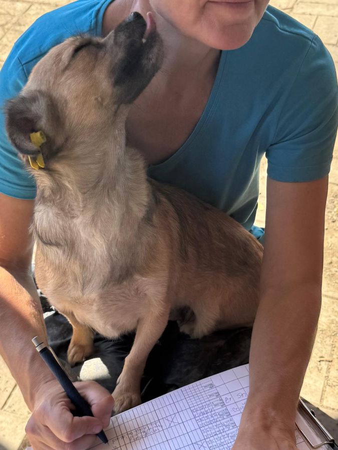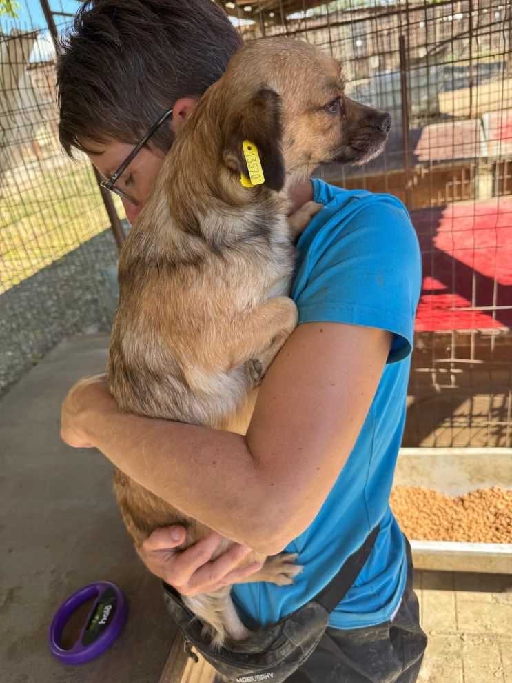 Diese niedliche kleine Hündin scheint noch recht neu in Bucov zu sein. Anfangs hielt sie sich nur in ihrer Hütte auf und es schien, als wären wir ihr nicht ganz geheuer. Als wir uns ihr widmeten, war sie zunächst noch etwas skeptisch. Wir konnten sie jedoch problemlos auf den Arm nehmen und das Eis war gebrochen. Ab da wich sie uns nicht mehr von der Seite. Sie durfte sogar bei der Erfassung der anderen Hunde als Schreibkraft auf einem Schoß der Volontäre unterstützen.