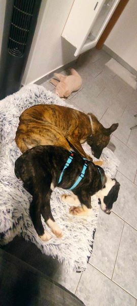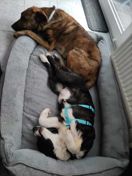 Das alleine bleiben wird gerade geübt und er kann schon eine kurze Zeit mit unserem Hund zusammen alleine sein.