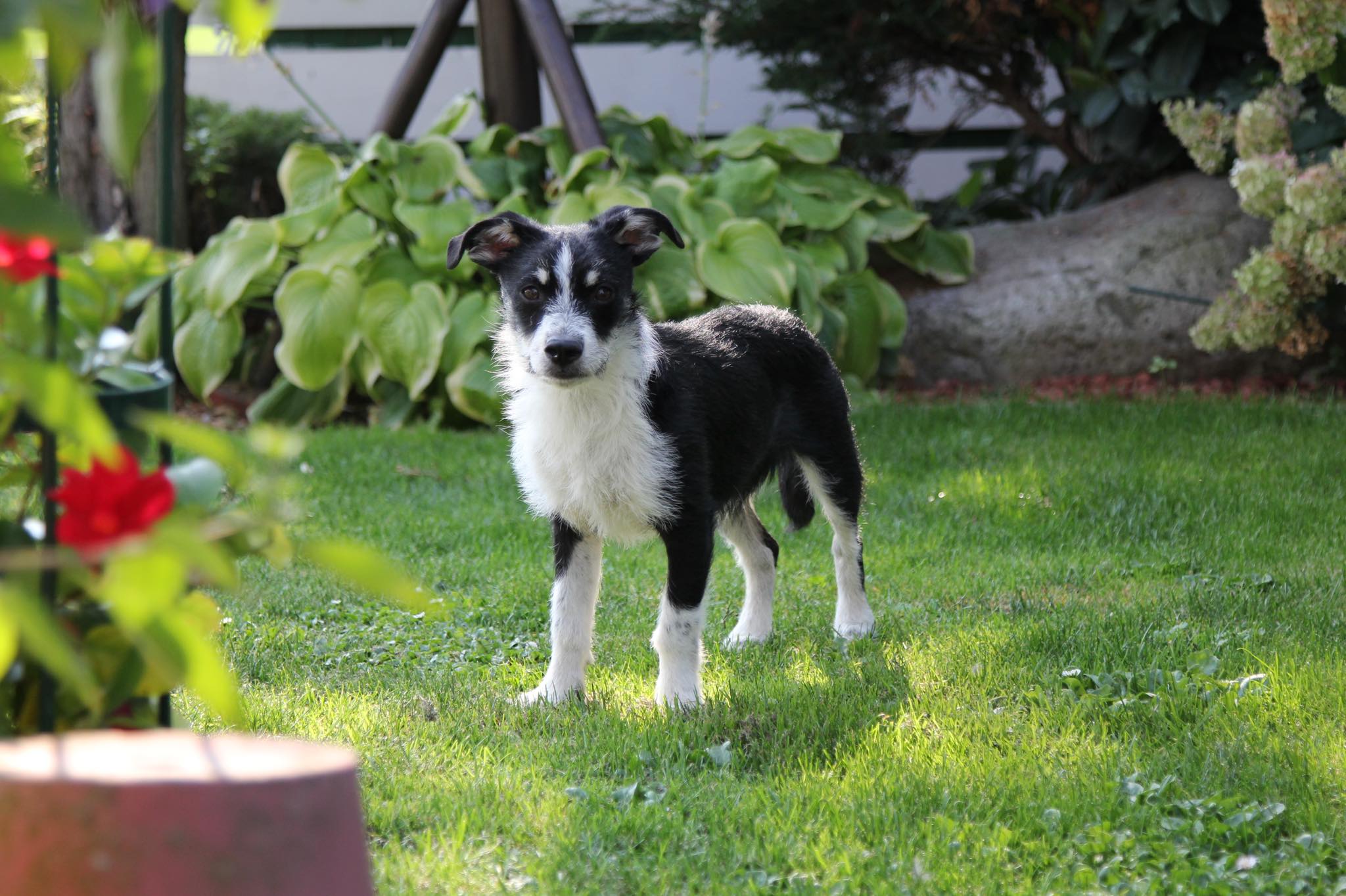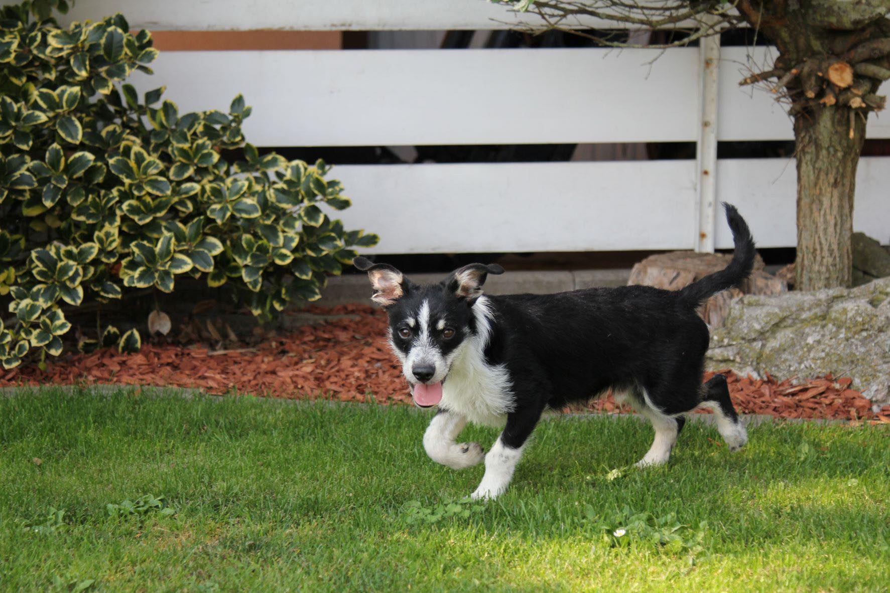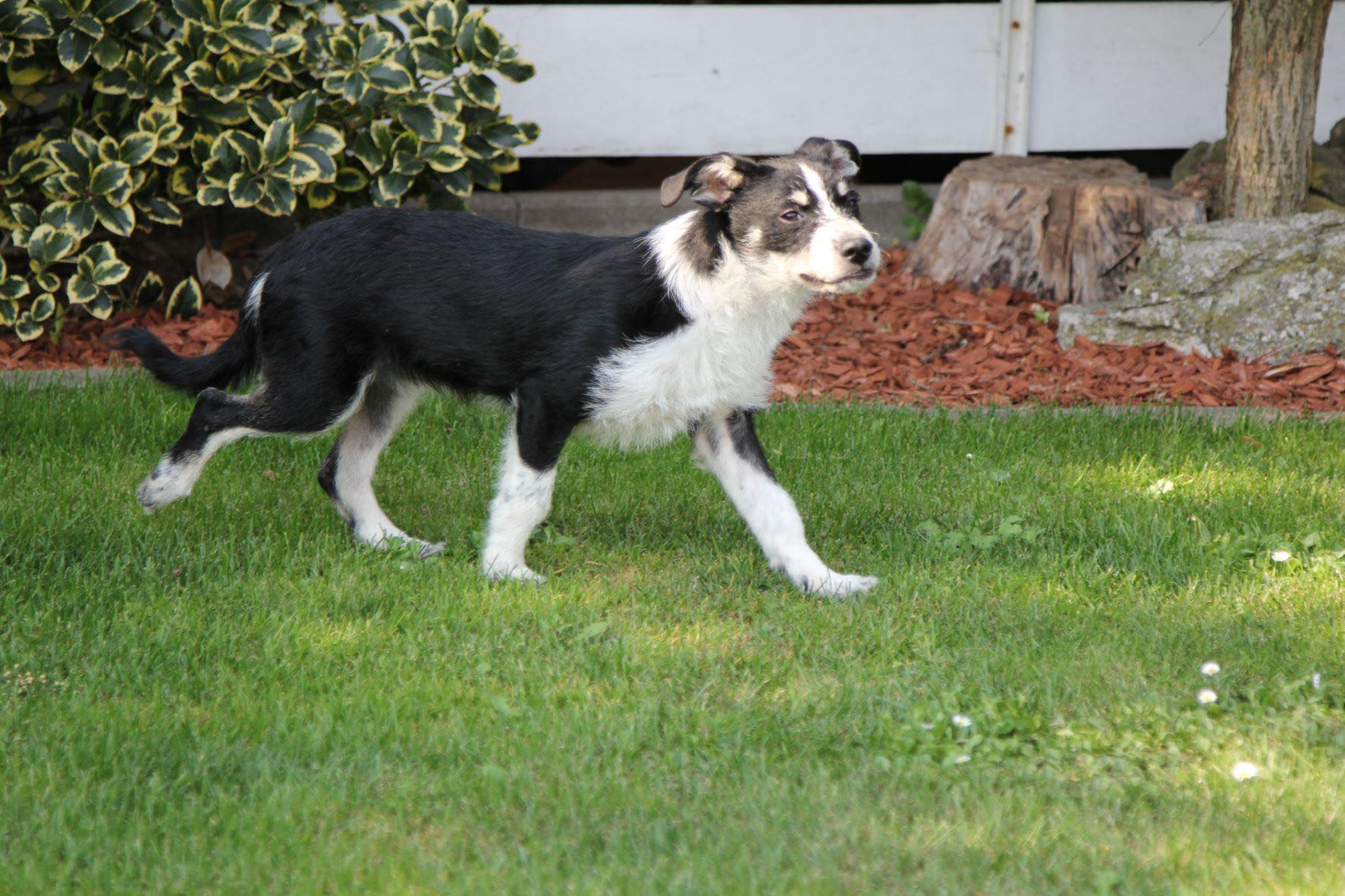 Halumi hüpft , wenn er sich freut, wie ein kleiner Gummiball durch die Gegend. Er schläft noch viel und bleibt, in Gesellschaft meiner anderen Hunde, auch problemlos bis zu 2 Stunden alleine zu Hause. Im Auto wird er in einer Transportbox befördert, was er ohne Probleme mitmacht. Bei fremden Menschen oder Hunden zeigt er keine Ängste.