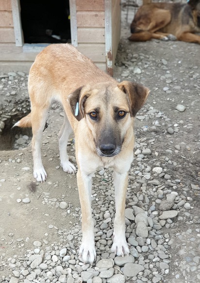 HANIA ist eine freundliche Hündin, der Umgang mit Menschen ist ihr aber noch fremd. Leckerlie nimmt sie gerne aus der Hand, weicht danach aber direkt wieder zurück, zu mehr fehlt ihr der Mut. Die Bisswunden sind inzwischen alle verheilt, die Narben sind weiterhin leicht zu sehen.