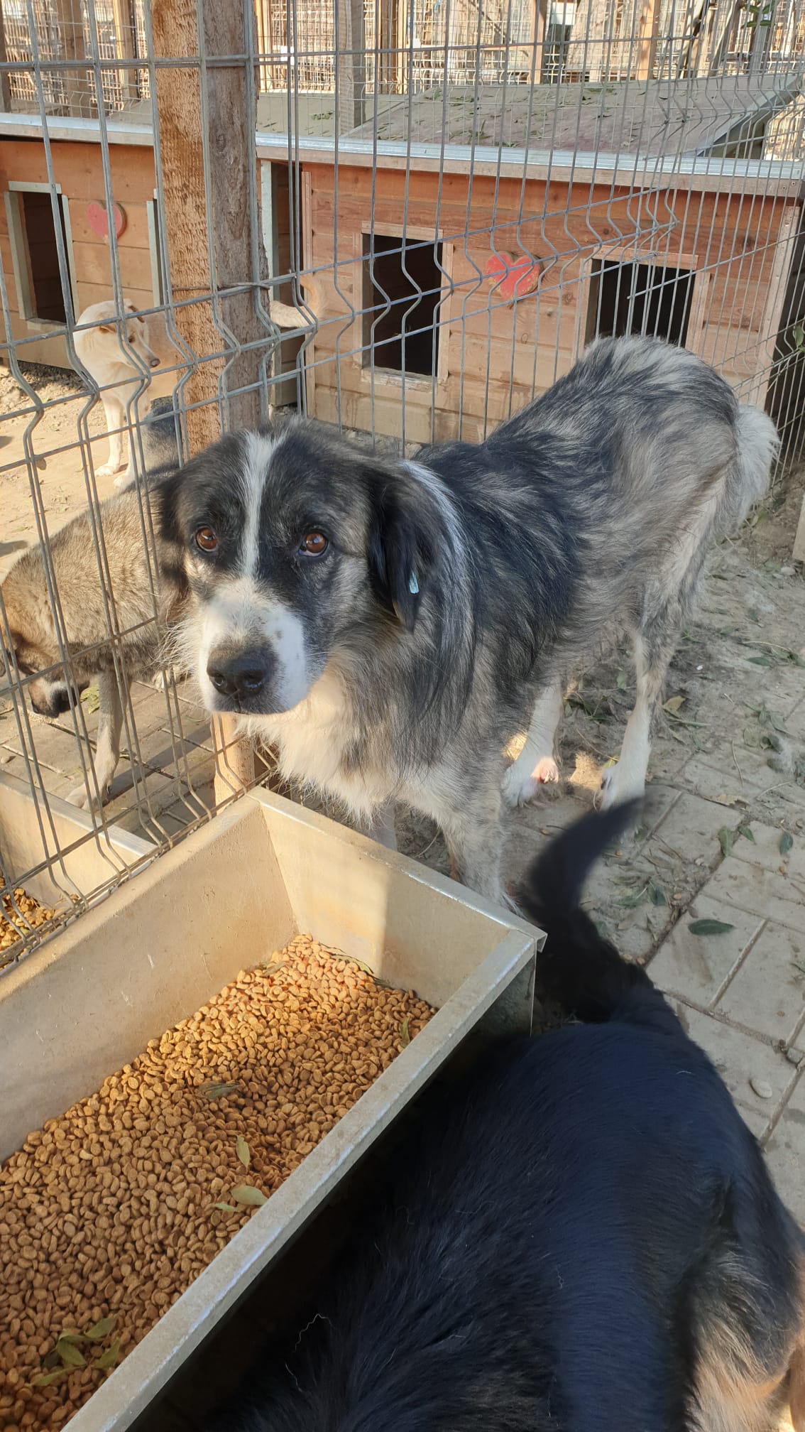 HEINO zeigte sich uns gegenüber als netter großer Rüde, der sich auch streicheln lässt. Man spürte, dass er gerne noch mehr Kontakt haben möchte, aber er wich immer zurück, da ein anderer großer, sehr menschenbezogener Rüde sich so über unseren Besuch freute, dass er immer dazwischen sprang und HEINO nicht mithalten wollte. Beide Rüden verstehen sich gut, HEINO akzeptiert, dass der andere Rüde da eher der Chef ist.