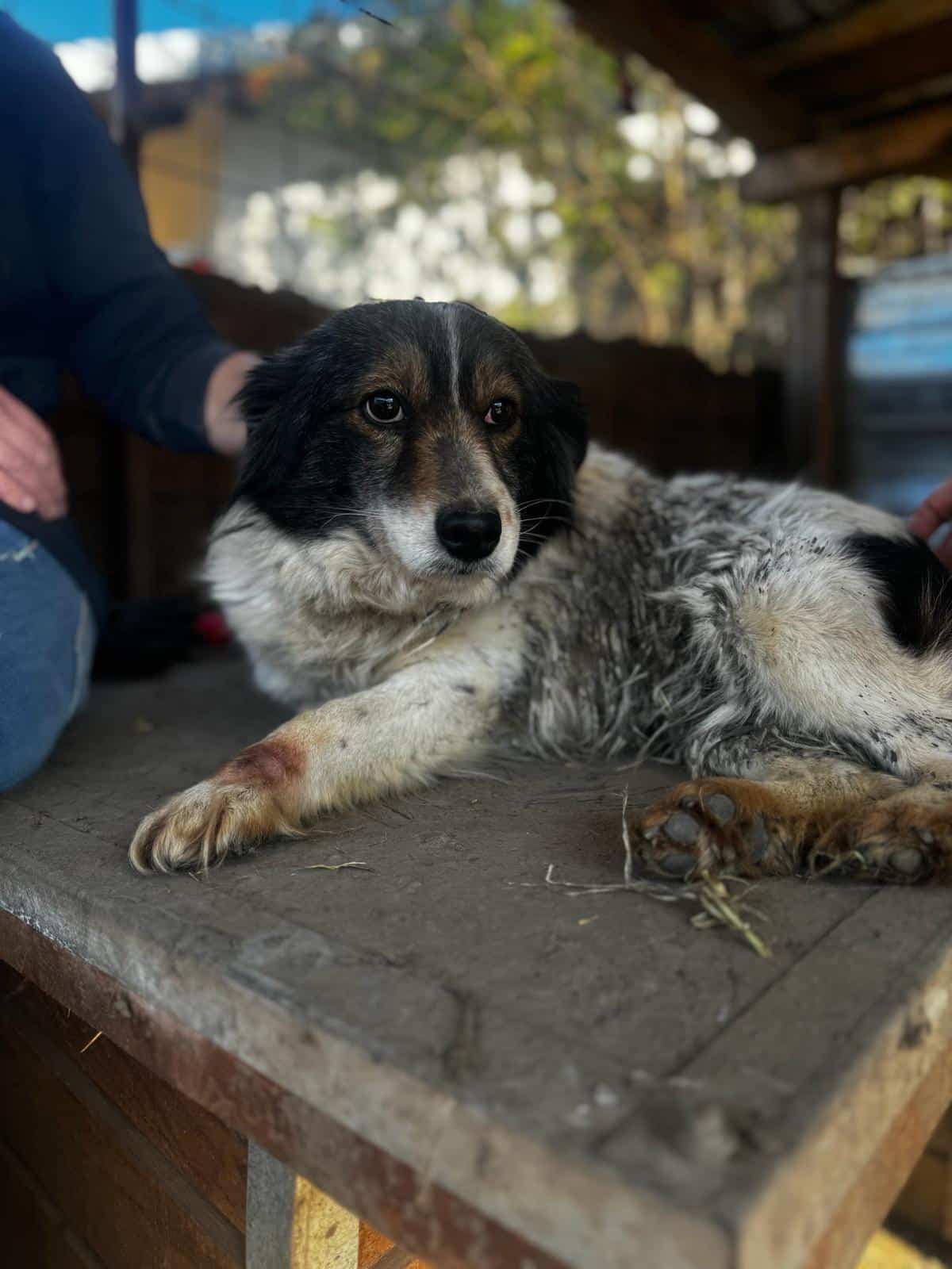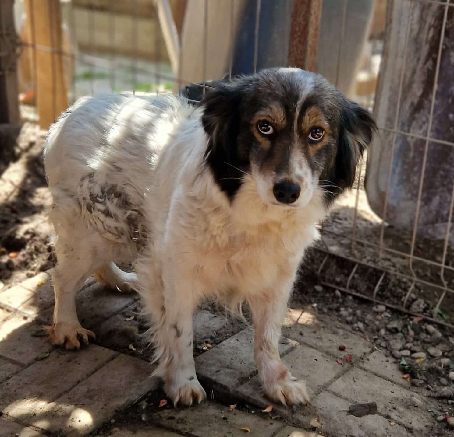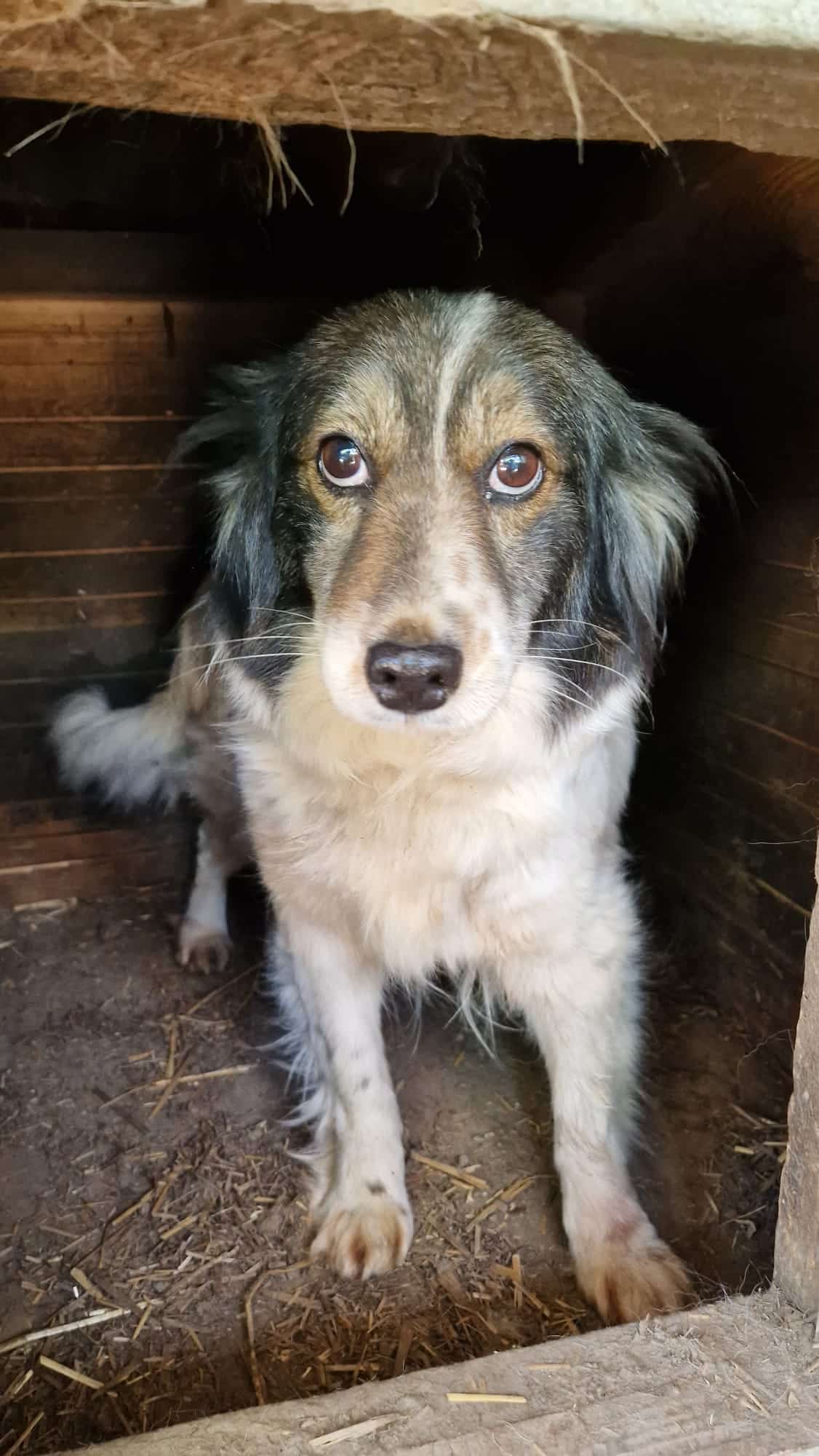 Diese kleine ältere Hündin fiel uns beim Betreten des Kennels sofort auf. Sie zeigte motorische Unsicherheiten und konnte sich nur mit Mühe fortbewegen. Ihre Hinterhand konnte sie kaum belasten. Ein Großteil des Fells ist verfilzt und mit Dreck verklumpt.