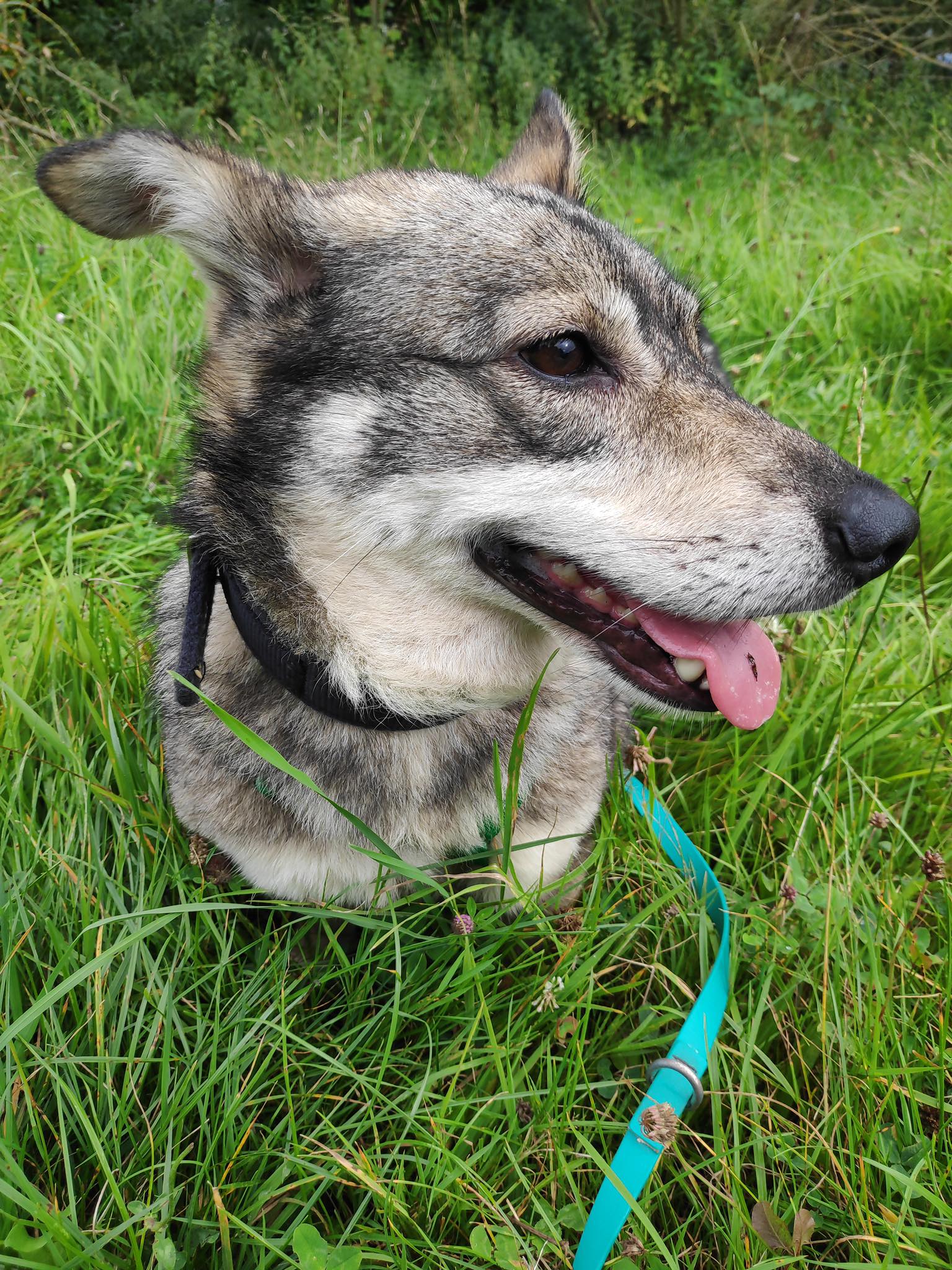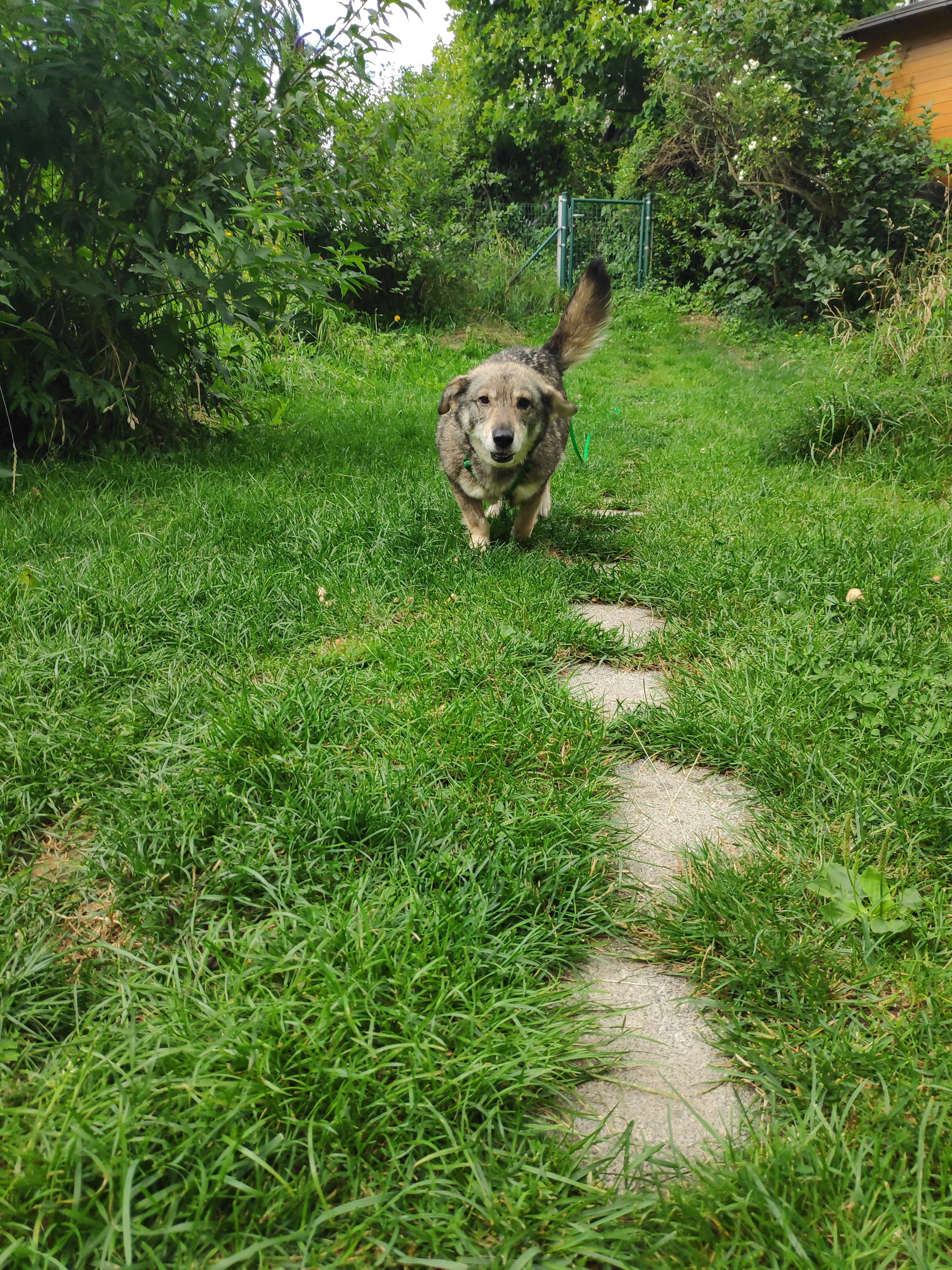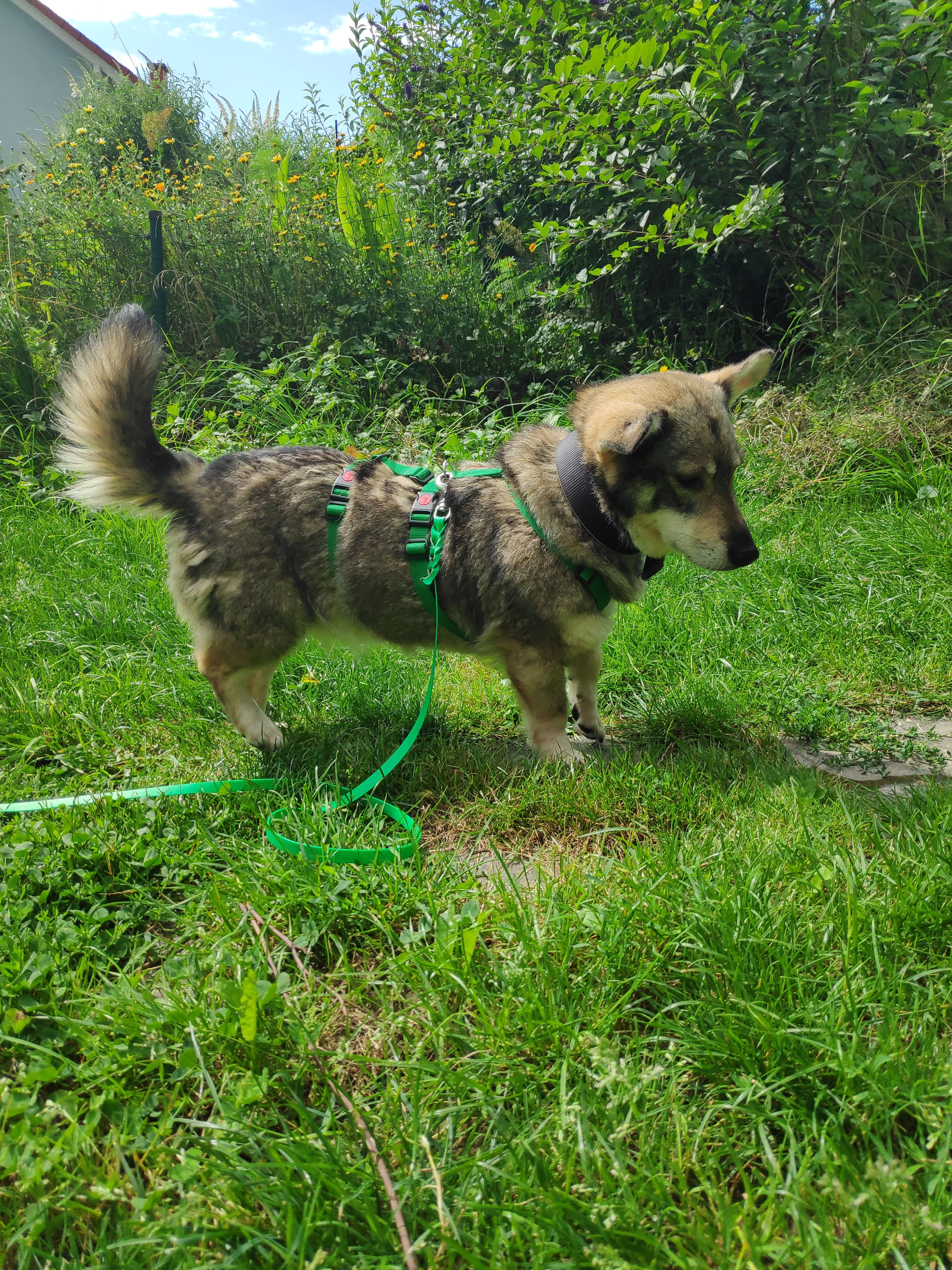 Helga geht gerne spazieren, liegt dann aber auch gerne in ihrem Körbchen.