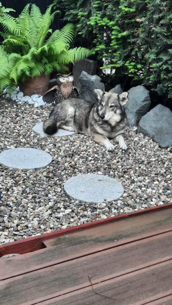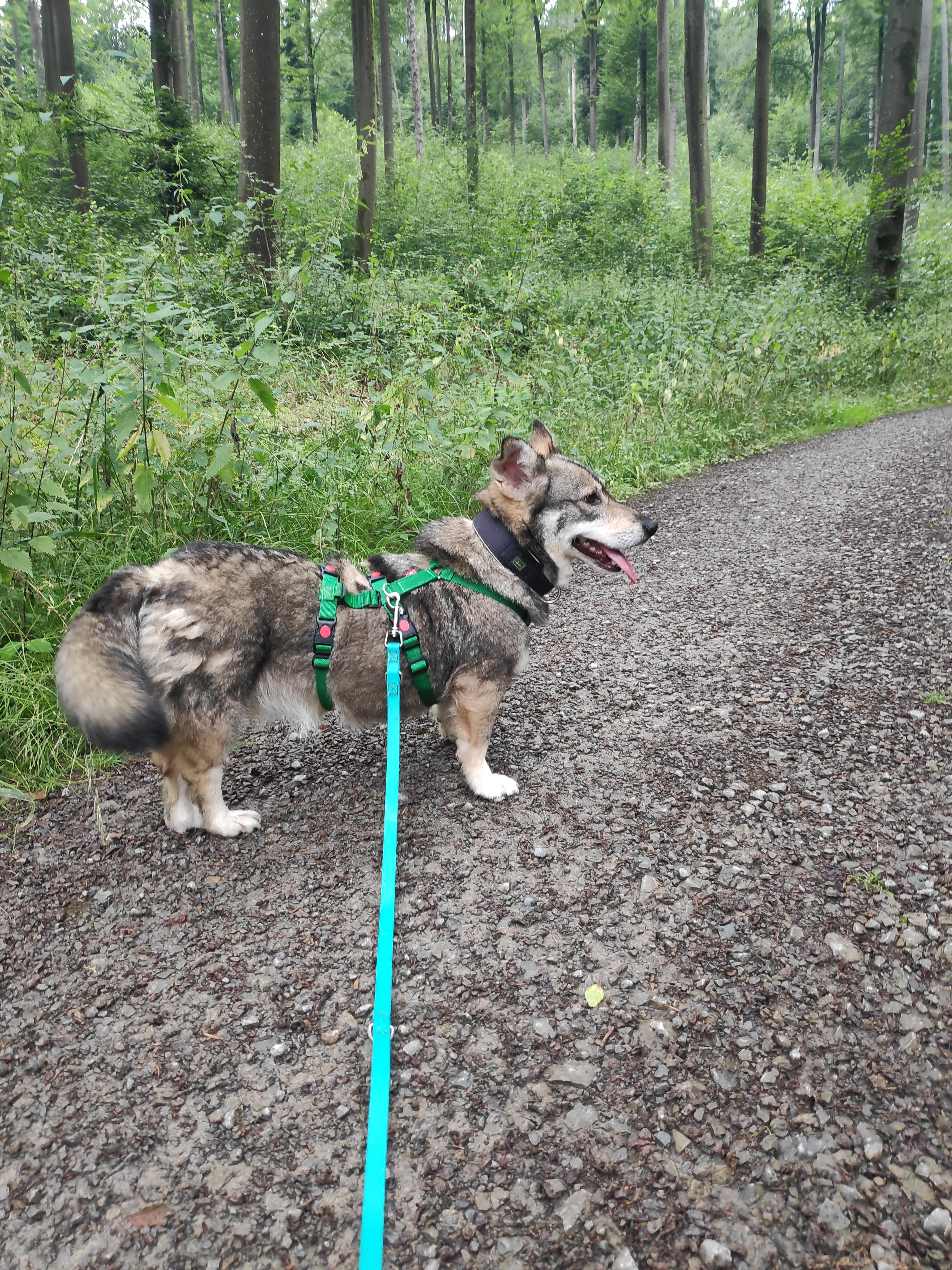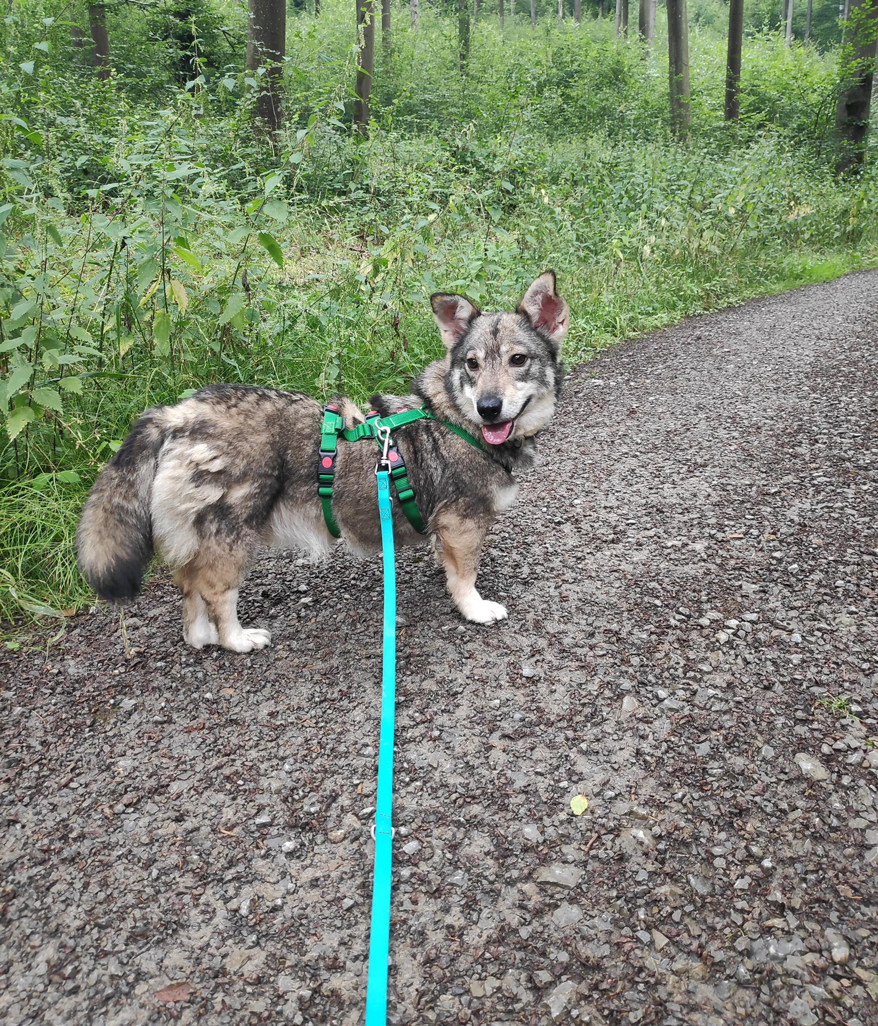 Helga geht gerne spazieren, liegt dann aber auch gerne in ihrem Körbchen.