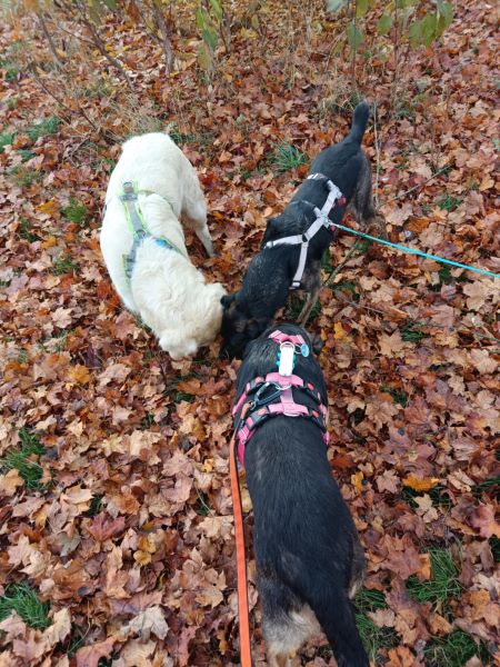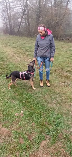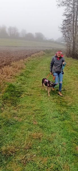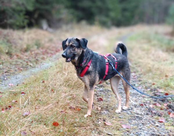 Bei fremden Hundebegegnungen war sie bisher einfach beobachtend und hat sich am Menschen orientiert, auch wenn andere Hunde sie angepöbelt haben, war sie ruhig. Das Gassigehen ist sehr angenehm, da sie immer wieder von sich aus den Kontakt sucht und auch an der Seite läuft.