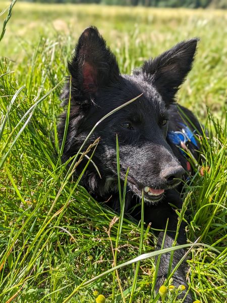 Schnell stellte sich heraus, dass Hughie äußerst klug und pfiffig ist. So hat er sich Kommandos als auch tägliche Abläufe und Verhaltensmuster schnell von den anderen Hunden abgeschaut.