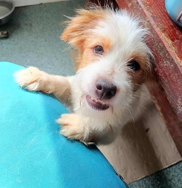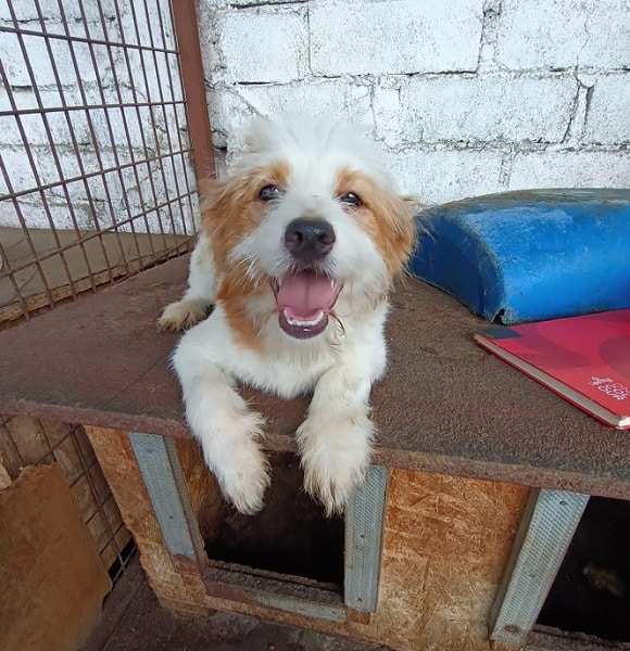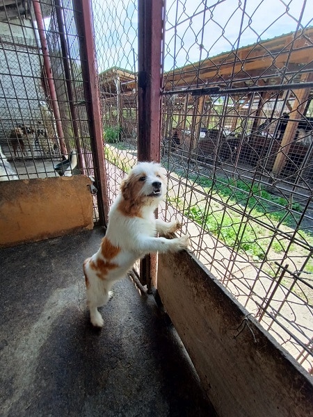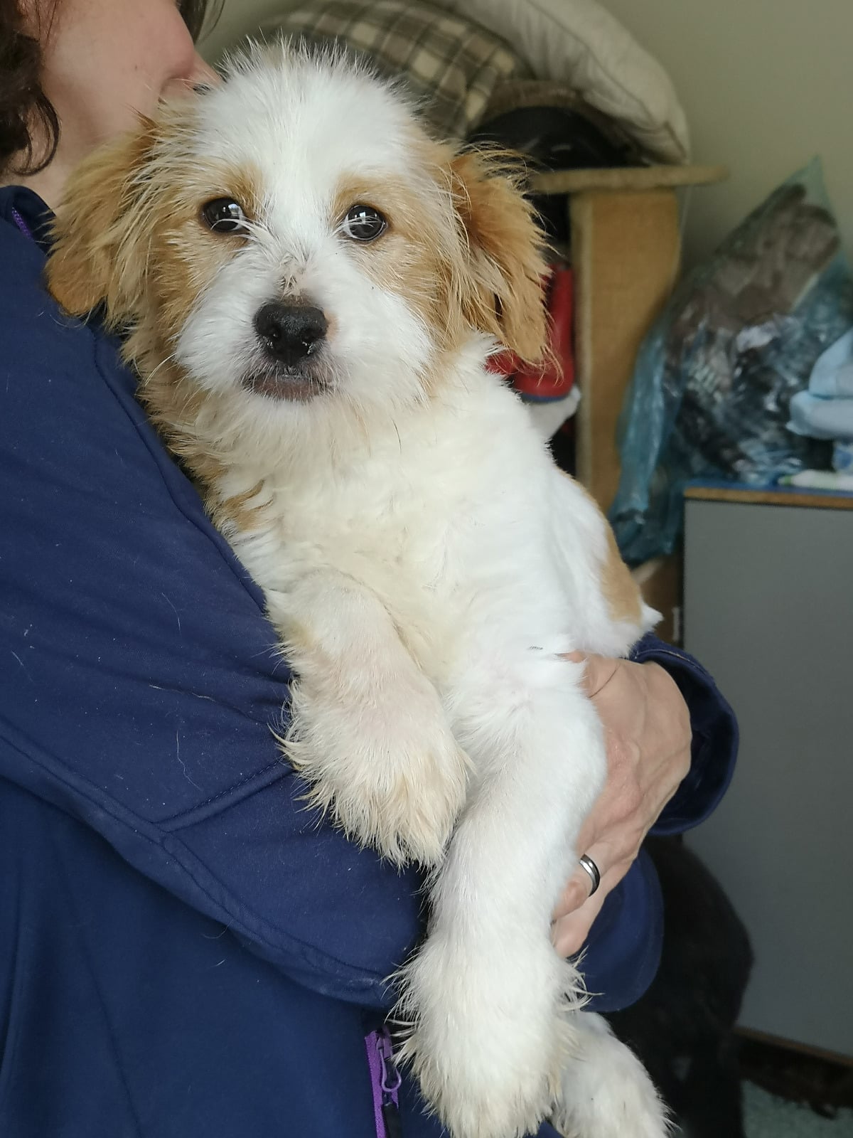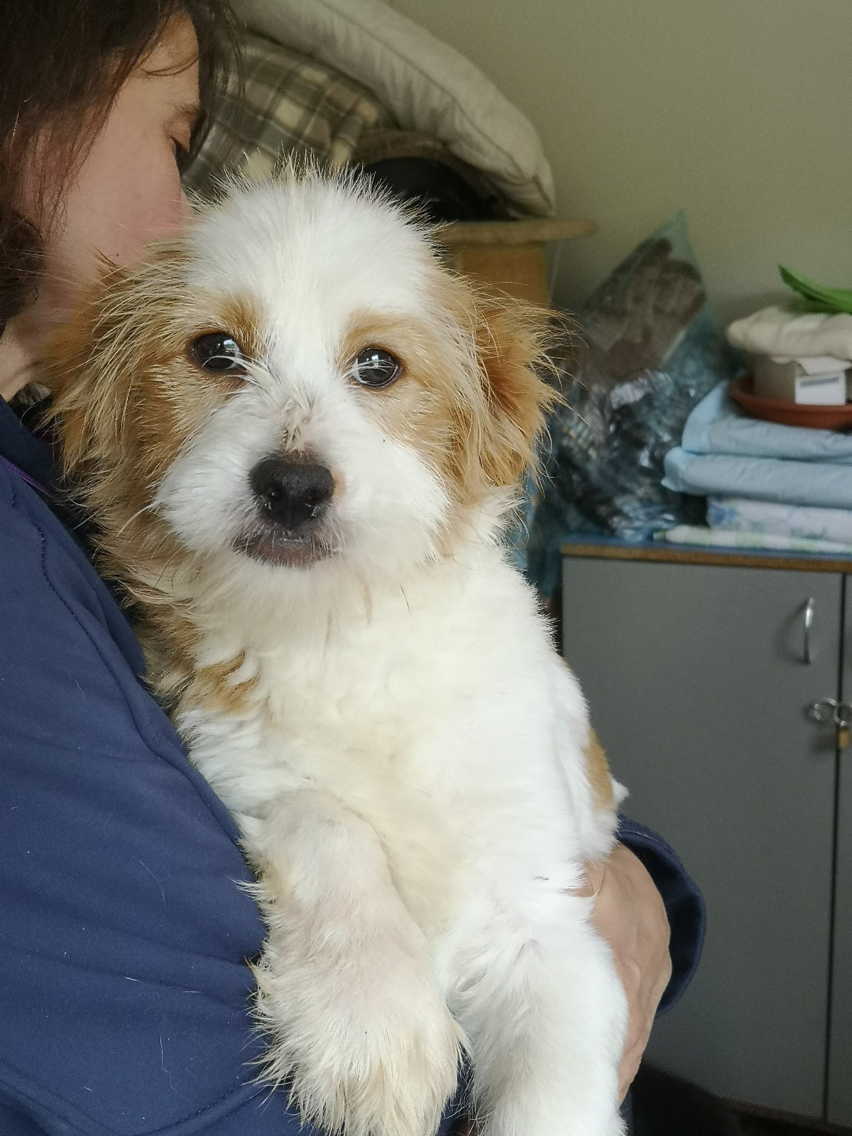 Der sehr süße Kerl wurde von einem Kennel-Kollegen bedrängt, ließ sich aber dadurch nicht aus der Ruhe bringen. Uns gegenüber war er super aufgeschlossen und wollte gern in unserer Nähe sein. Absolut liebenswerter und freundlicher Welpe.