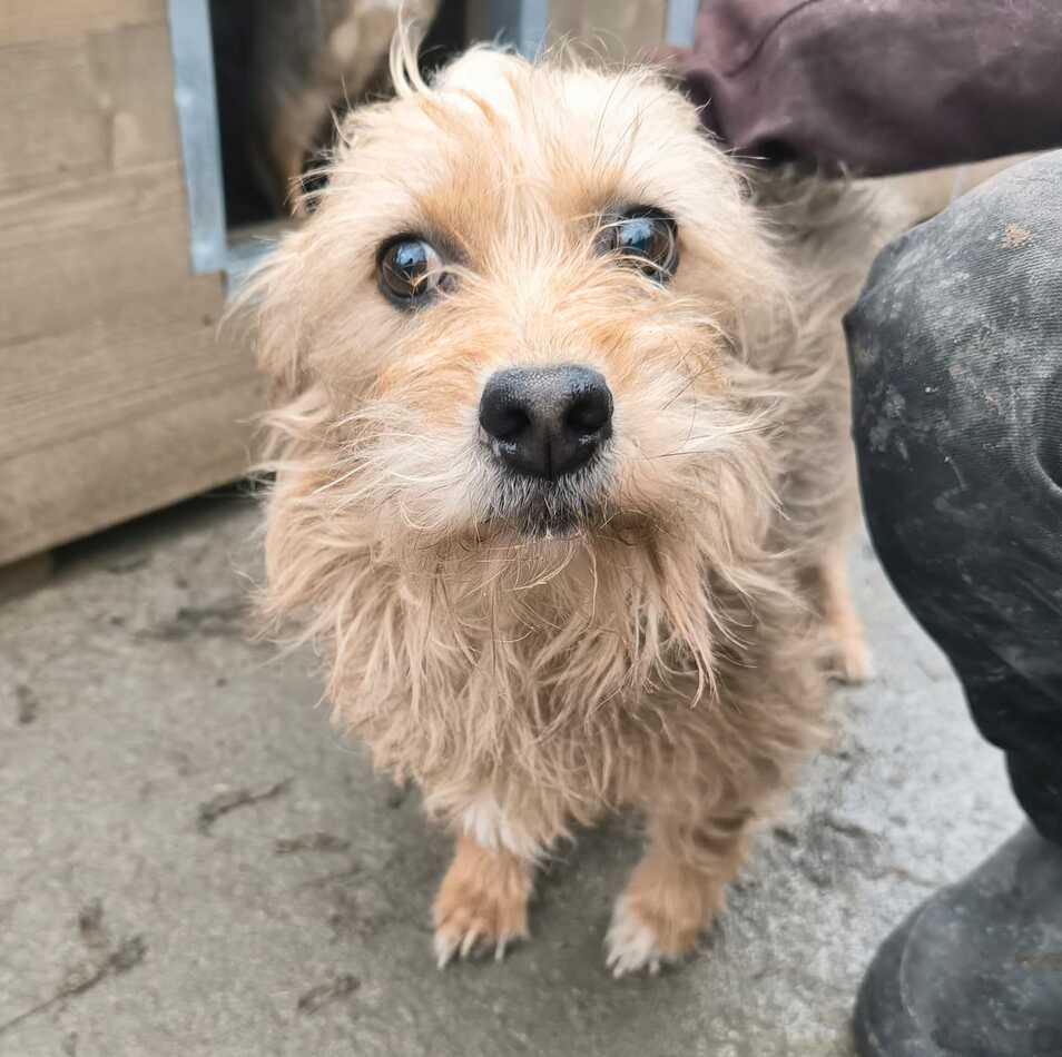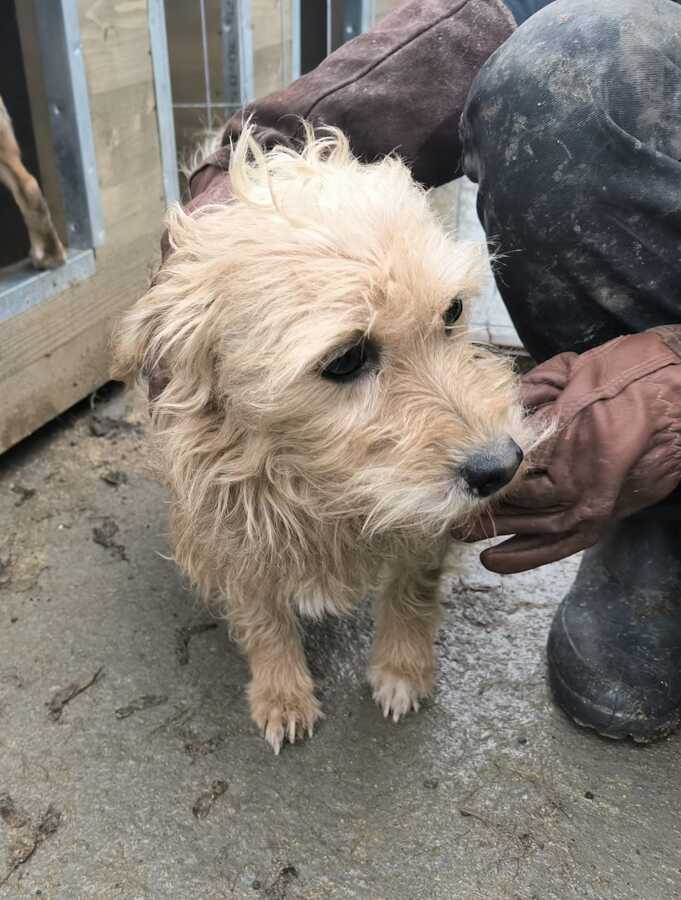 Diese kleine Hündin saß in der Hütte, als wir den Kennel betraten und wollte diese auch nicht verlassen. Als wir versuchten, sie mit der falschen Hand zu streicheln, erschrak sie zunächst, kam dann aber doch aus der Hütte. Hier konnten wir sie streicheln gut überall anfassen. Es war ihr nicht geheuer, aber sie ließ es über sich ergehen.