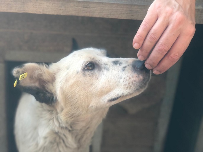 IMPERY saß in der Hütte und nahm gerne unsere Leckerlies aus der Hand. Anfassen lassen wollte er sich aber nicht und bei Bedrängung schnappt er auch.