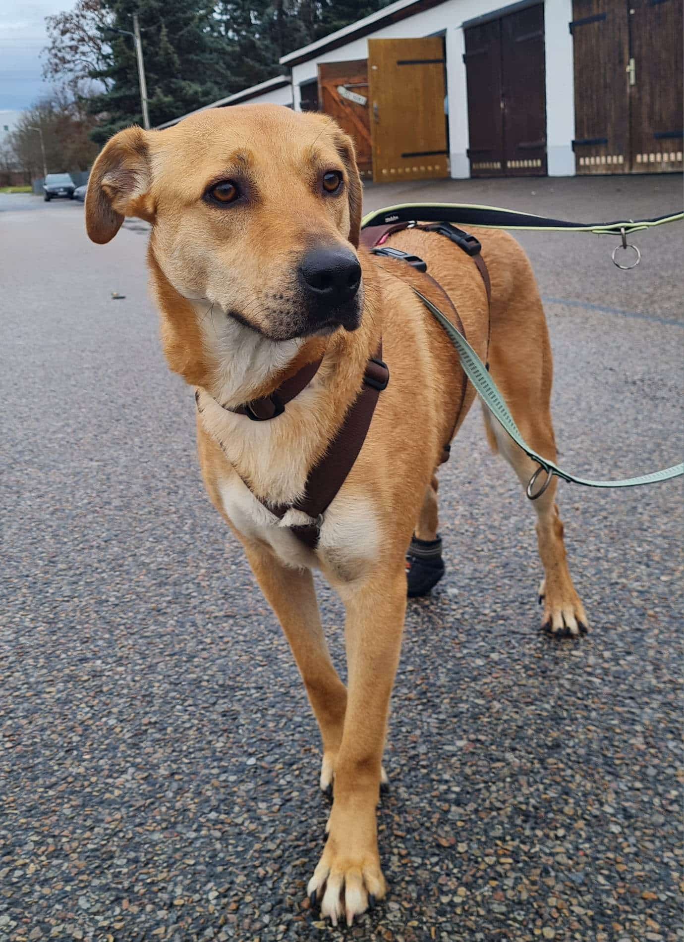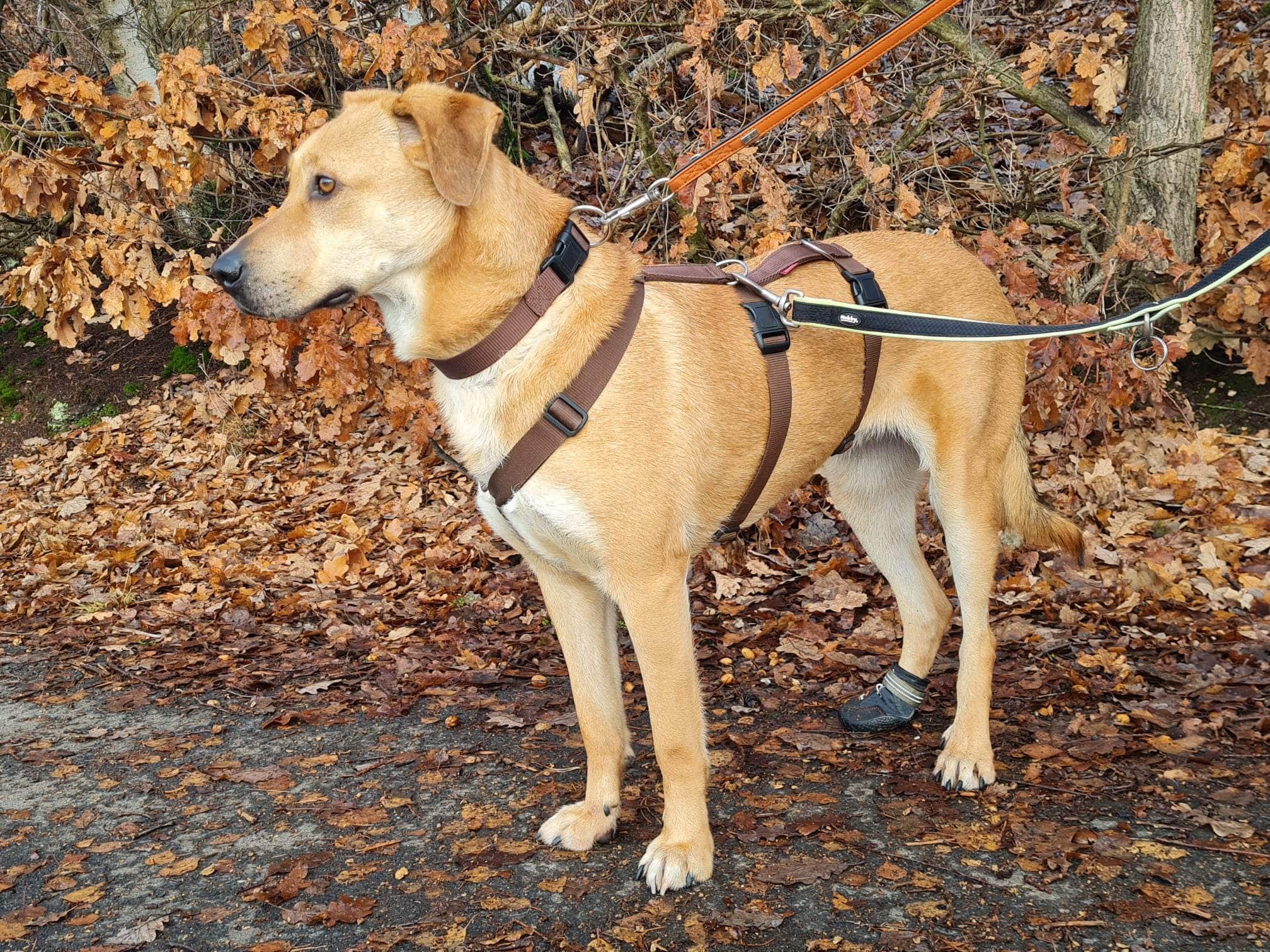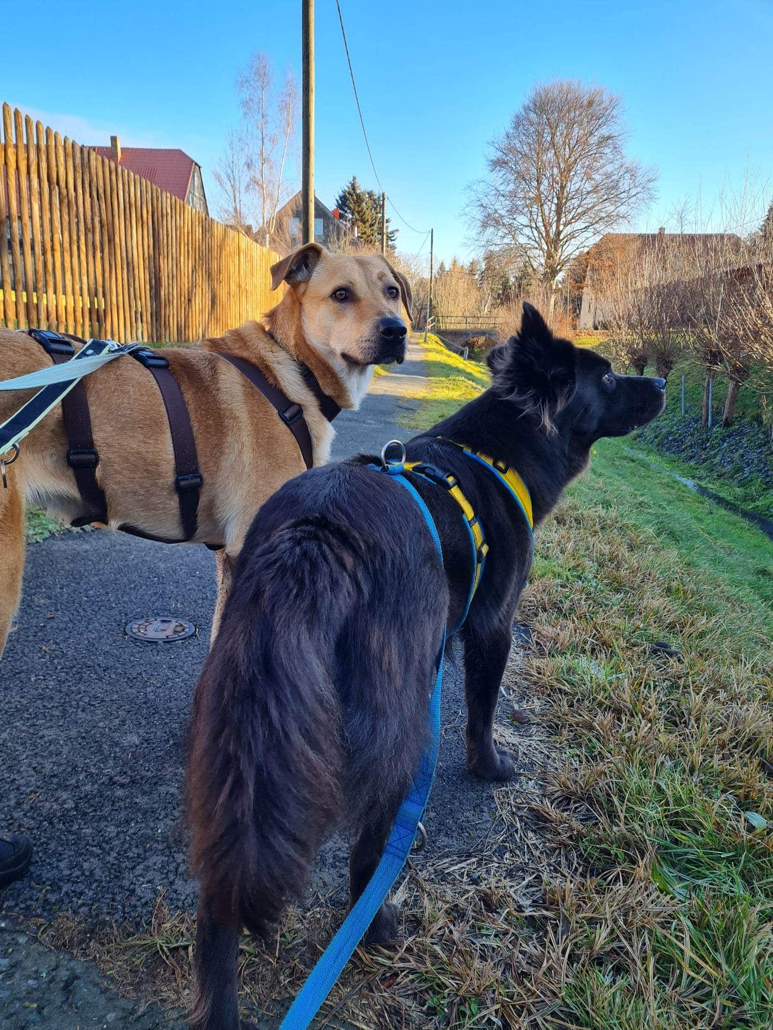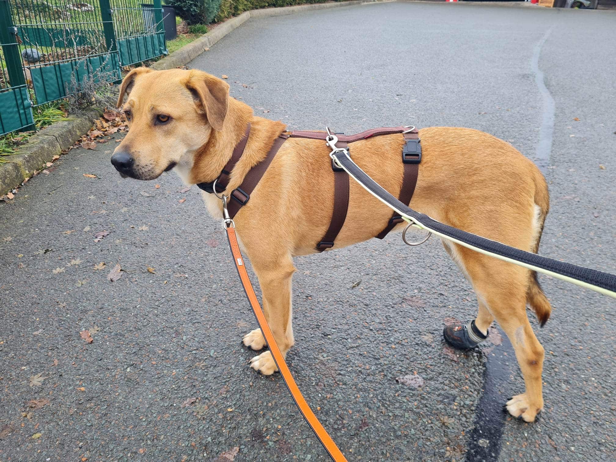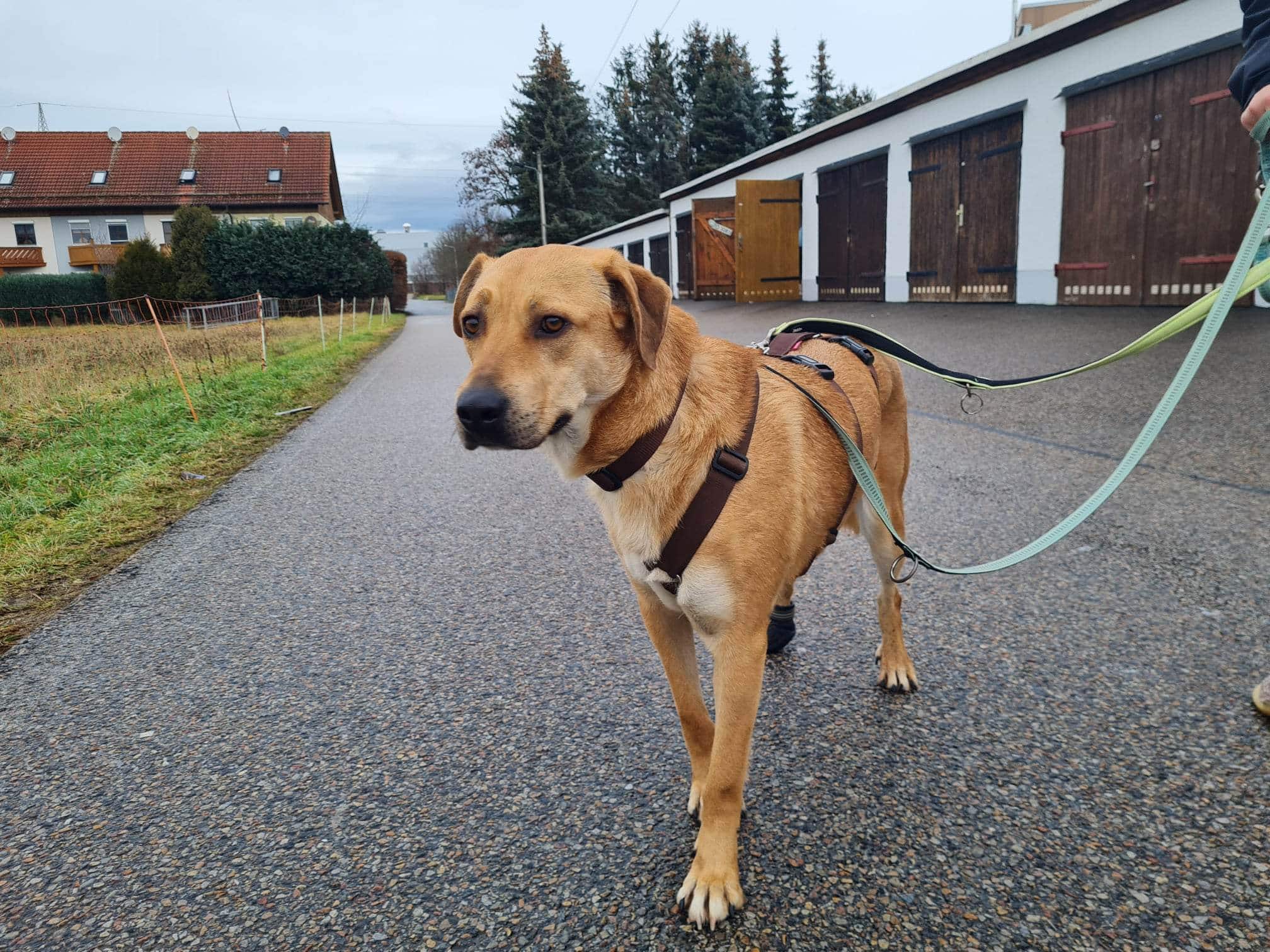 Spaziergänge machen Inara großen Spaß. Sie läuft schon gut an der Leine und gewöhnt sich immer schneller an neue Geräusche oder fremde Dinge, wie Mülltonnen oder LKWs.