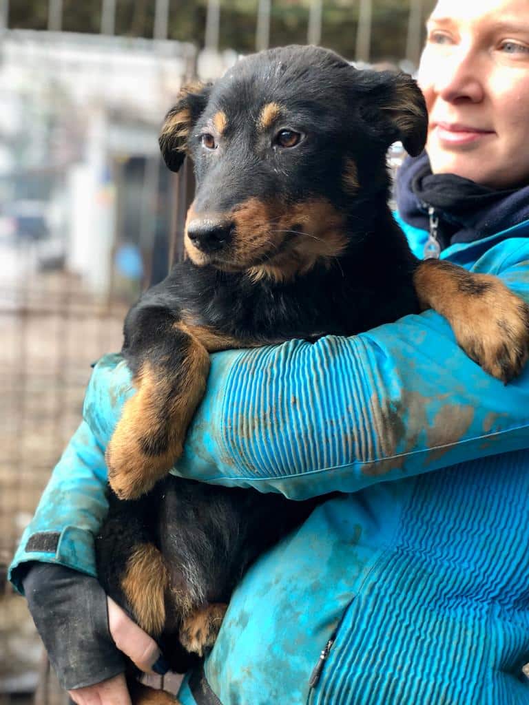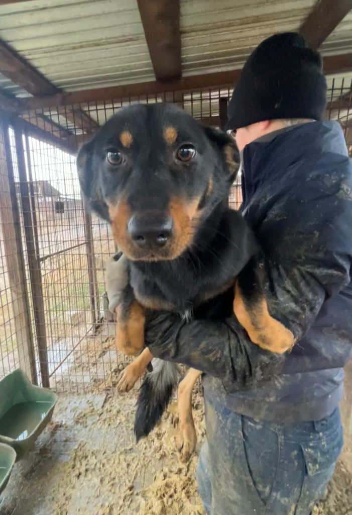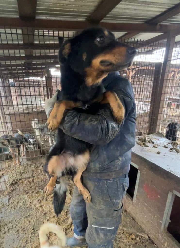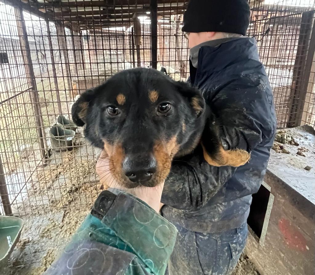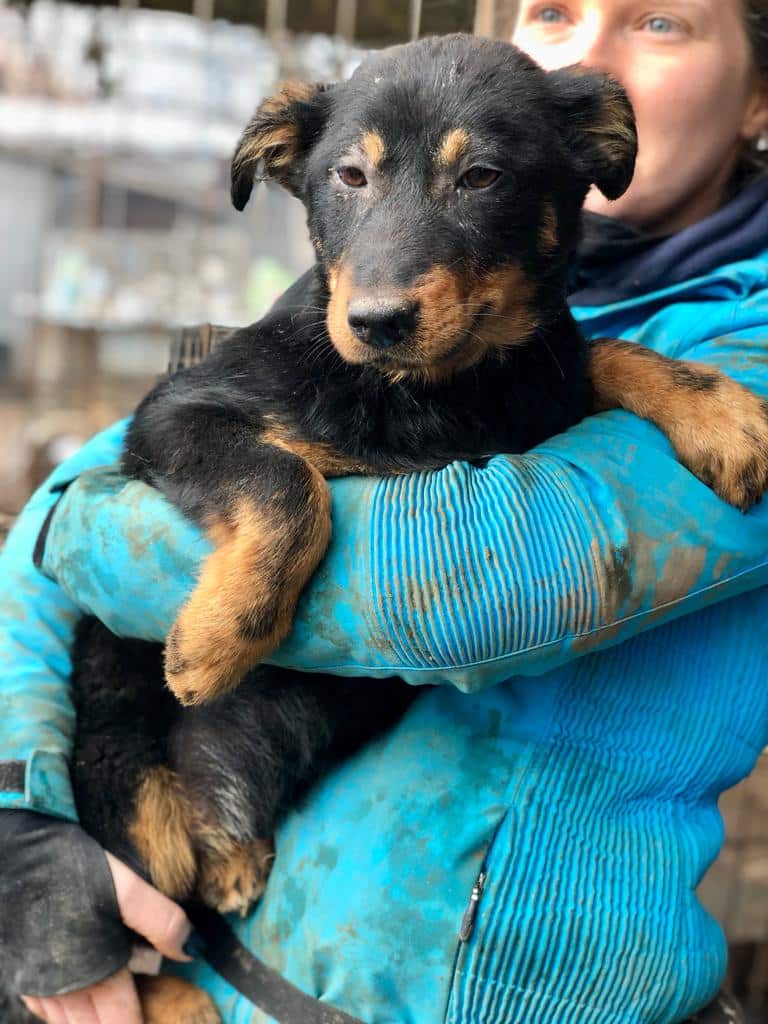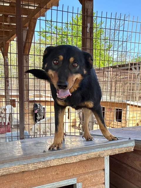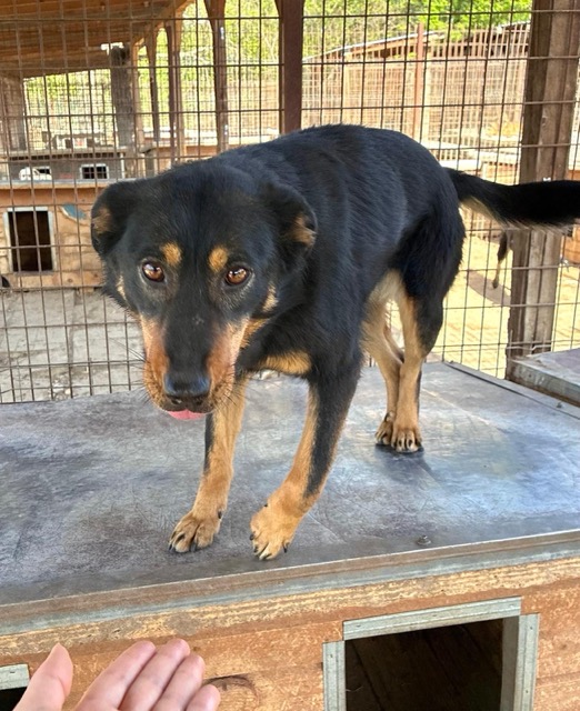 ISABEAU musste nun leider ohne eigene Menschen im Shelter aufwachsen und hat sich etwas schüchtern entwickelt. Als wir den Kennel betraten, war sie zwar sehr interessiert an uns, hielt sich aber stetig auf dem Hüttendach auf und war im direkten Kontakt unsicher, wie sie sich uns gegenüber richtig verhalten soll. Sie ließ sich aber problemlos auf den Arm heben und überall anfassen. Als wir sie wieder auf dem Hüttendach absetzten, war sie mit der Situation etwas überfordert. Wir hoffen sehr, dass ISABEAU nun endlich die Chance auf ein gutes Leben bekommt.