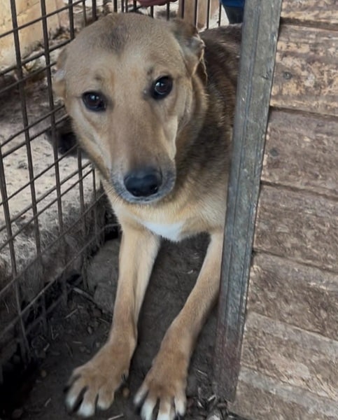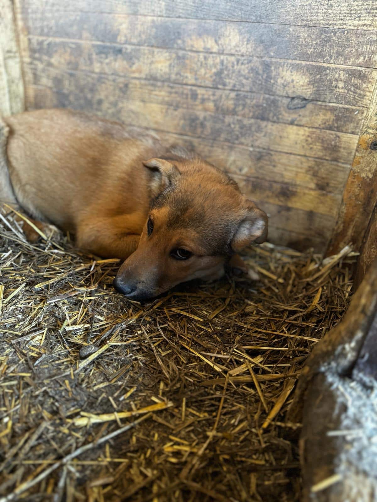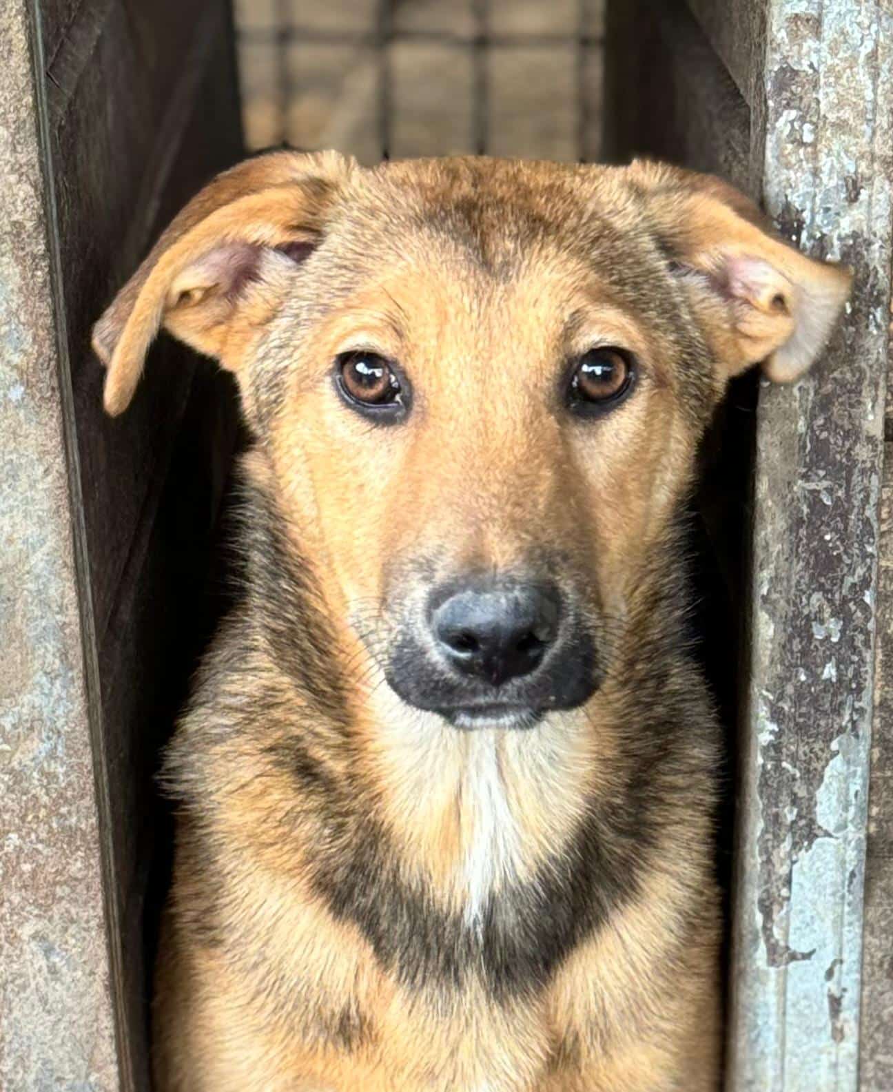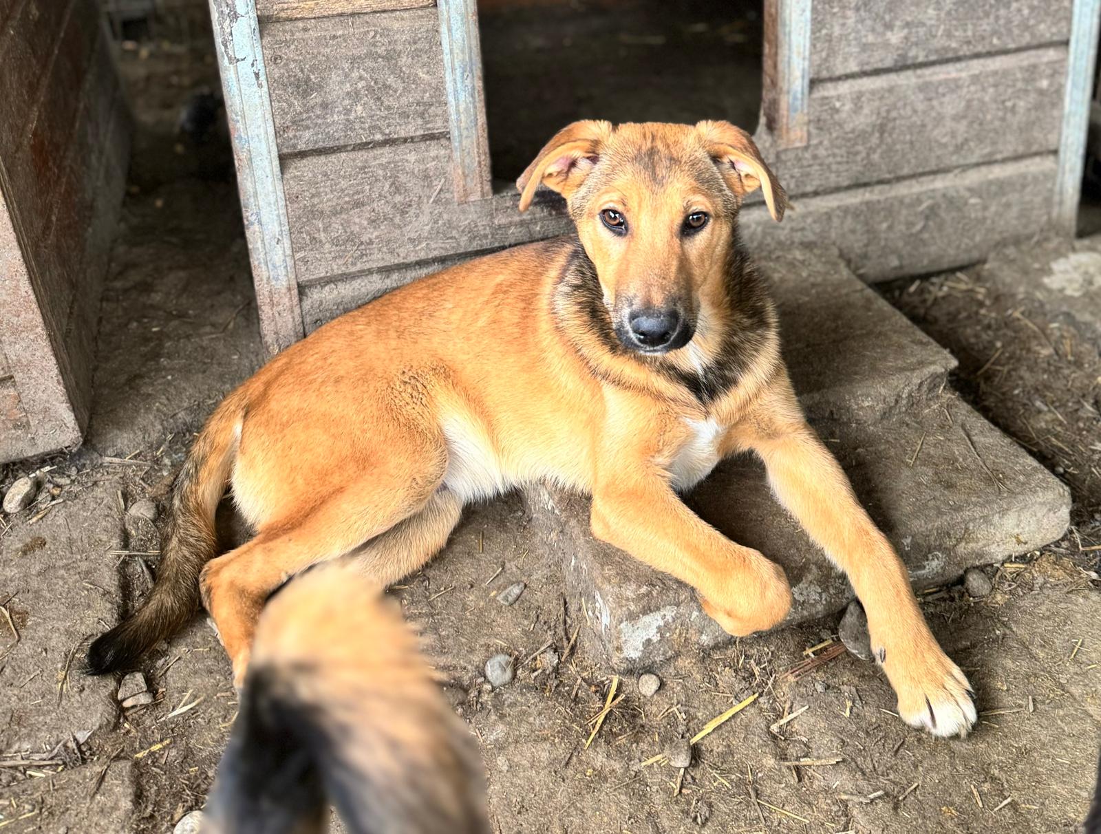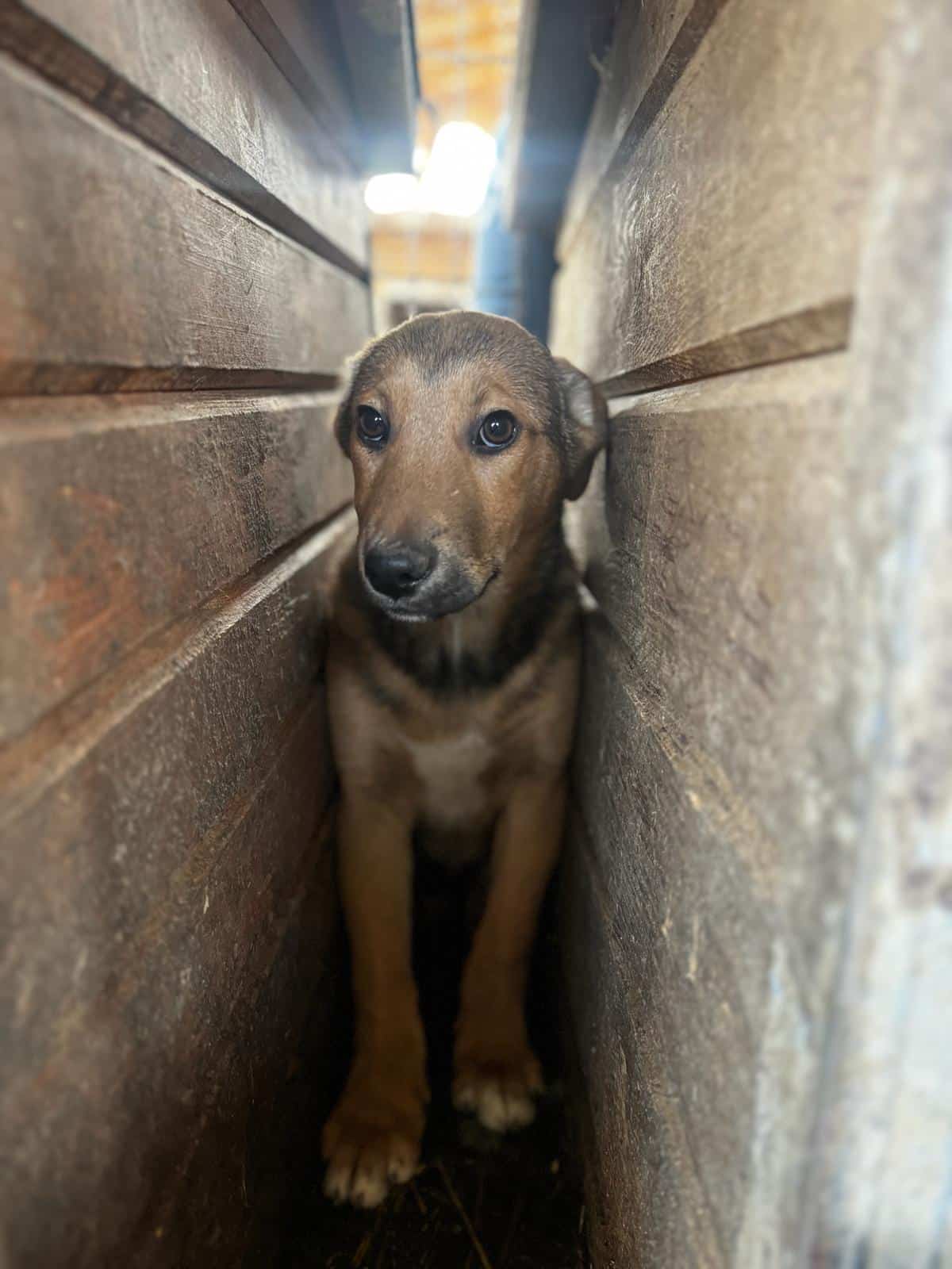 Dieser hübsche Rüde saß mit seinen Geschwistern beim Betreten des Kennels in seiner Hütte. Er ist sehr beeindruckt vom Shelteralltag, ließ sich zu Anfang jedoch vorsichtig in der Hütte streicheln. Als wir ihn hochnehmen wollte, wich er aus und versteckte sich hinter der Hütte. Dort ließ er sich auch nicht mehr herauslocken und schnappte bei größerer Bedrängung. In einer ruhigeren und entspannteren Umgebung würde er sicherlich Vertrauen zum Menschen aufbauen können, doch er muss nun schnellstens ausreisen! Auch braucht er die Hilfe souveräner Artgenossen.