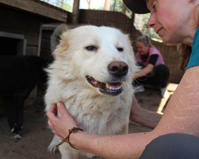Die hübsche IVORY mit dem tollen, flauschig-weichen Eisbärfell zeigte sich bei unserem Besuch freundlich und interessiert. Aufgrund ihrer Beschreibung haben wir sie zu keiner Zeit bedrängt, sondern sie stets selbst die Nähe zu uns suchen lassen, was sie auch tat. Gern ließ sie sich streicheln und genoss den kurzen Moment der Zuwendung im sonst so tristen Shelter-Alltag. Für die tolle IVORY, der ihr rechtes Ohr fehlt, suchen wir erfahrene und liebevolle Menschen, die ihre Hundesprache zu verstehen wissen und sie für ihren Charakter lieben. Ihre niedliche kurze Rute wedelte unentwegt und sie zeigte sich souverän und verträglich im Umgang mit den anderen Hunden. So sehr wünschen wir uns für die niedliche IVORY, dass sie schon bald auf der Sonnenseite ein glückliches Hundeleben in Geborgenheit führen darf.