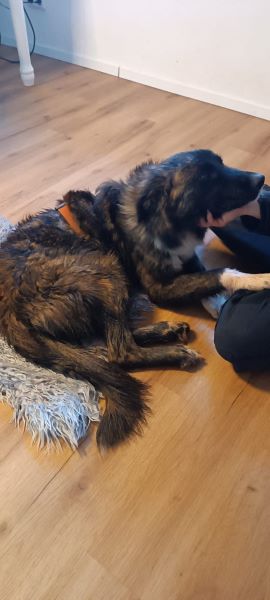 Izzy ist weitestgehend stubenrein und kann auch schon im Rudel allein bleiben.