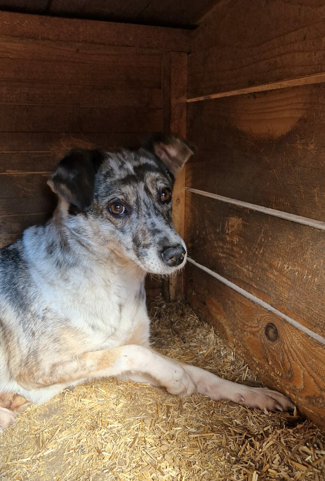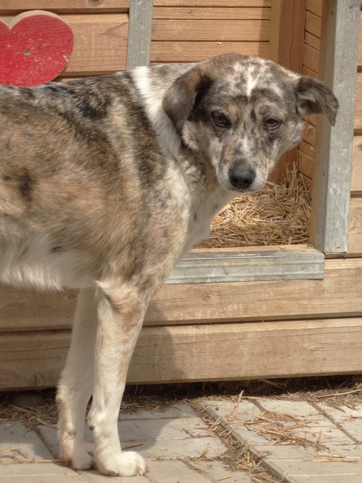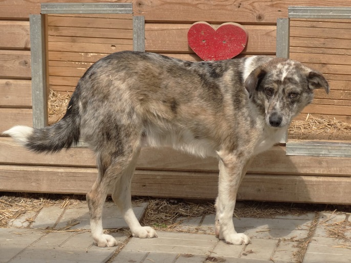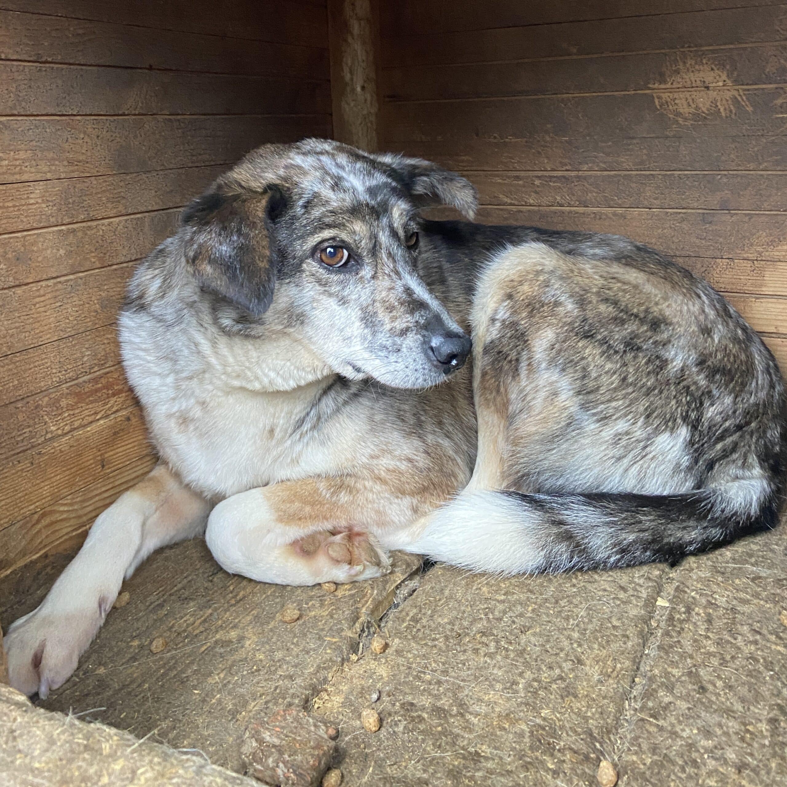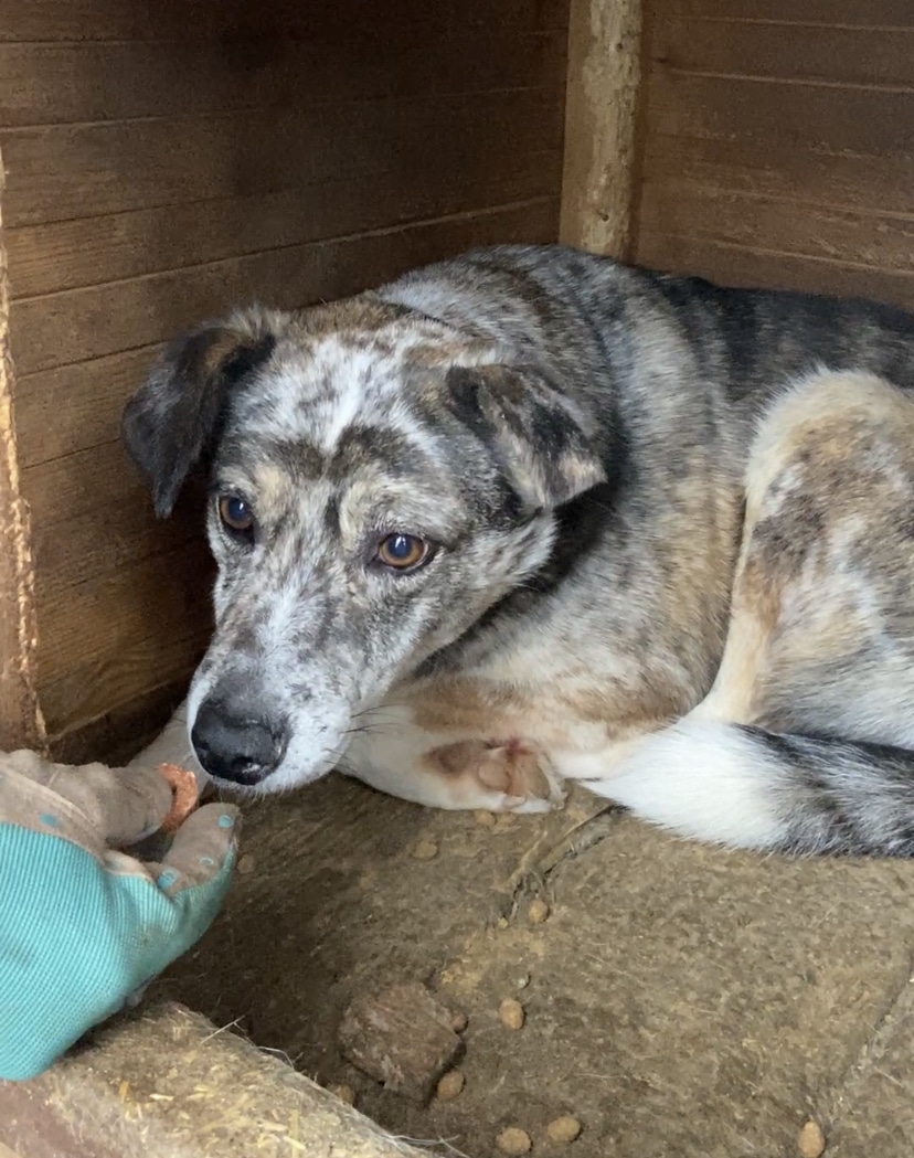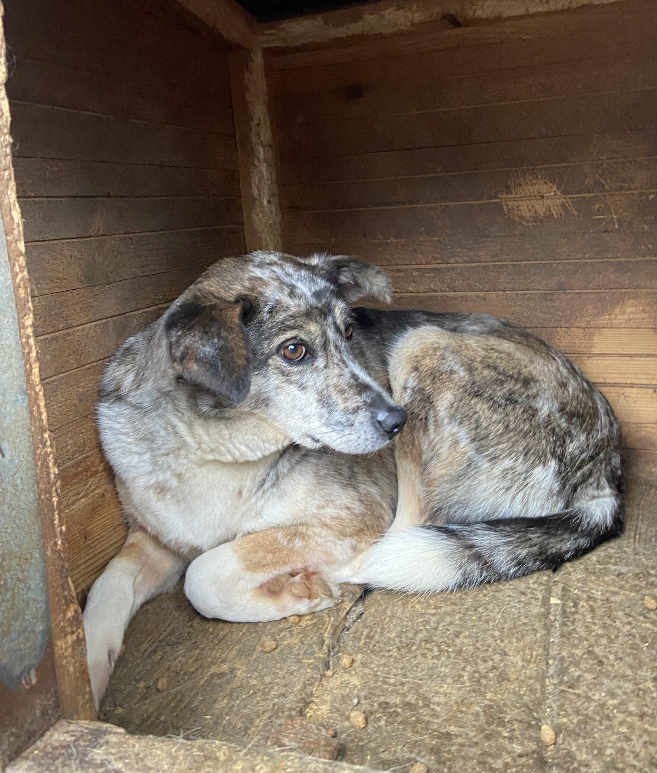 Der mittlerweile 7 Jahre alte und wunderschöne JACKSON hat sich diesmal getraut unsere Leckerlie vom Boden zu nehmen, auch wenn man ihm die Unsicherheit anmerkte und er den Schutz der Hütte brauchte. Er ist sehr unsicher und möchte auch nicht bedrängt werden, dies äußert er auch mit einem Warnknurren. Aktuell lebt er mit Rüden im Kennel, was gut funktioniert. Wir schätzen ihn als verträglich ein. Ein souveräner Ersthund würde ihm definitiv die Eingewöhnung erleichtern. JACKSON sucht Menschen mit sehr viel Erfahrung im Umgang mit unsicheren Hunden.