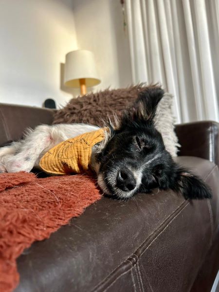 Genauso gerne liegt Jaff dicht neben seinen Menschen angekuschelt auf dem Sofa, besonders abends hat sich das für ihn zu einem festen Ritual entwickelt und generell hat er kein Problem damit mal einen Tag die Krankenbegleitung auf dem Sofa zu spielen.