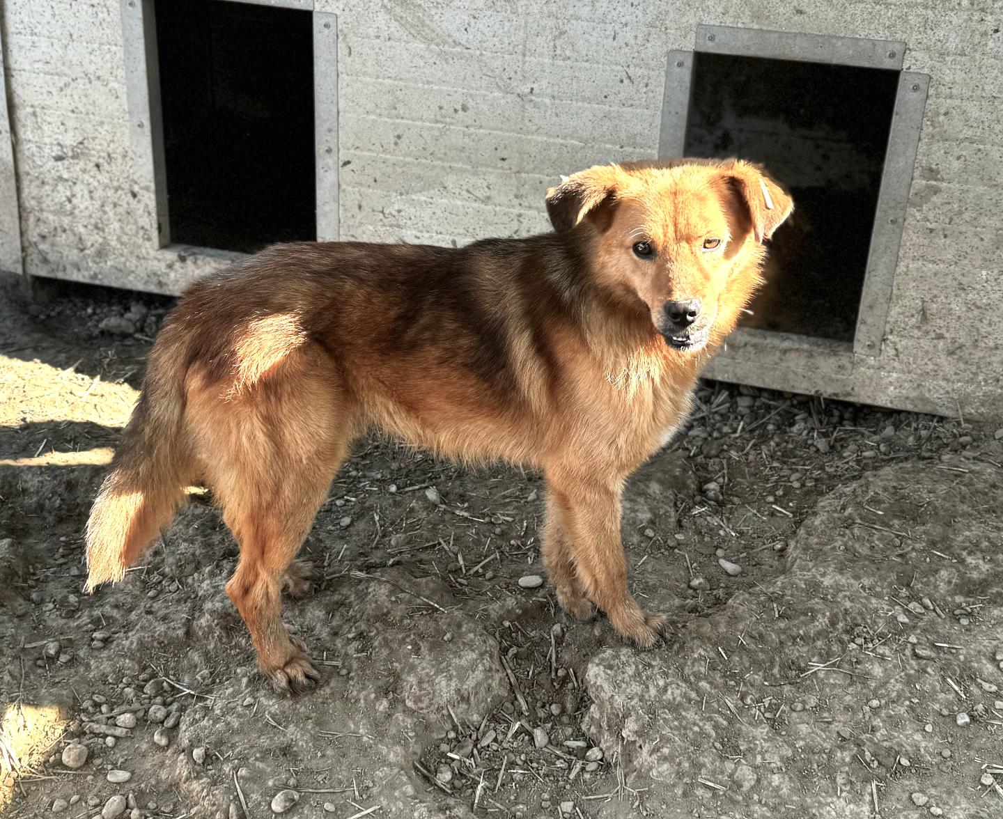 JAKOB lebt mit mehreren Hunden im Kennel und scheint mit ihnen verträglich zu sein.