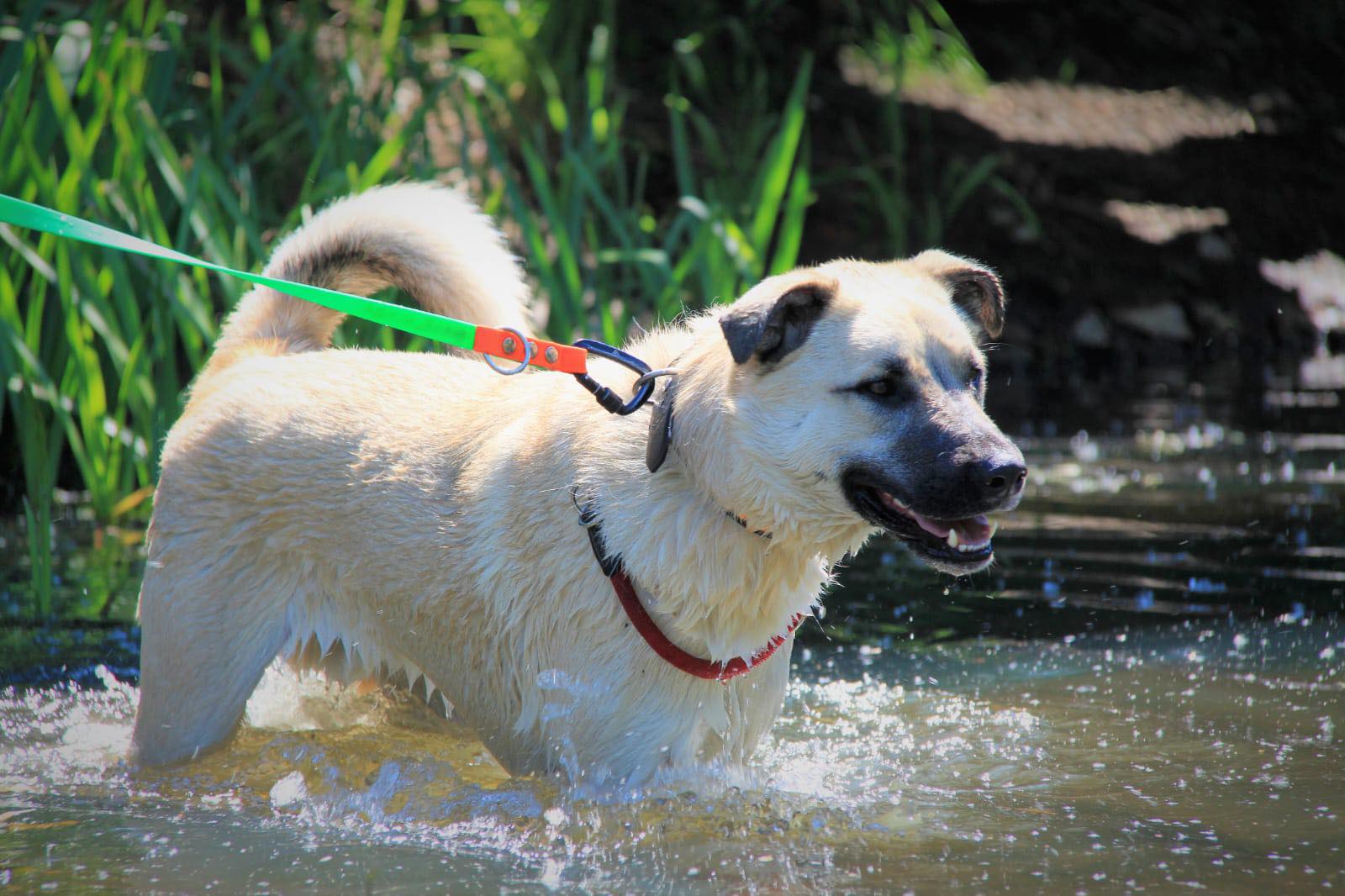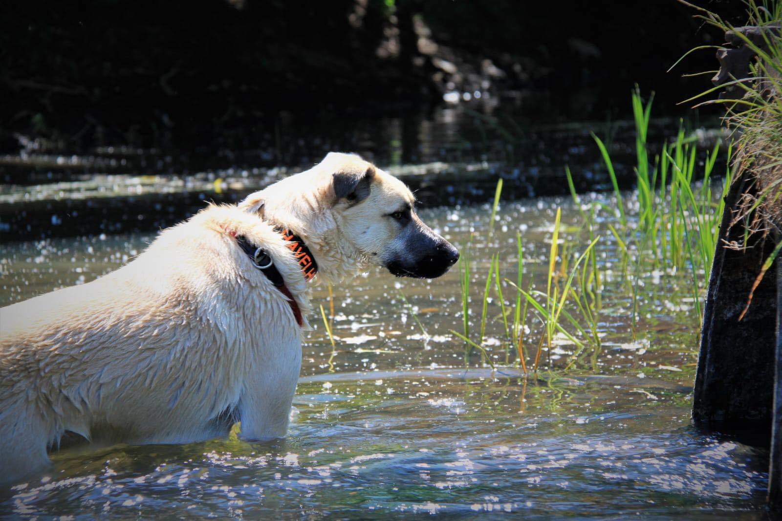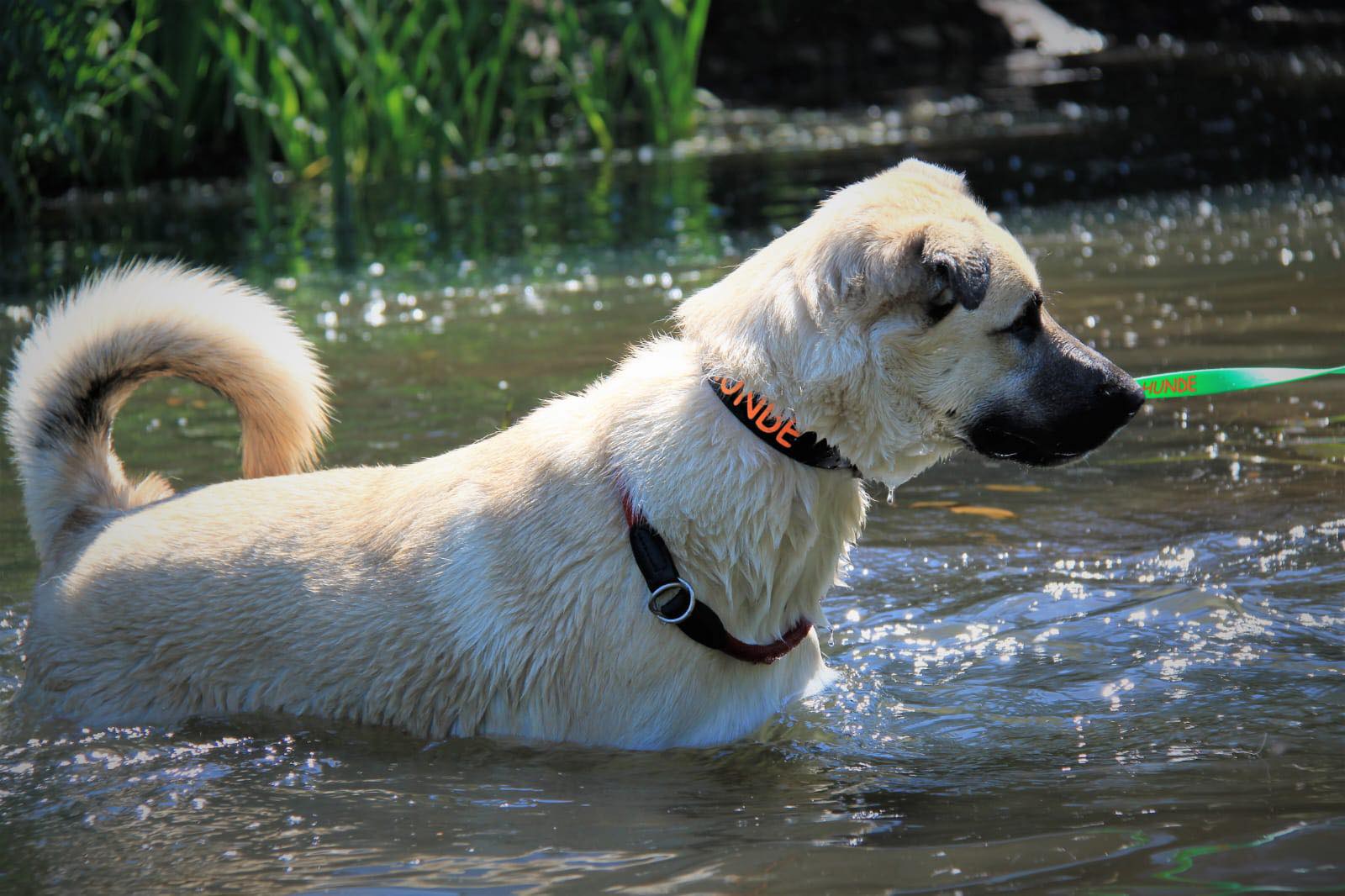 Auch außerhalb des Grundstückes merkt man ihm den Herdenschutzhund so manches mal an. In Hundebegegnungen würde er manchmal gern pöbeln gehen und vielleicht sogar mehr. Wenn man ihm aber glaubhaft versichert , dass man das nicht möchte , lässt er sich ganz artig vorbei führen. Er läuft hier stets ohne Leine und wird nur bei Hundebegegnungen angeleint.