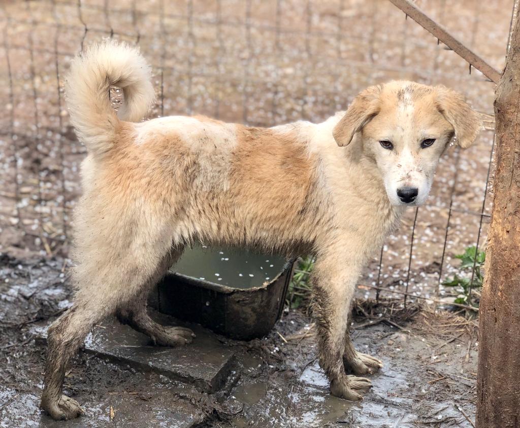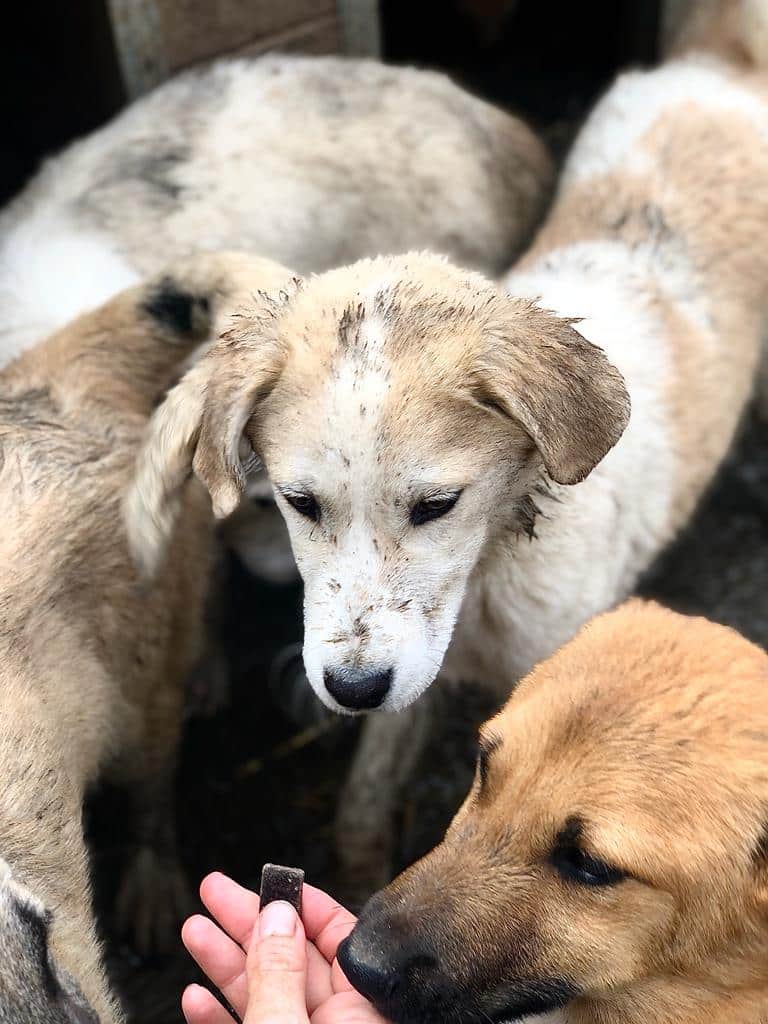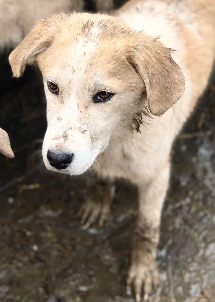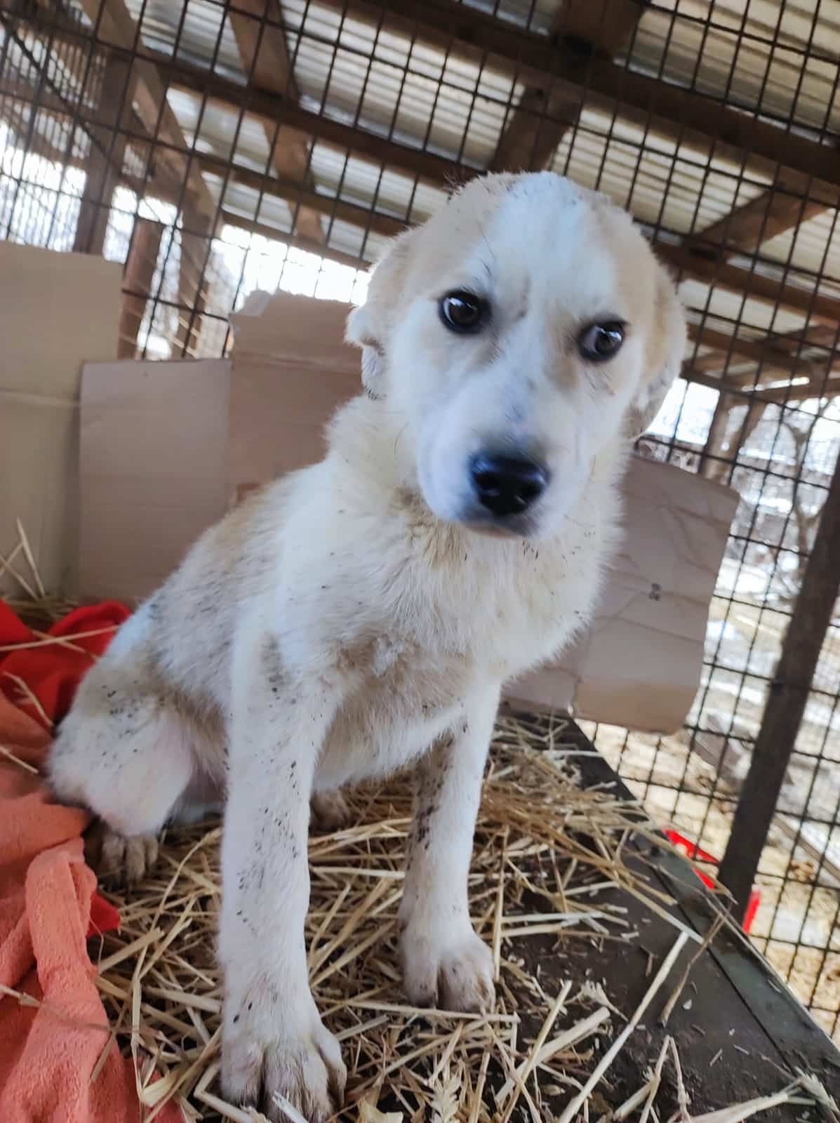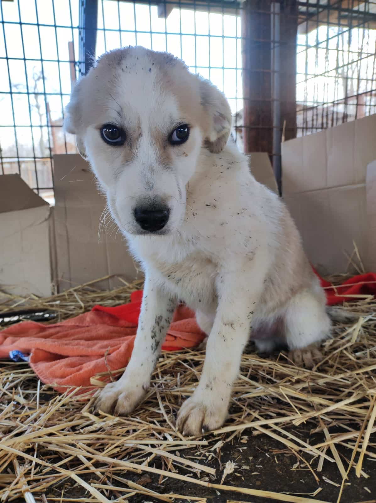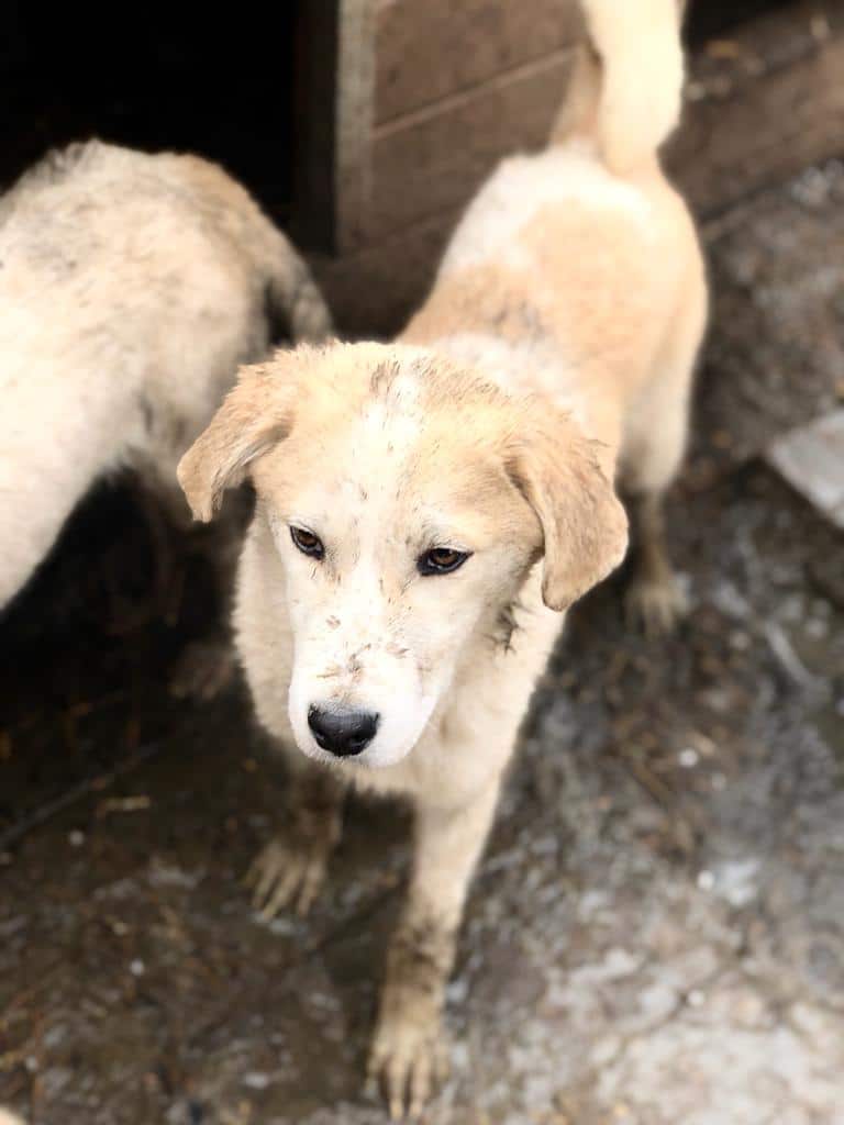 Wenige Wochen können bei Welpen und Junghunden so viel verändern – JINPA blieb diesmal lieber in der zweiten Reihe und beobachtete uns neugierig. Hier macht sich der fehlende menschliche Kontakt schon spürbar. Hochnehmen lassen wollte er sich nicht und zeigte erstes Abwehrverhalten. Wir hoffen, dass dieser bildhübsche Rüde die Möglichkeit erhält, zeitnah ausreisen zu dürfen. In einer ruhigeren Umgebung wird er sicherlich schnell auftauen.