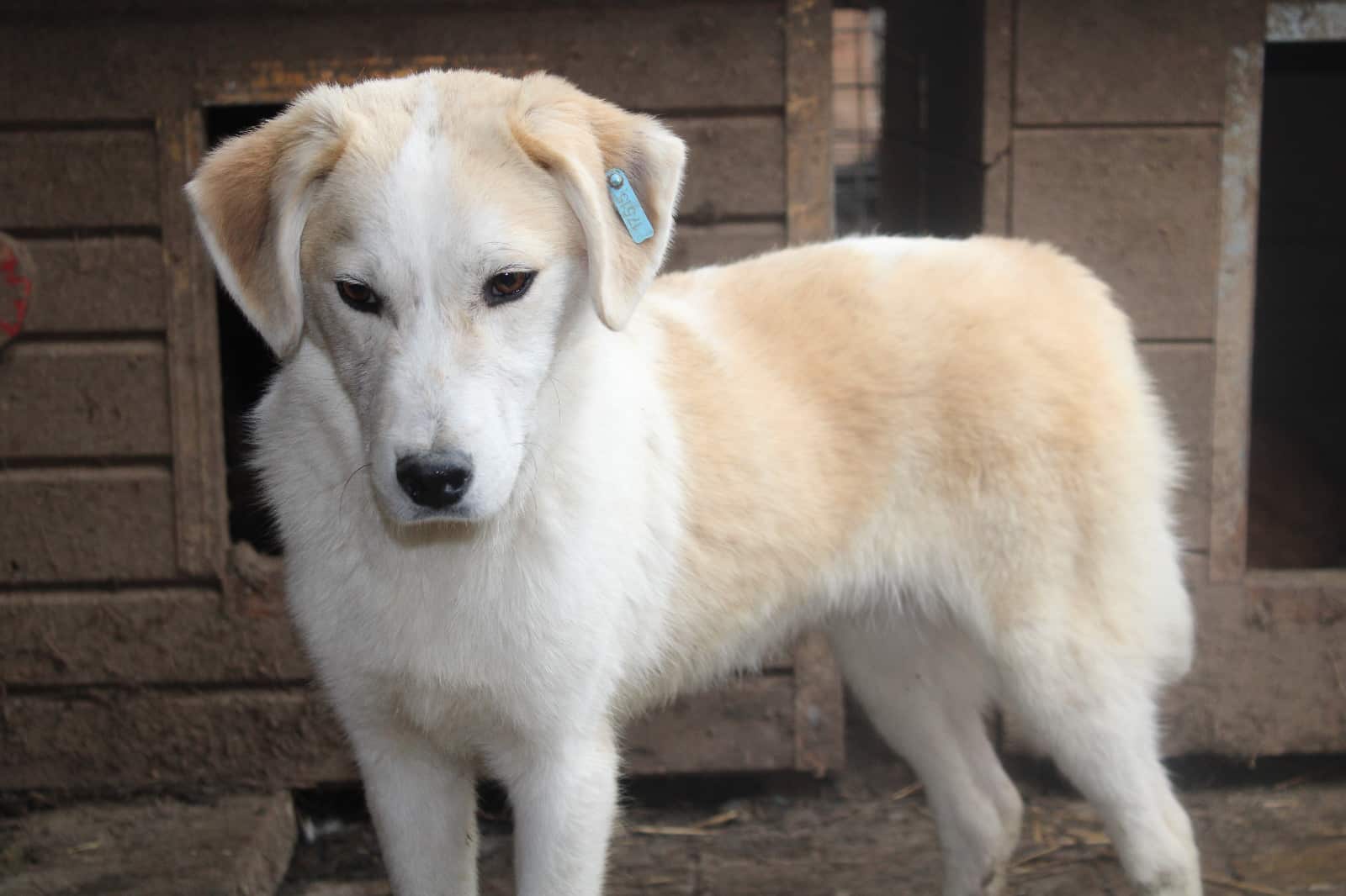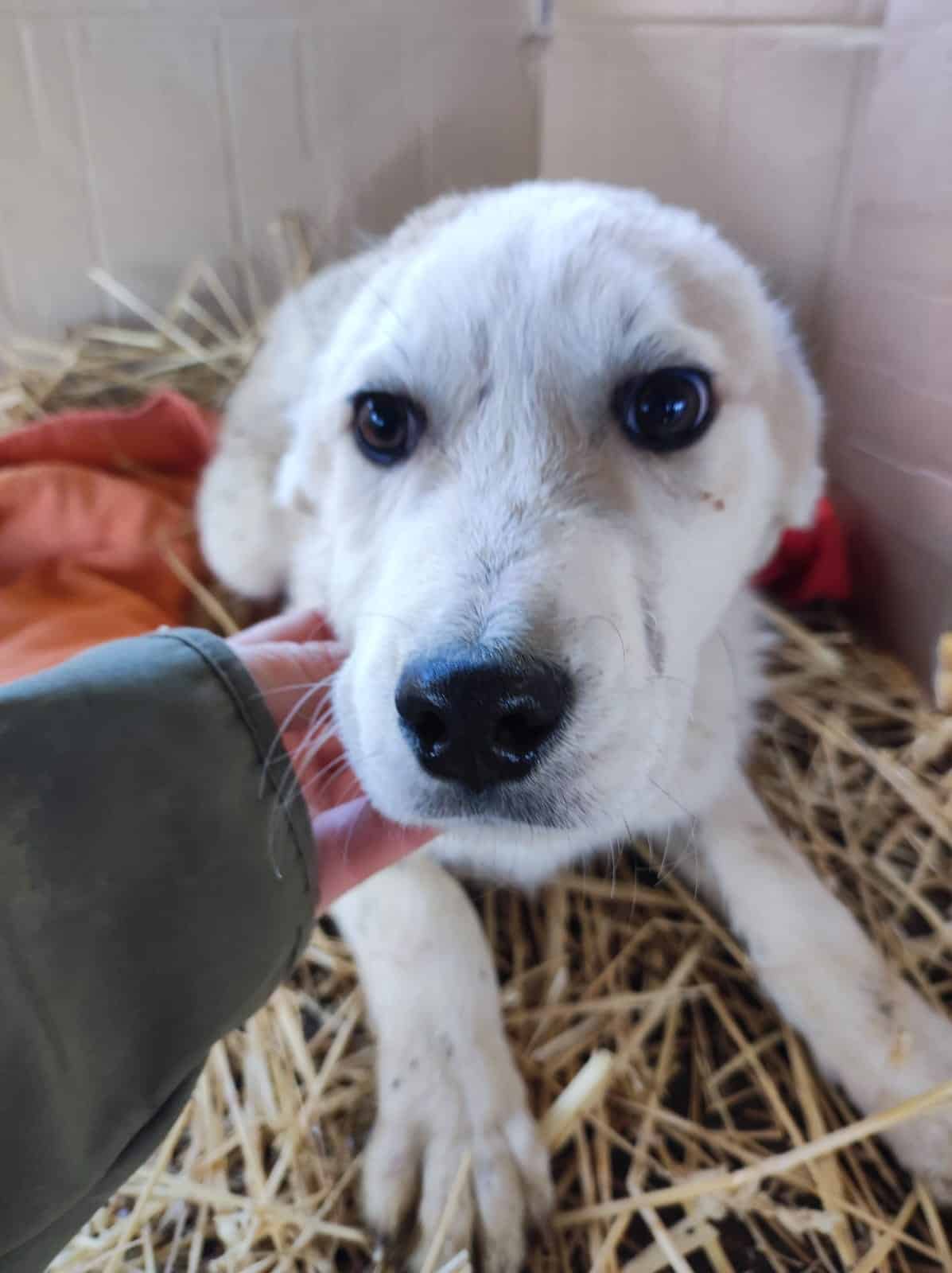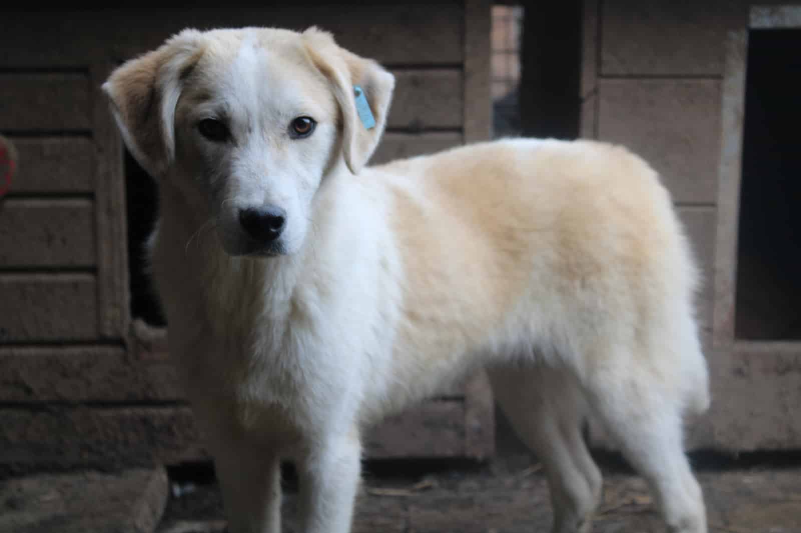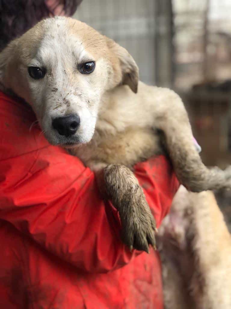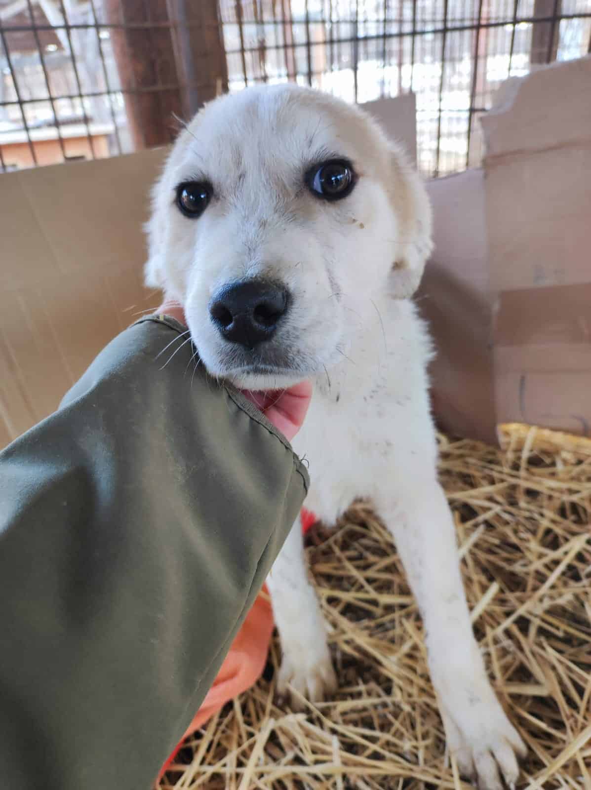 Wenige Wochen können bei Welpen und Junghunden so viel verändern – JINPA blieb diesmal lieber in der zweiten Reihe und beobachtete uns neugierig. Hier macht sich der fehlende menschliche Kontakt schon spürbar. Hochnehmen lassen wollte er sich nicht und zeigte erstes Abwehrverhalten. Wir hoffen, dass dieser bildhübsche Rüde die Möglichkeit erhält, zeitnah ausreisen zu dürfen. In einer ruhigeren Umgebung wird er sicherlich schnell auftauen.