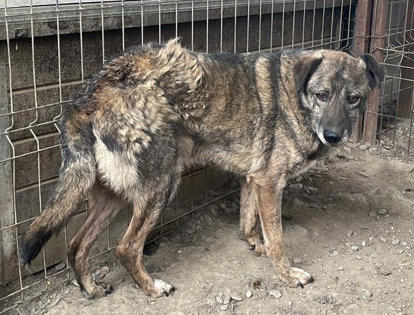 Wir konnten nun auch sehen, dass er überhaupt keine Muskulatur in der Hinterhand mehr hat. Hier müsste in einem eigenen Zuhause langsam wieder Muskulatur auftrainiert werden.