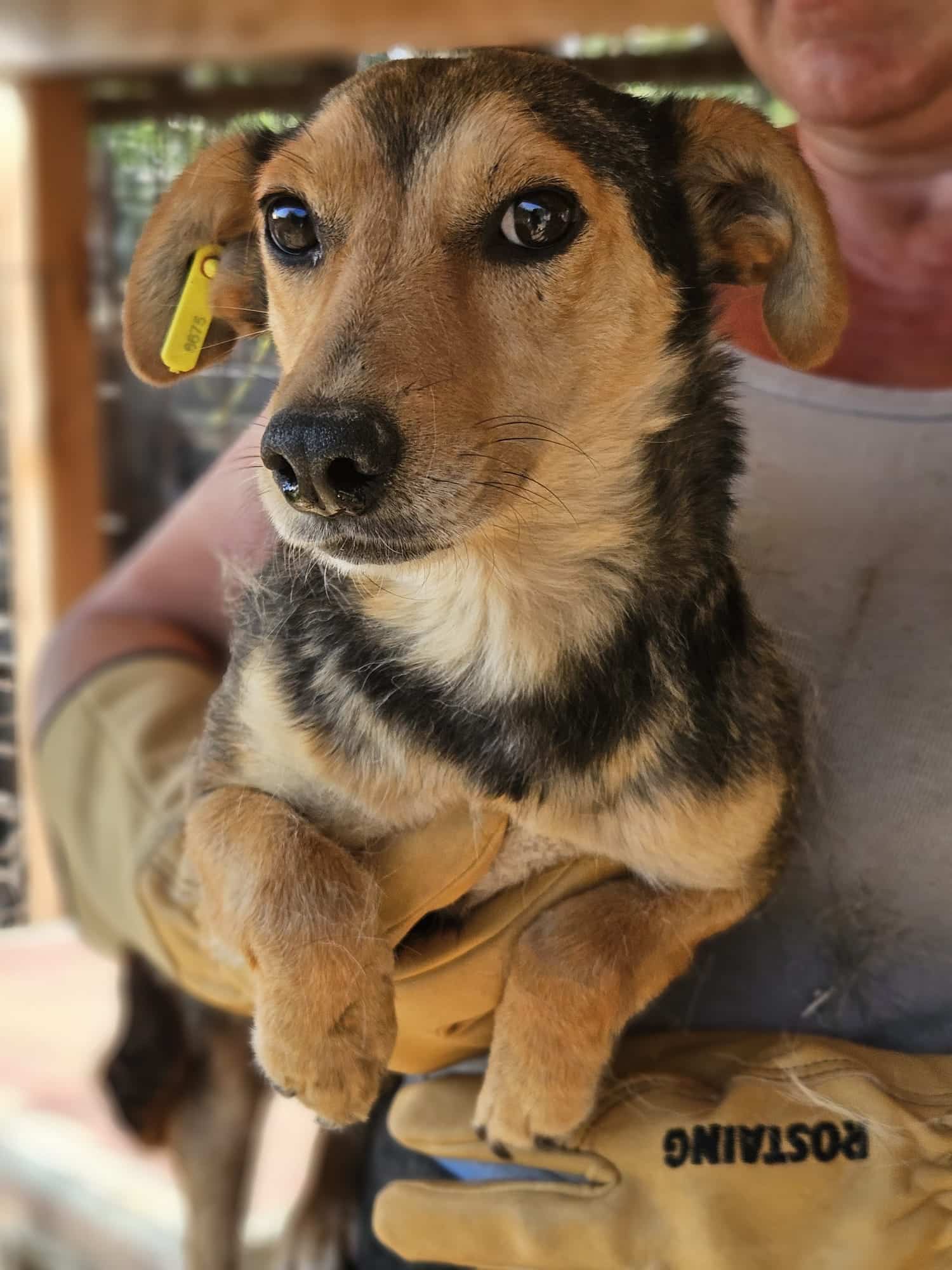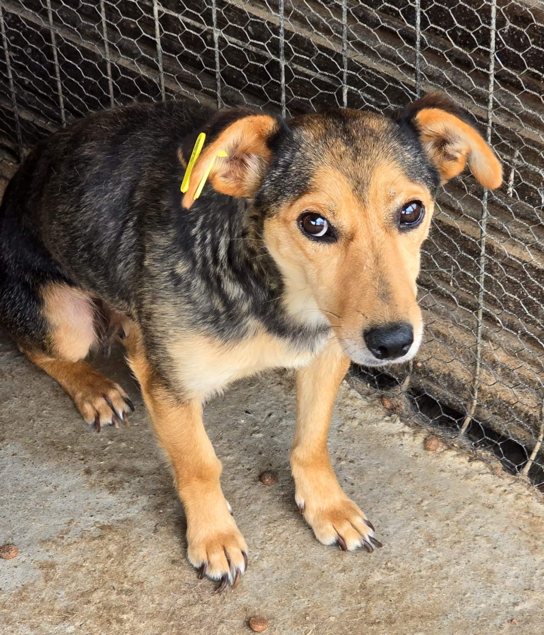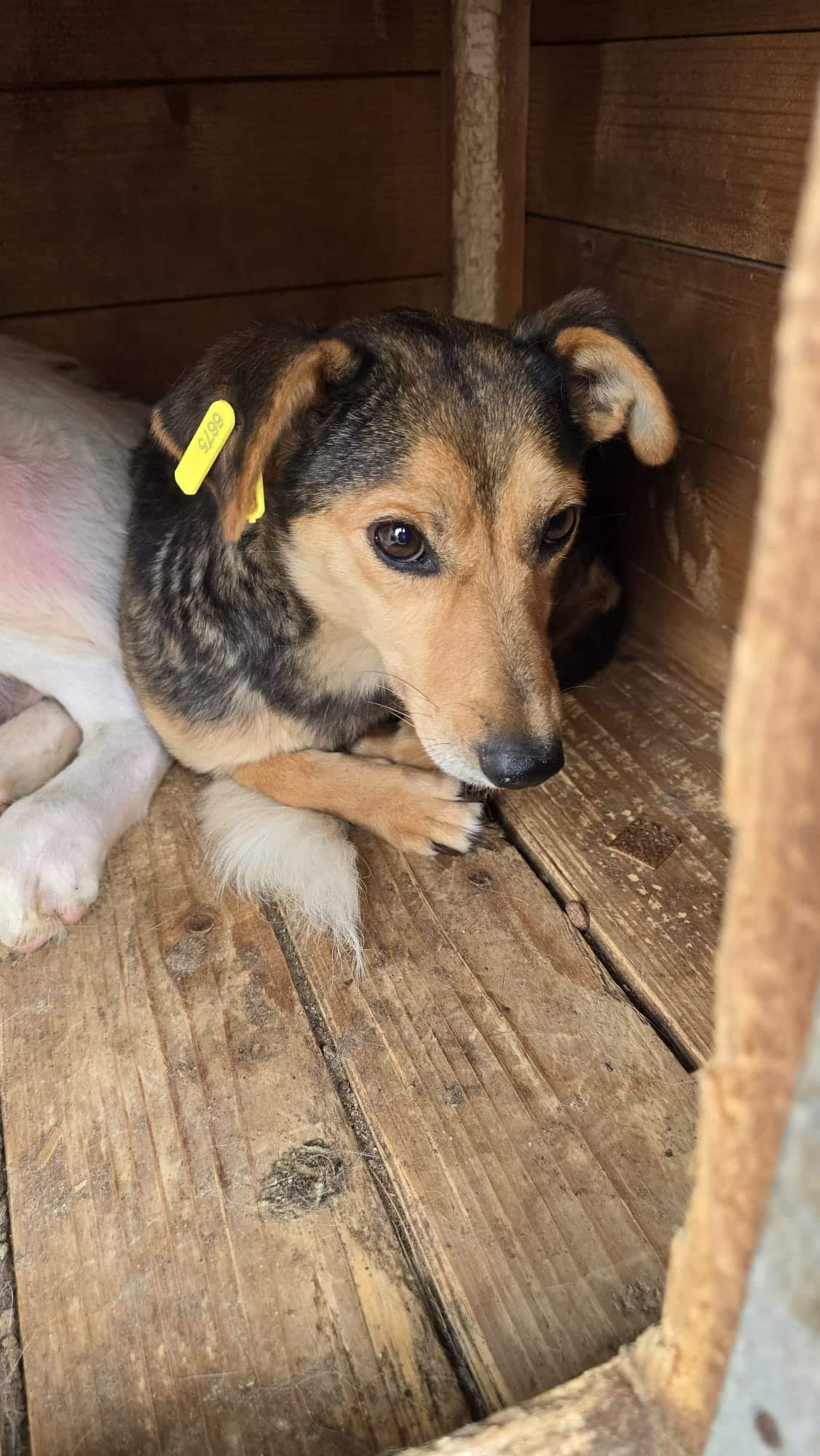 Die kleine JOELA sitzt gemeinsam mit größeren Junghunden in ihrem Kennel. Dort wirkt sie verträglich, geht jedoch aufgrund ihrer Größe unter und hält sich daher im Hintergrund auf, um nicht irgendwo zwischen zu geraten. Bei unserem Betreten den Kennels zitterte sie und versuchte, sich zwischen den Hütten zu verstecken. Wir konnten sie in einer Ecke fixiert aber streicheln, ohne auch nur den Ansatz eines Abwehrverhaltens von ihr zu sehen. Genießen konnte sie dies allerdings noch nicht, aber sie zeigte sich dabei zu jeder Zeit absolut defensiv. Nach einiger Zeit hörte JOELA sogar auf zu zittern und zeigte etwas Neugier. Leckerchen konnte sie dann auch schon aus der Hand fressen. Mit etwas Geduld und Eingewöhnungszeit wird sie sicher gut auftauen.