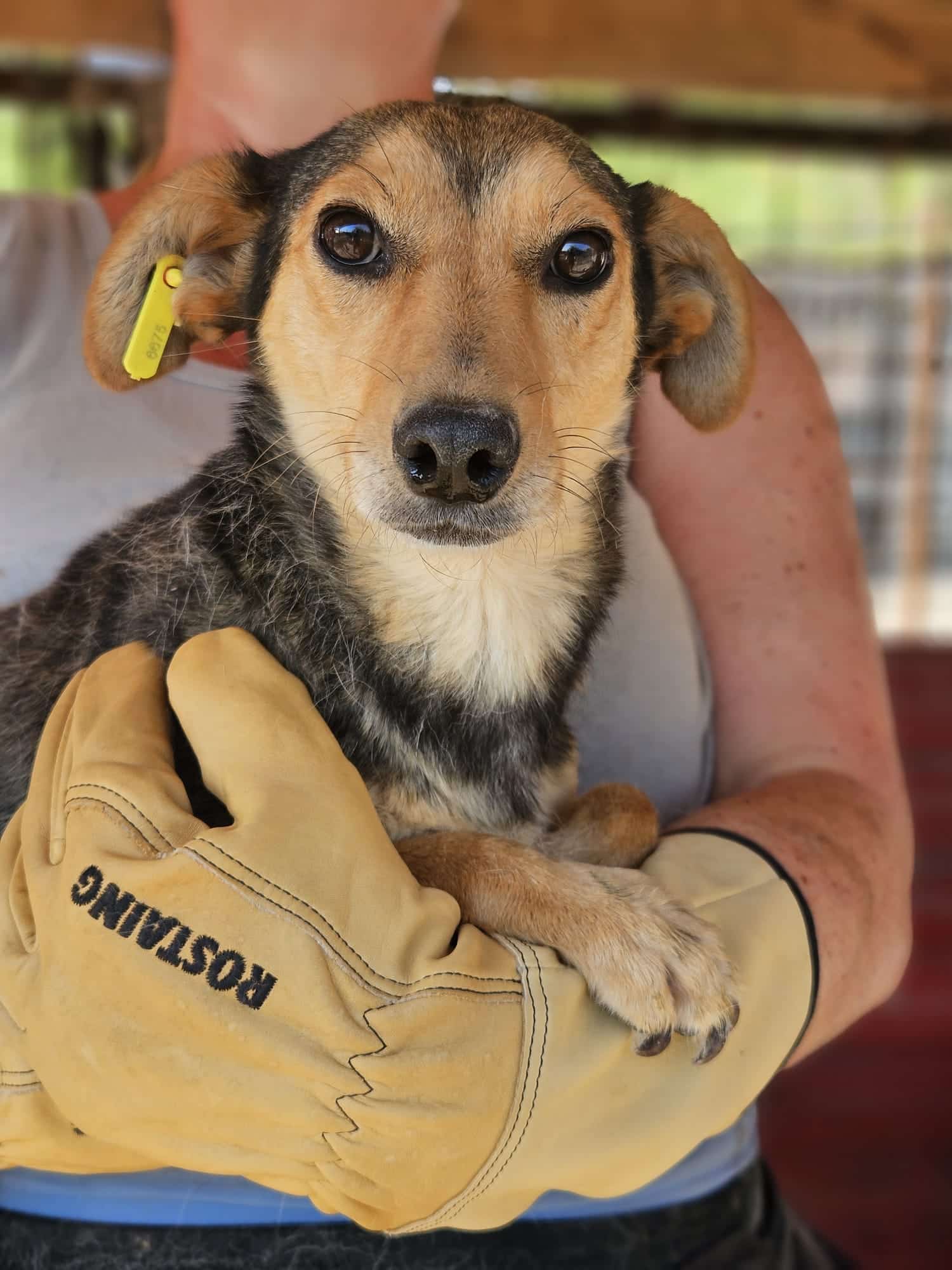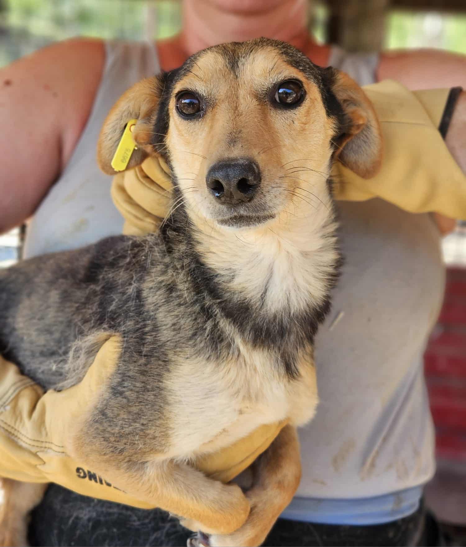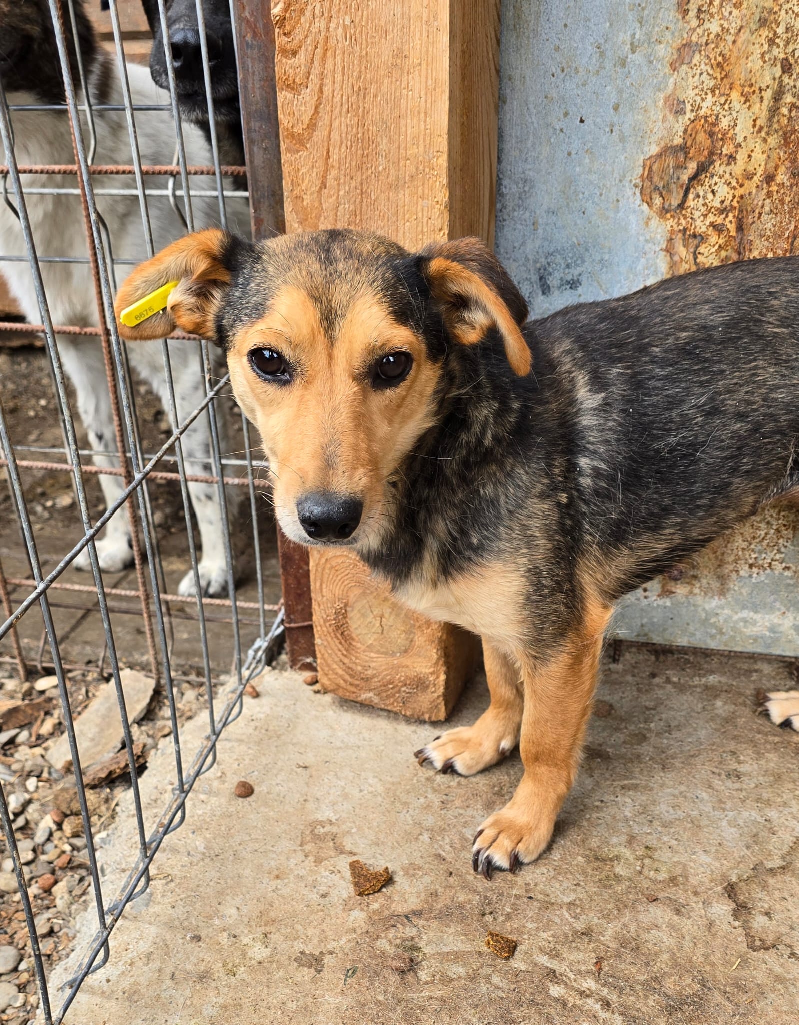 Die kleine JOELA sitzt gemeinsam mit größeren Junghunden in ihrem Kennel. Dort wirkt sie verträglich, geht jedoch aufgrund ihrer Größe unter und hält sich daher im Hintergrund auf, um nicht irgendwo zwischen zu geraten. Bei unserem Betreten den Kennels zitterte sie und versuchte, sich zwischen den Hütten zu verstecken. Wir konnten sie in einer Ecke fixiert aber streicheln, ohne auch nur den Ansatz eines Abwehrverhaltens von ihr zu sehen. Genießen konnte sie dies allerdings noch nicht, aber sie zeigte sich dabei zu jeder Zeit absolut defensiv. Nach einiger Zeit hörte JOELA sogar auf zu zittern und zeigte etwas Neugier. Leckerchen konnte sie dann auch schon aus der Hand fressen. Mit etwas Geduld und Eingewöhnungszeit wird sie sicher gut auftauen.