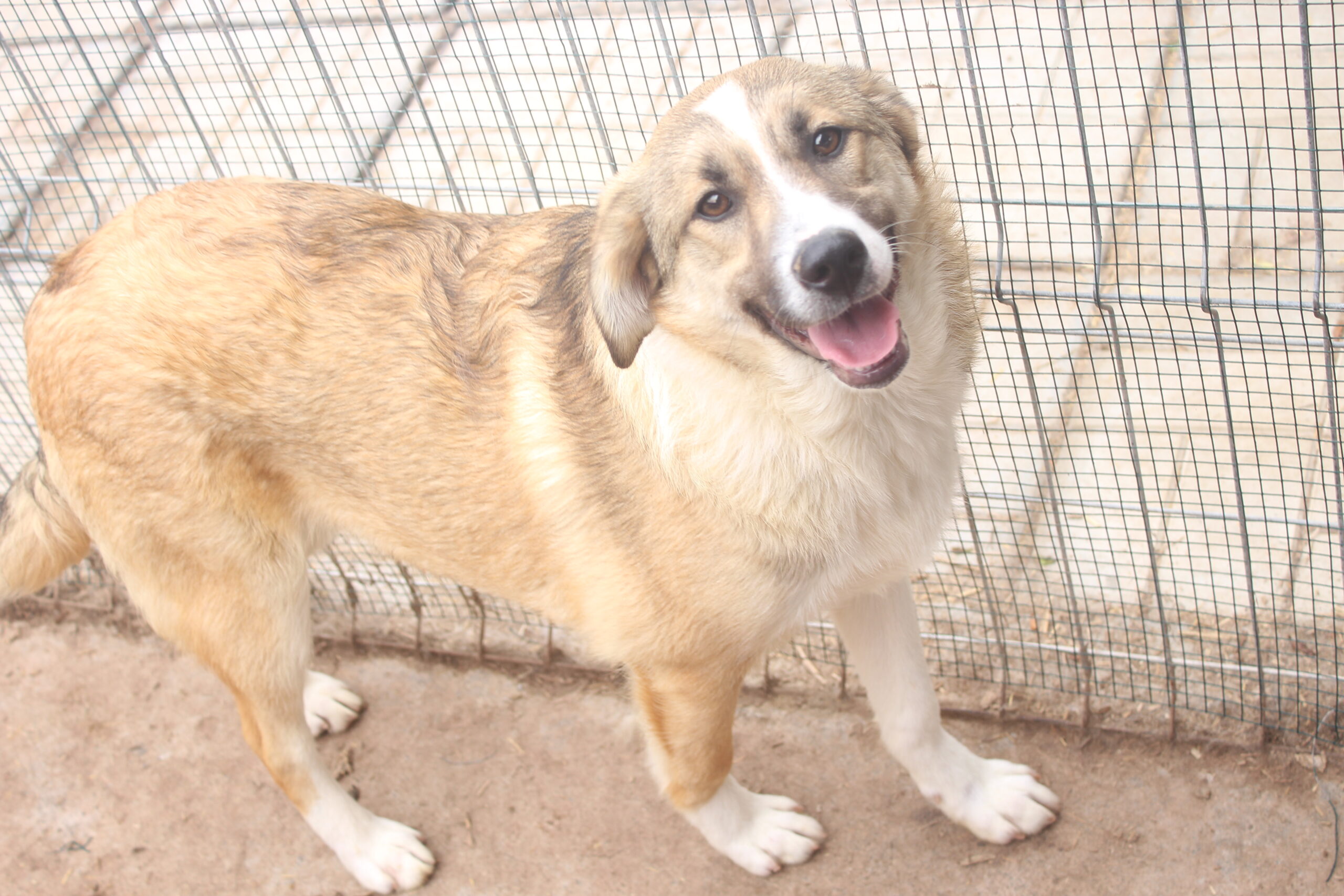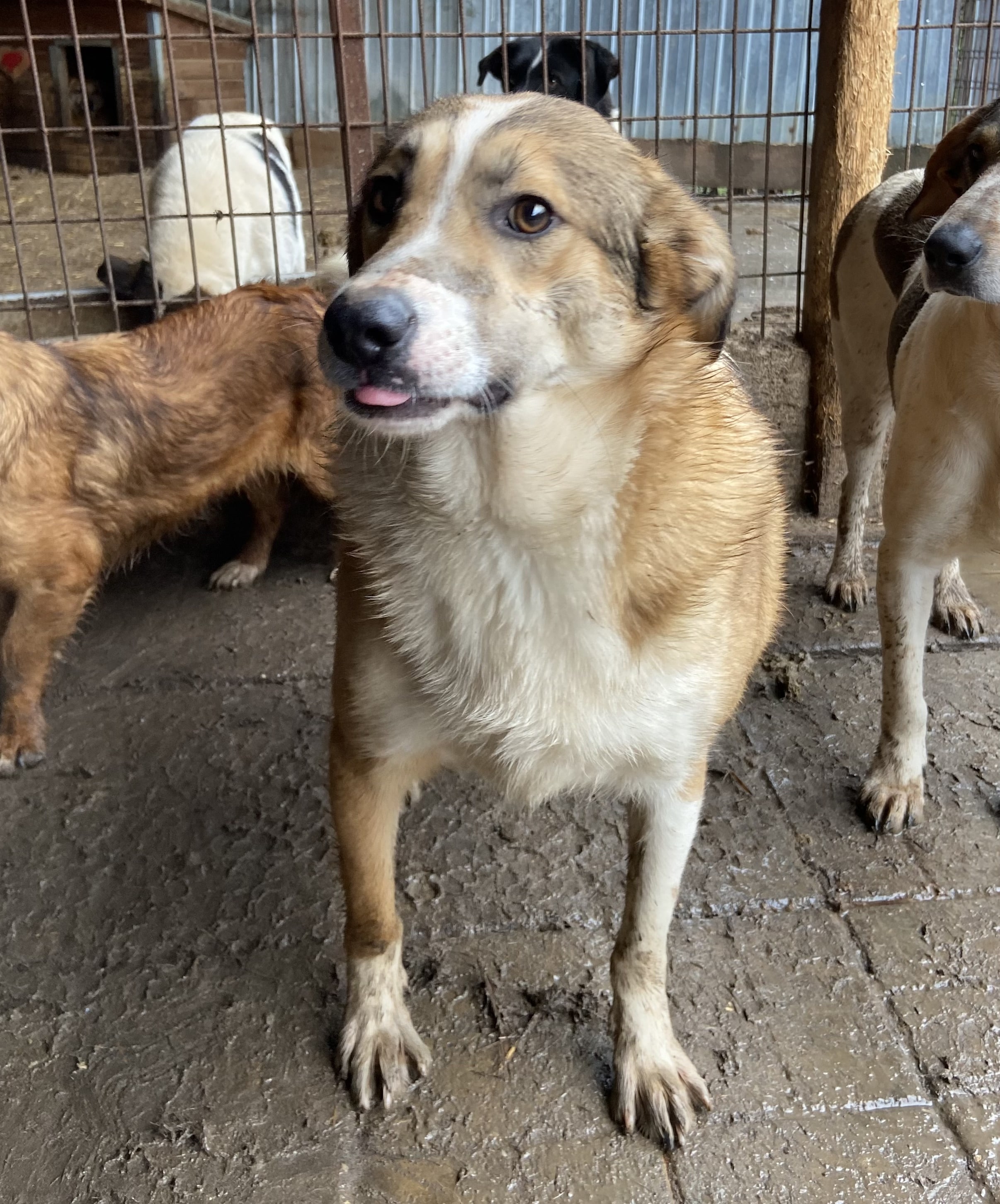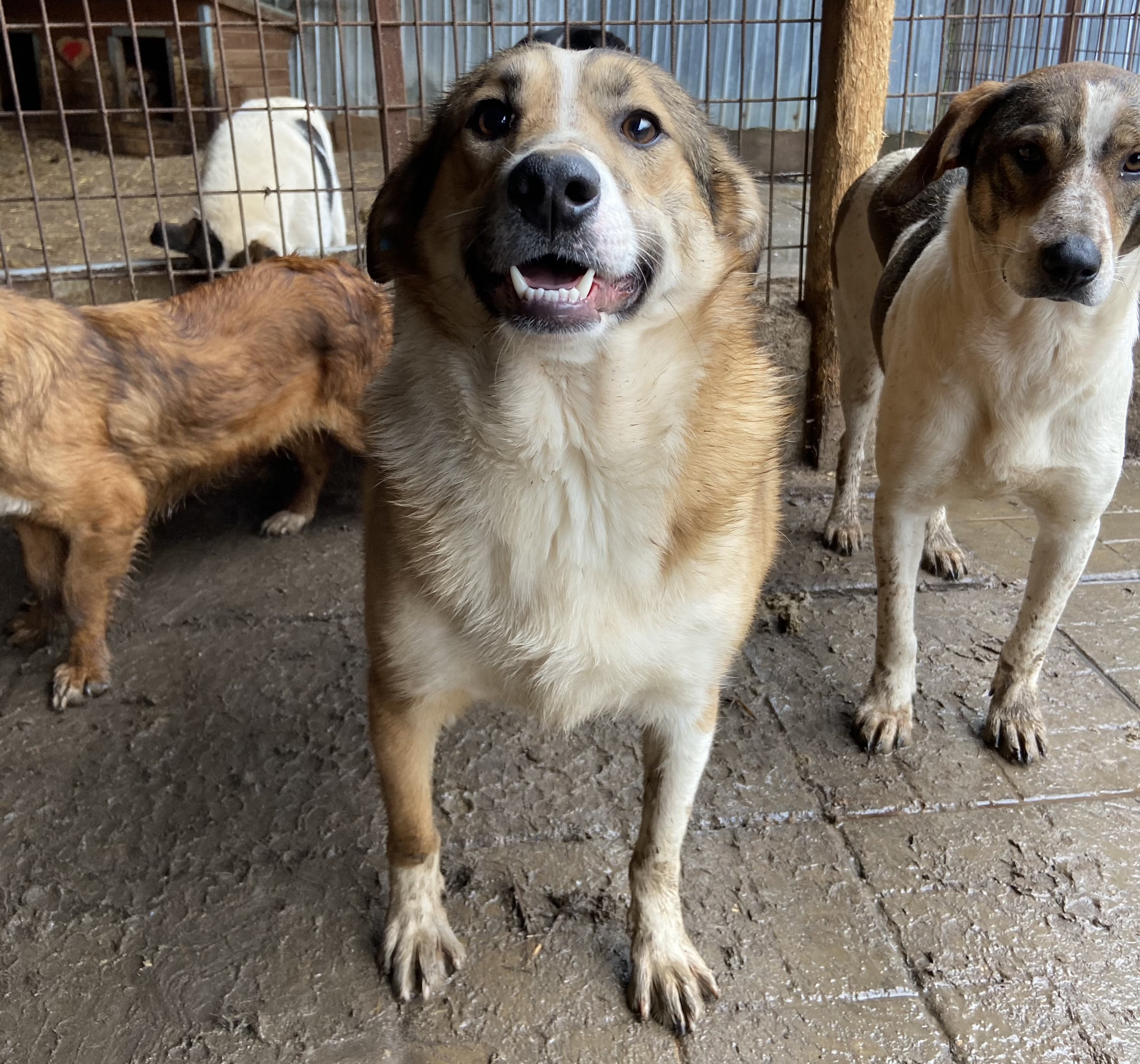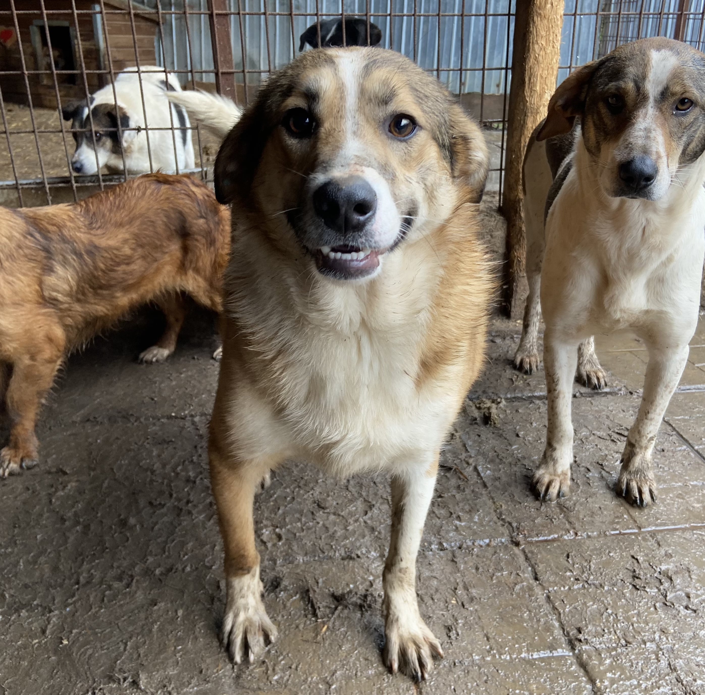JOGIist weiterhin ein freundlicher, noch etwas unsicherer Rüde. Er ist einer der Mutigsten in seinem Kennel und möchte gerne Kontakt haben, er weiß einfach nur nicht so richtig, wie das geht. Er nahm gerne unsere Leckerlies aus der Hand und wir konnten ihn vorsichtig an der Schnauze berühren, er weicht dann aber zurück.