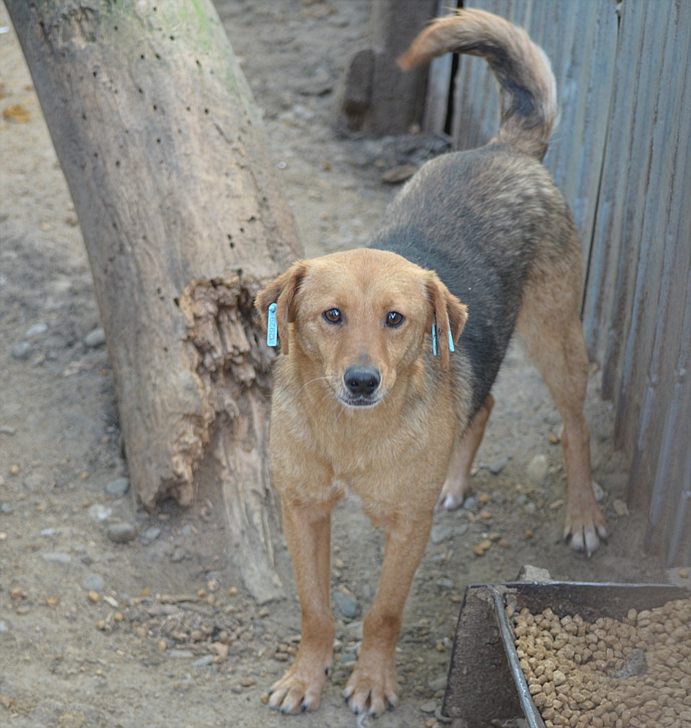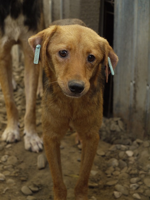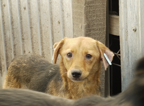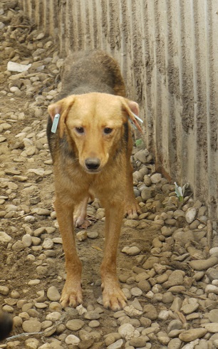 JOHANNY ist immer noch sehr unsicher und weicht sofort zurück. Zusammen mit 2 anderen Hunden seines sehr engen Schlauch-Kennels geht er aber auf die Stiefel los, sobald man sich abwendet.