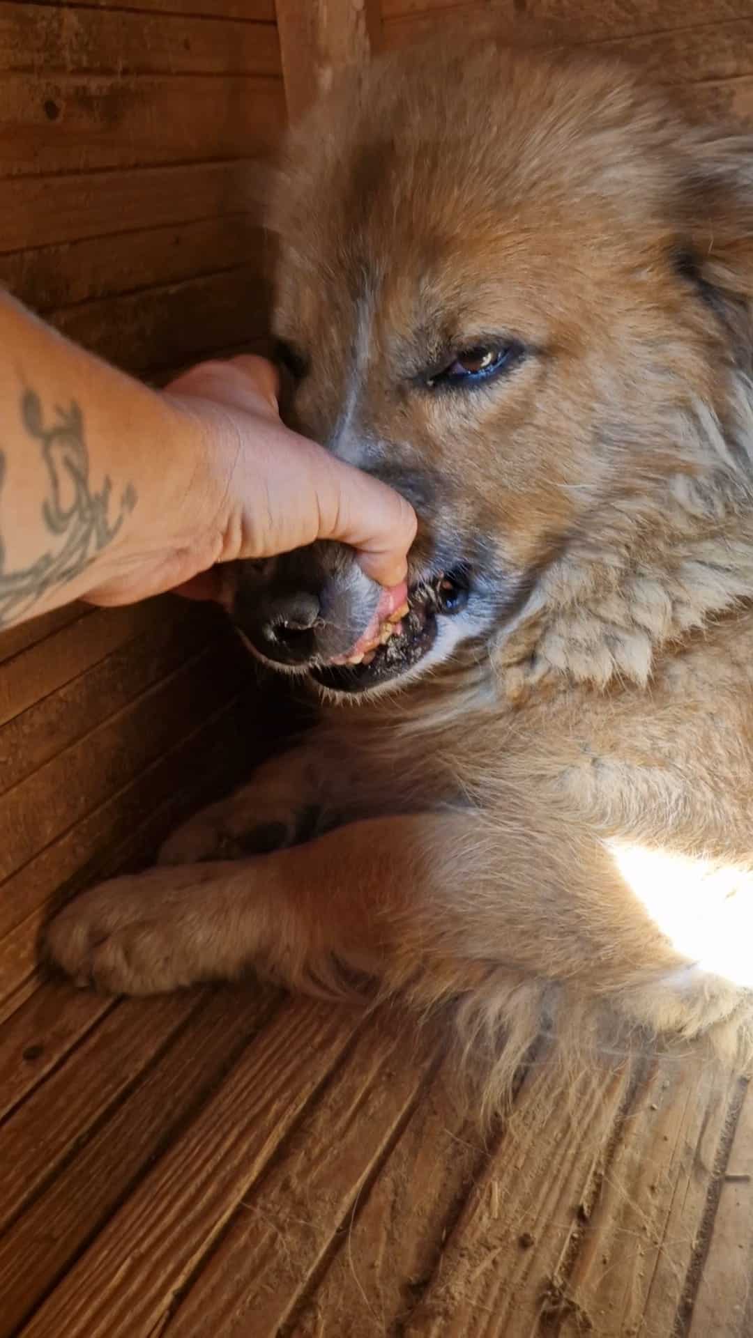 Nach einiger Zeit kam JORI dann aus der Hütte, als wir ihm Leckerlis anboten, die er auch gefressen hat. Er wusste aber nicht so recht, wo er sich hinstellen sollte und man hatte tatsächlich das Gefühl, dass er aufgrund seiner Schmerzen irgendwie auf sich aufmerksam machen wollte. JORI ließ sich streicheln, wirkte dabei aber teilnahmslos, ihm ging es nicht gut. Trotz unserer Streicheleinheiten zog er sich dann wieder in seine Hütte zurück, ließ sich aber auch dort streicheln und seine sehr schlechten Zähne anschauen. Wir schätzen ihn verträglich ein.