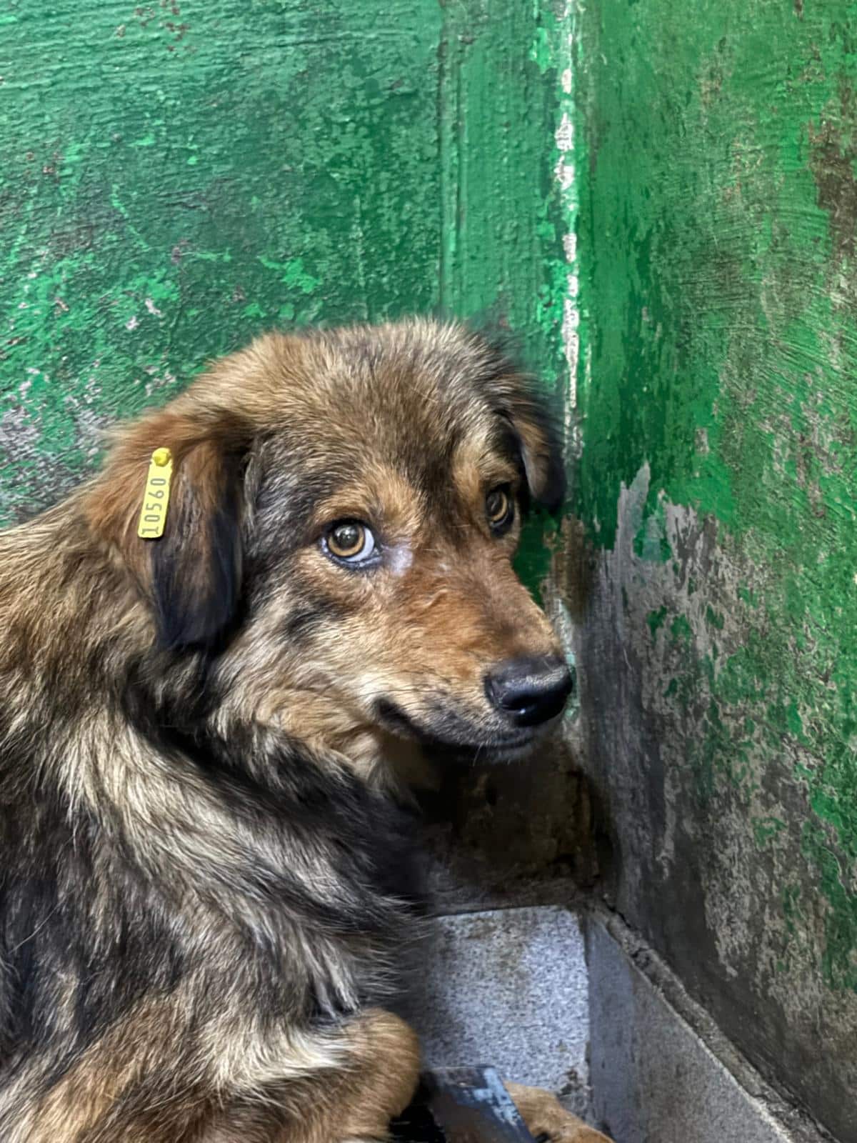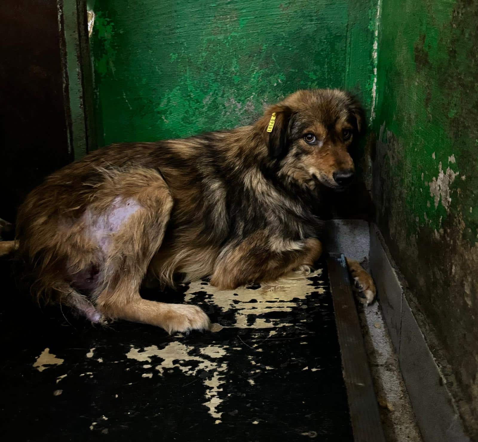 Dem armen JORY wurde ein Stück von seiner Rute abgerissen, dazu ist er viel zu dünn und hat starke Hautprobleme. Daher muss JORY nun erst einmal in den gruseligen Vetkennel ausharren, wo er völlig eingeschüchtert in der Ecke liegt. Wir konnten ihn vorsichtig streicheln, aber er war ängstlich dabei.