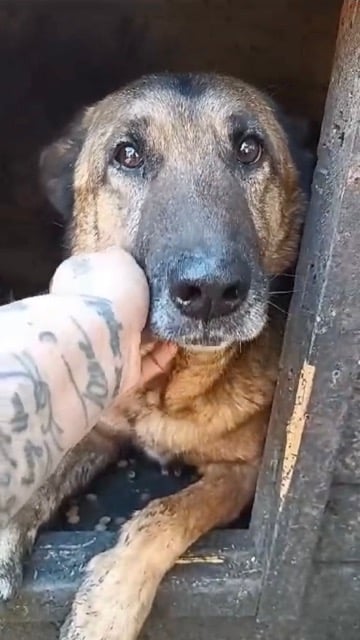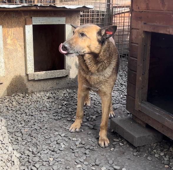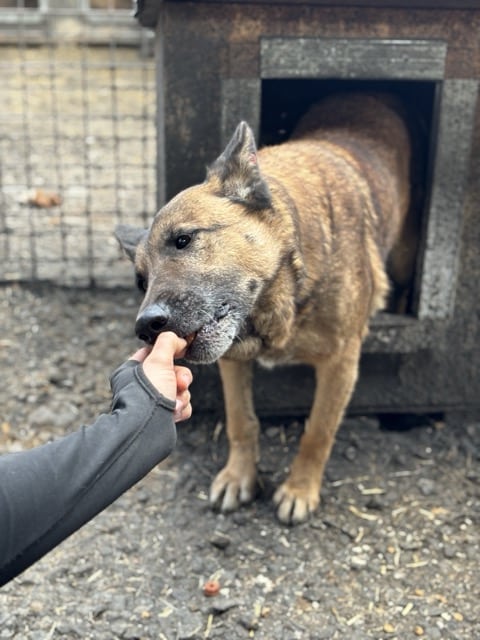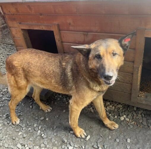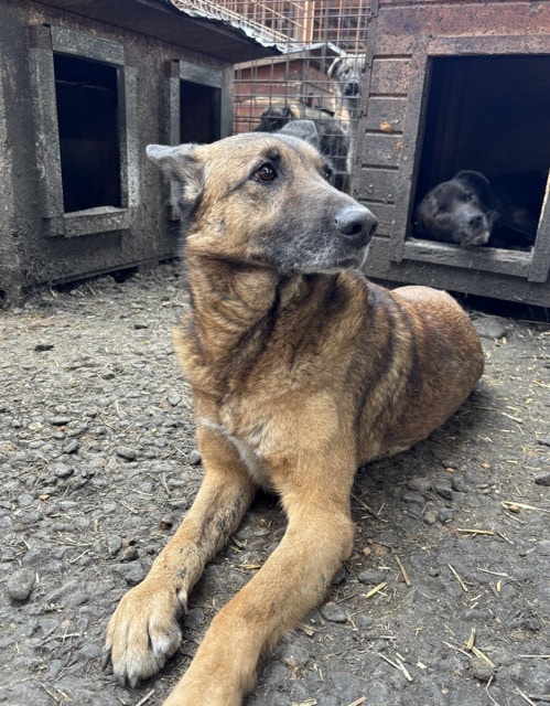 JOSHA verhielt sich bei unserem Besuch leider sehr zurückhaltend und unsicher. Man merkte die angespannte Stimmung im Kennel und JOSHA’s Strategie scheint völliger Rückzug und Unterordnung zu sein… Er will jeglichem Ärger aus dem Weg gehen und hielt sich augenscheinlich bewusst im Hintergrund, drängte sich nicht auf und es kostete uns einige Überzeugungsarbeit, ihm unsere Leckerlie schmackhaft zu machen, sodass er sich doch welche aus unseren Händen erhaschte, zwischendurch immer wieder in der Hütte verschwindend und stets ein wachsames Auge auf den dominanten Rüden im Kennel, der ihm das Leben schwer zu machen scheint… Für JOSHA suchen wir dringend einen liebevollen Platz bei Menschen, die ihn endlich zur Ruhe kommen lassen und ihm die Zeit und den Raum geben, um sich vom anstrengenden Shelterleben zu erholen.