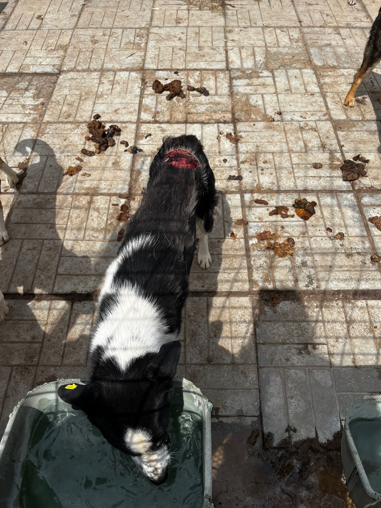 JOSUA kam sofort aus der Hütte, als er uns sah, und suchte Schutz. Dann sahen wir das ganze Ausmaß: eine recht frische große Bisswunde über den Rücken. Er entleerte sich erstmal und suchte weiterhin Schutz bei uns und in seiner Hütte. Er konnte in ein Vetkennel-Abteil verlegt werden, doch hier kontrolliert ein Hund das Futter und JOSUA sitzt nur ängstlich in einer Ecke. Alle anderen Vetkennels sind voll. Wir suchen dringend einen Platz!