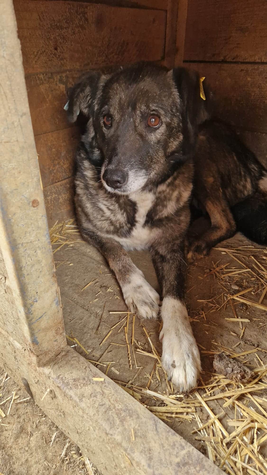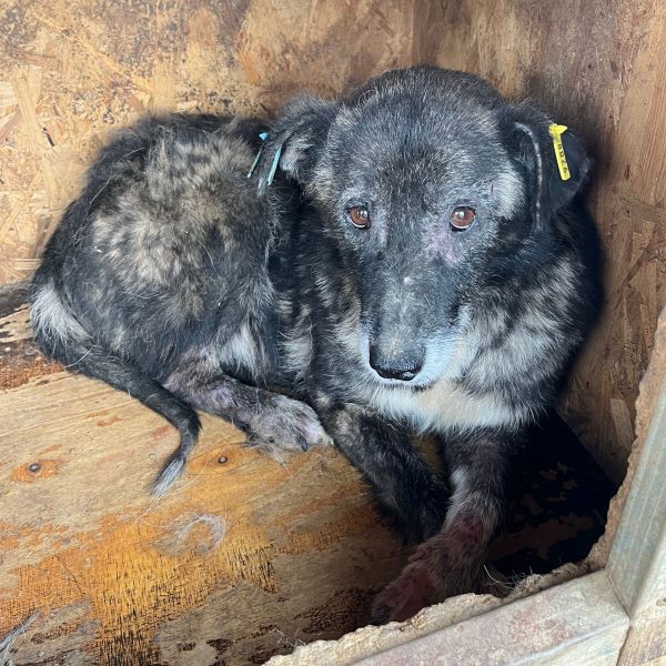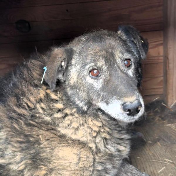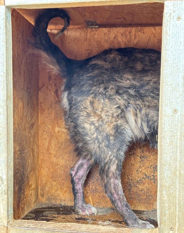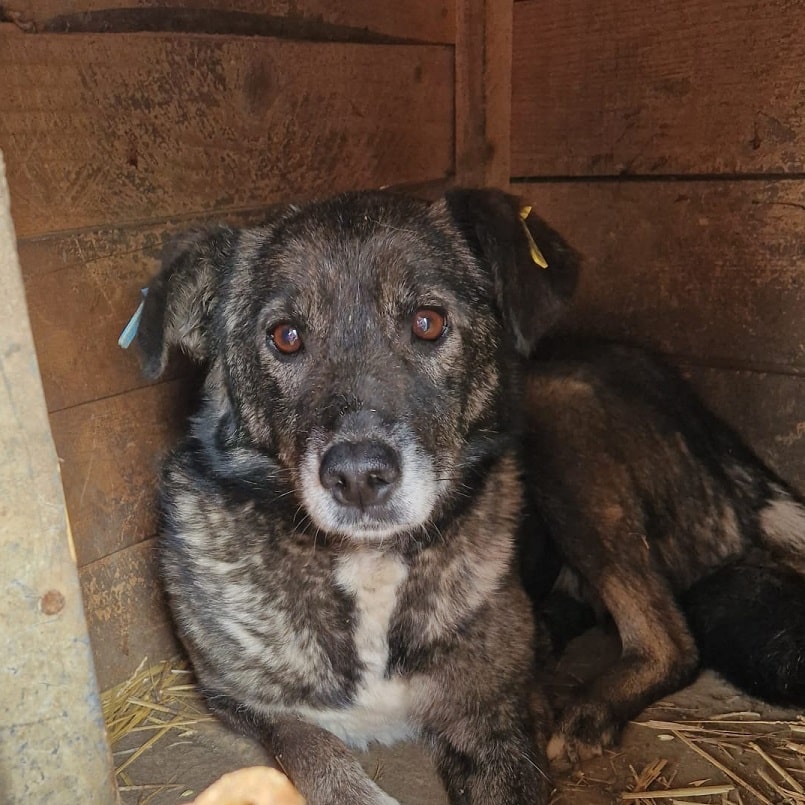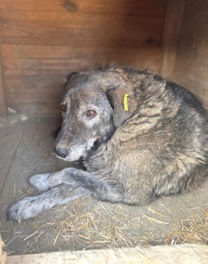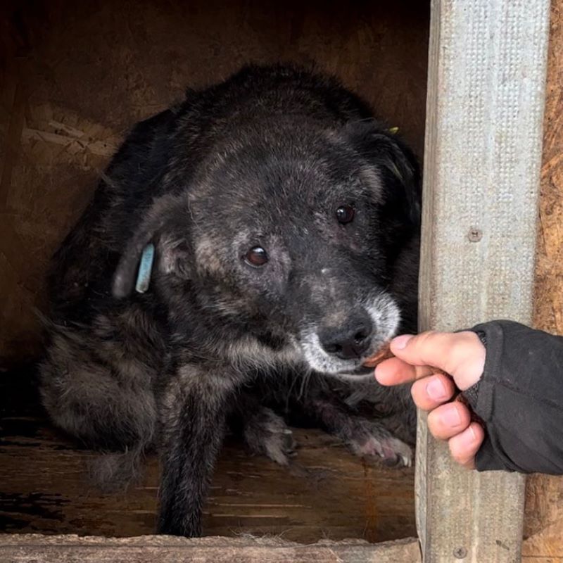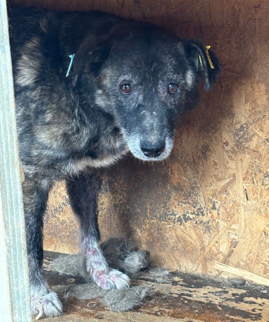 Unsere liebe Hundeomi Judy hat sich in einigen Bereichen erfreulich entwickelt: Sie ist nicht mehr zu dünn und ihre Haut hat sich erholt. Dennoch merkt man ihr nun das Alter deutlicher an – ihr Gangbild ist unrund, sie bewegt sich nicht mehr so sicher wie früher. Daher verbringt sie auch den Großteil ihrer Zeit liegend in der Hütte. Bei unserem Besuch zeigte sich Judy weiterhin vorsichtig im Umgang mit uns Menschen. Leckerchen nahm sie freundlich aus der Hand, wich sonst aber zurück und zog sich lieber in ihre Hütte zurück, wo sie sich sicher fühlt. Für Judy wünschen wir uns sehnlichst einen ruhigen und liebevollen Platz bei geduldigen, erfahrenen Menschen, die ihr Sicherheit geben und sie in ihrem Tempo ankommen lassen. Ein freundlicher Ersthund könnte ihr dabei helfen, Vertrauen zu fassen und langsam aufzutauen.