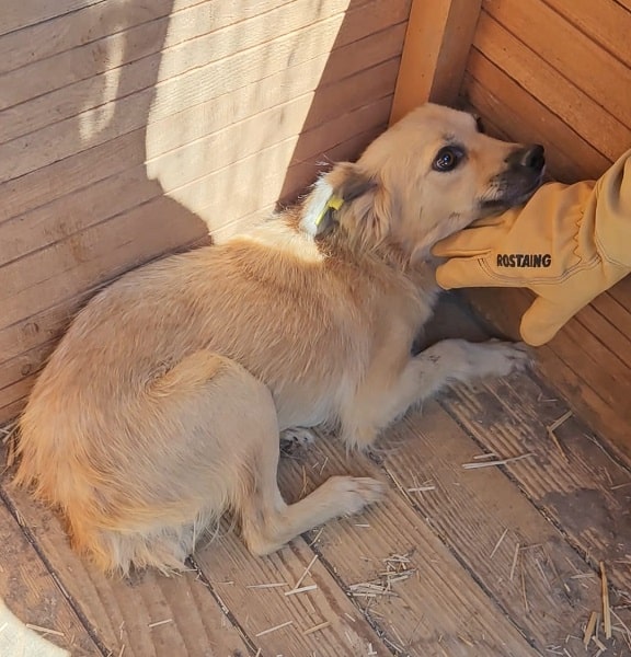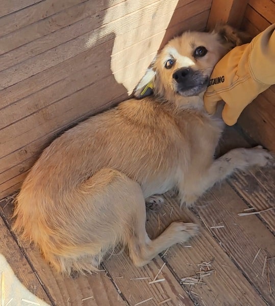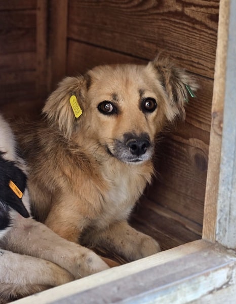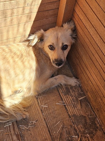 Die kleine JUVY ist neu im Shelter und noch völlig mit der neuen Situation überfordert. Als wir uns ihr zuwandten, war sie im ersten Moment verunsichert und zeigte nicht ernst gemeinte Abschnapper. X beruhigte sich aber schnell und wir konnten sie in der Hütte streicheln. Genießen konnte sie unsere Streicheleinheiten aber noch nicht.