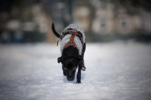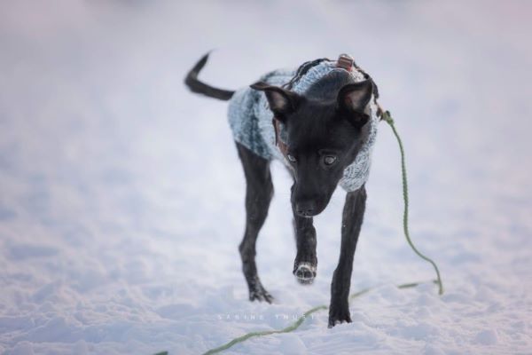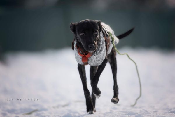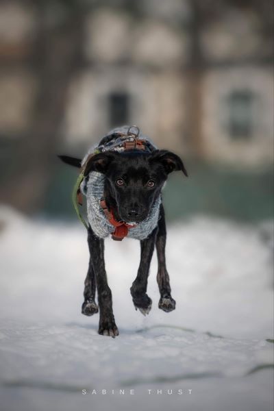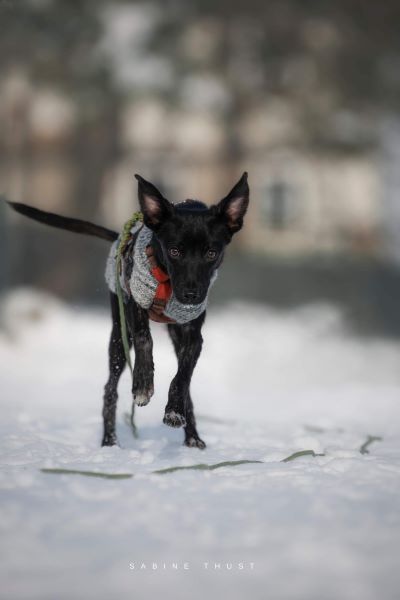 Sie ist verträglich mit den Hunden hier auf der Pflegestelle, muss aber aufpassen, dass sie nicht unter die Räder kommt, weil sie so zierlich ist. Da steckt sie dann schon schlauerweise etwas zurück und wartet ab, bis die anderen losgesprintet sind. Sie ist ein cleveres kleines Mädchen unglaublich zart gebaut und obwohl sie jetzt schon etwas zugenommen hat, wird sie mittelgroß oder sogar eher kleiner und immer sehr graziös bleiben (Mitte Februar 35 cm Schulterhöhe). Fast wie ein Windhund.