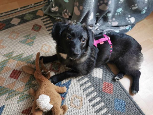 Kajika ist eine fröhliche kleine Hündin, zutraulich, verschmust und verspielt. Sie liebt es zu rennen und herumzutollen. Spazieren gehen findet sie super! Begegnungen mit anderen Hunden verlaufen dabei vollkommen entspannt.