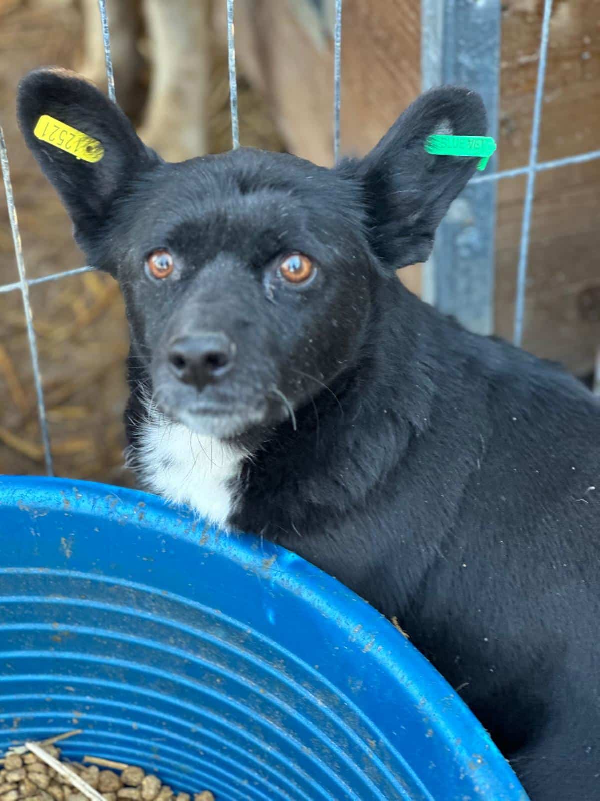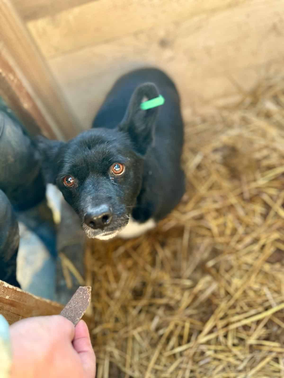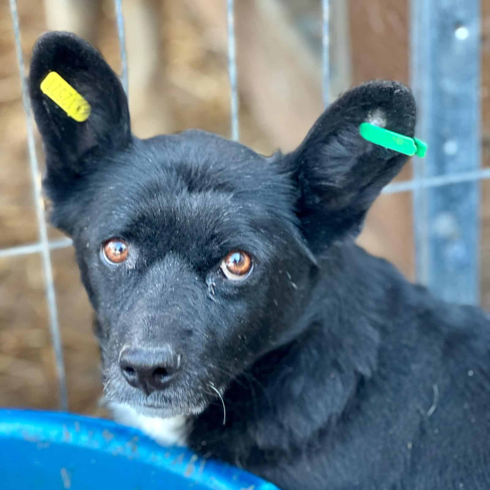 Diese sehr kleine Hündin nahm in der Hütte noch Leckerchen, aber war doch sehr von uns beeindruckt. Wenn KANIA konnte, wich sie aus. Bedrängten wir sie oder versuchten anzufassen, zeigte sie Abschnappverhalten. Also hier bedarf es ausreichend Hundesachverstand mit unsicheren Hunden, die sich auch wehren können. KANIA zeigte sich verträglich.
