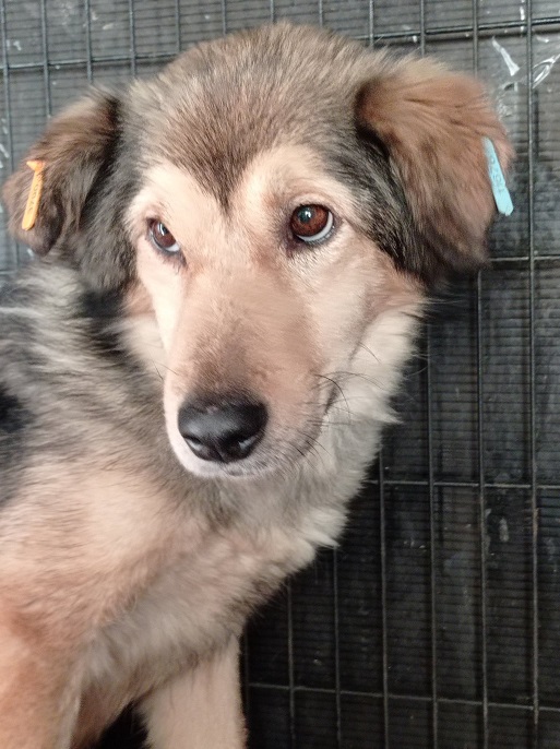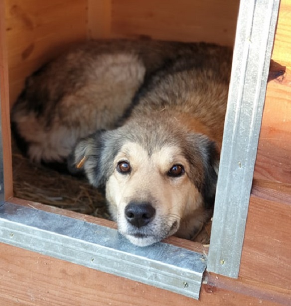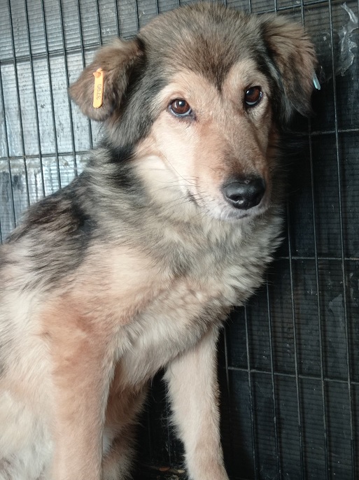 Aniela hat KARJA vor wenigen Wochen völlig abgemagert im Kennel vorgefunden. Anscheinend haben die anderen Hunde sie nicht ans Futter gelassen. Sie war nun einige Zeit im Container untergebracht, wo sie schon wieder deutlich zugenommen hat. In ihrer Box lässt sie sich vorsichtig anfassen.