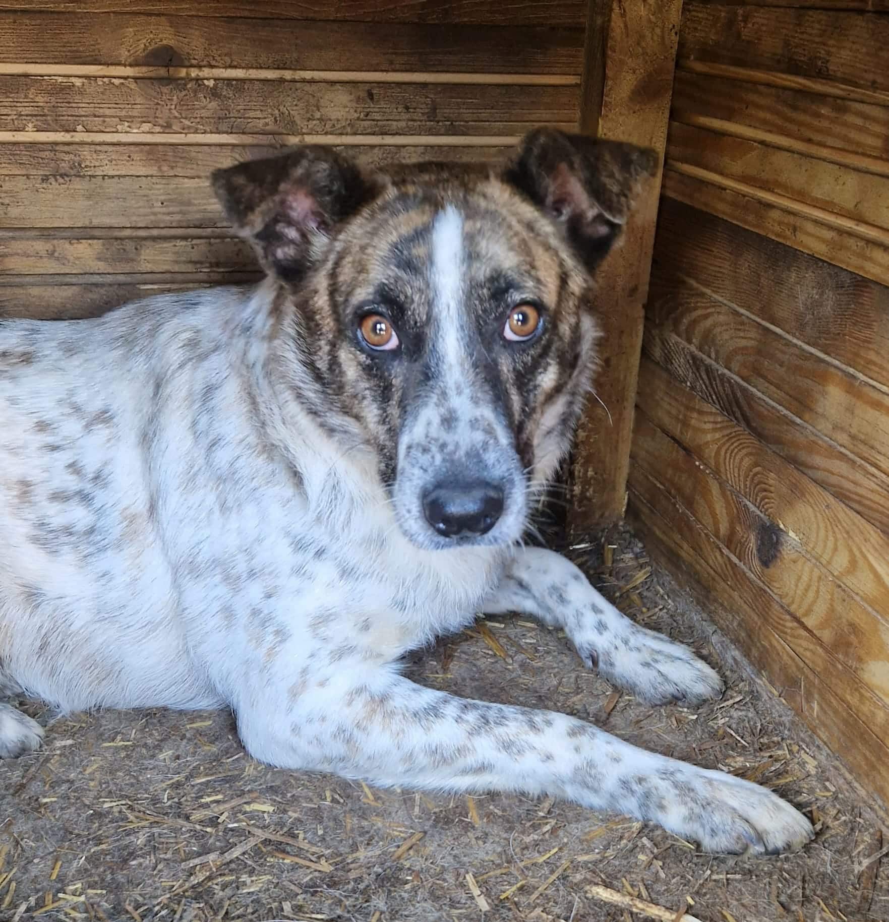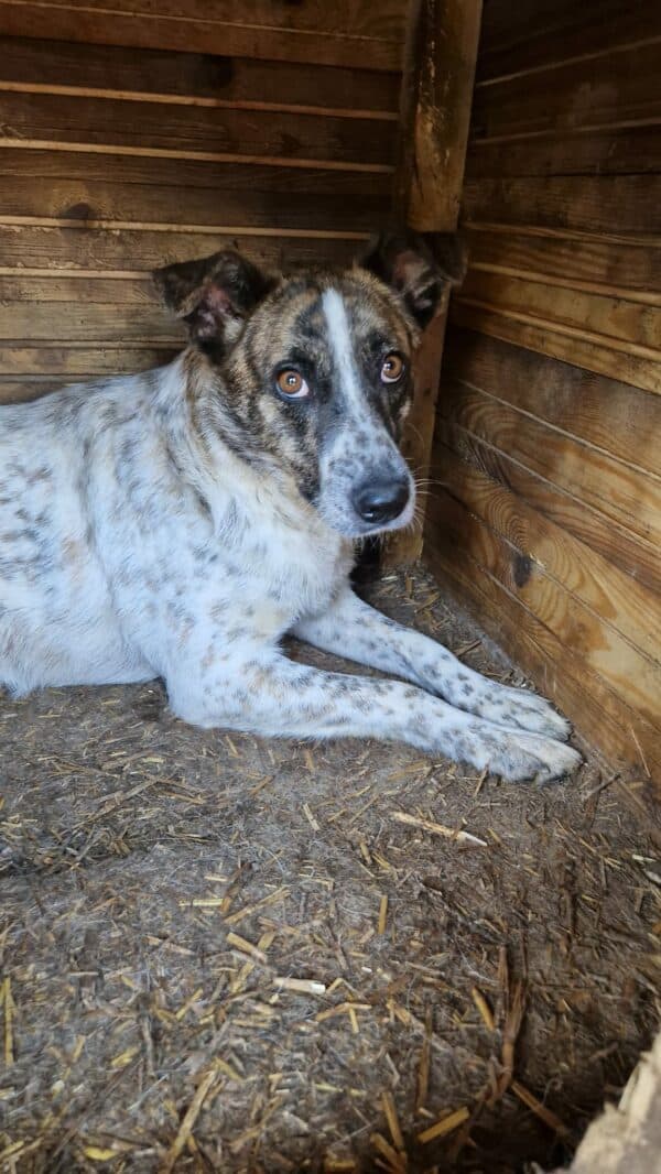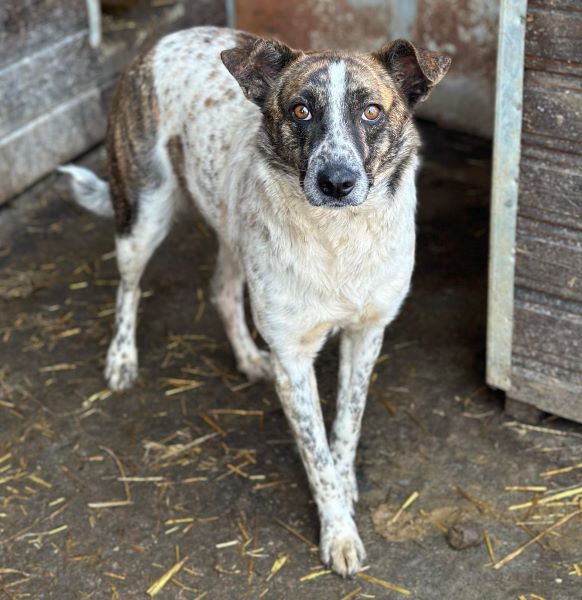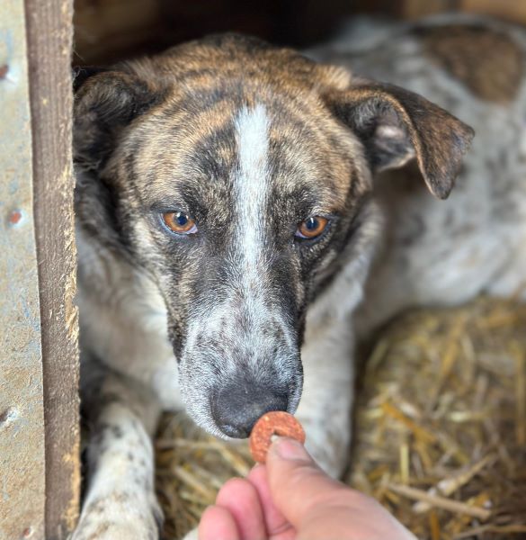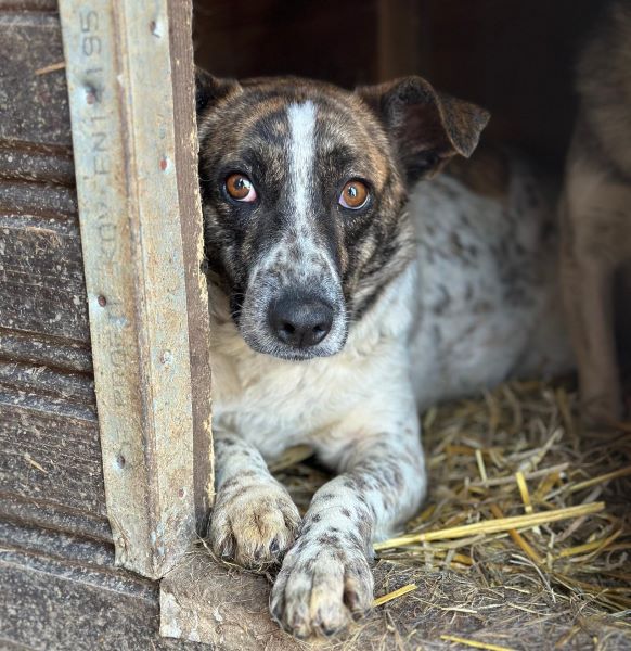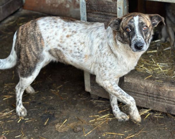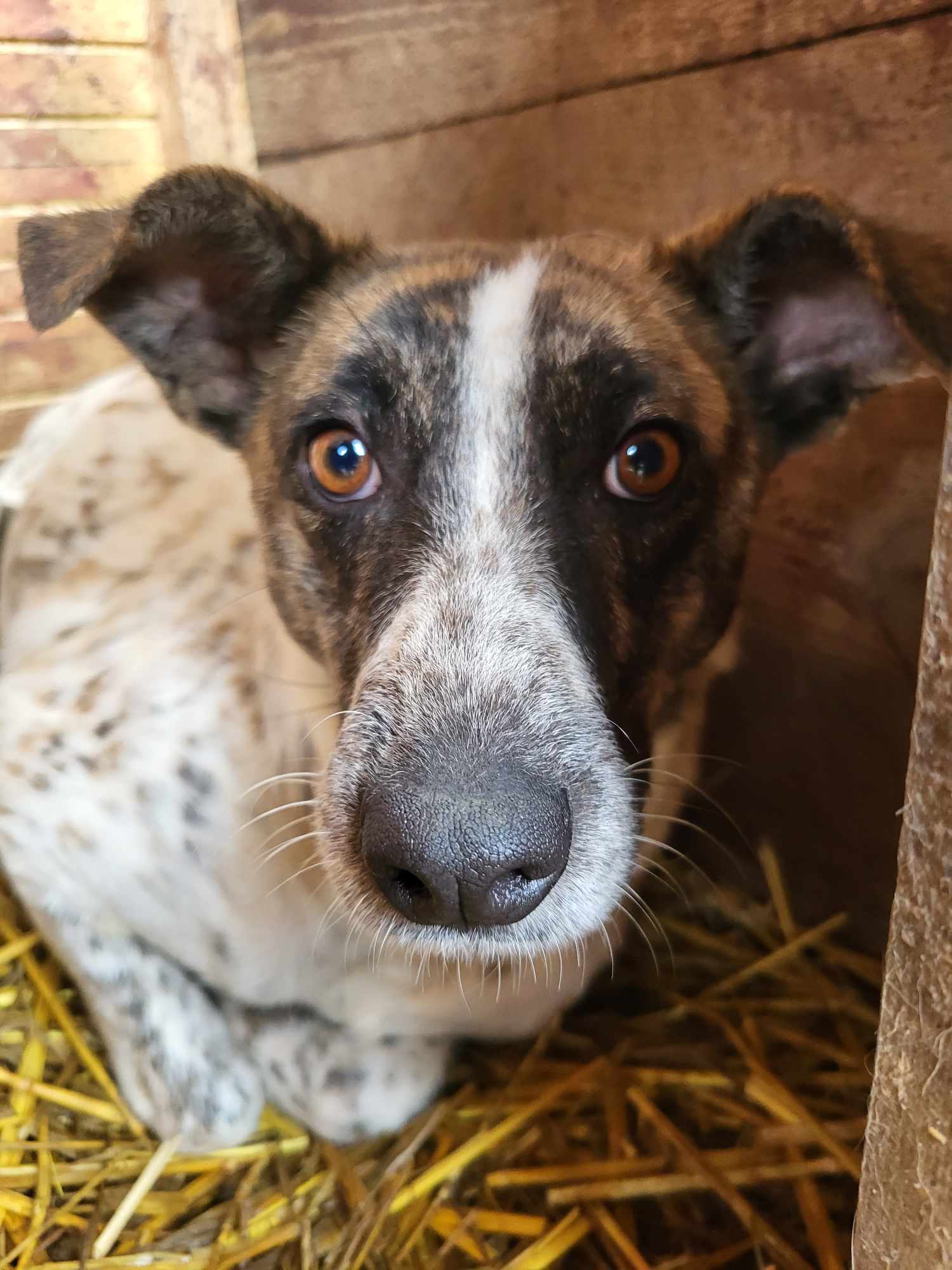 KARLOTTA war neugierig und interessiert. Das hat uns sehr gefreut. Als wir dann auf sie zugingen, ging sie doch lieber in eine Hütte. Unter Bedrängung konnten wir sie gut streicheln. Mit ausreichend Hundeerfahrung würde man Karlotta gut an uns Menschen gewöhnen können. Sie ist verträglich, aber andere Hunde sind für sie nicht überlebenswichtig. Leckerchen findet sie sehr interessant. Kurz überlegte sie, ob sie sie aus den Fingern nehmen kann, der Appetit siegte. Dadurch wird man sie ebenfalls schnell für sich gewinnen können.