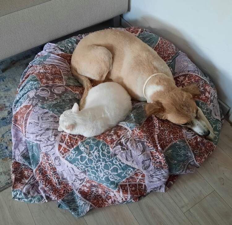 Sie ist immer noch zu allen Menschen und Hunden freundlich. Bei schönem Wetter sind wir jetzt auch gerne im Garten/Terrasse unterwegs. Hier kann ich berichten, dass Karlotta diesen nicht unbedingt braucht. Während wir alle draußen die Sonne genießen, liegt sie lieber im Wohnzimmer auf dem Hundekissen.