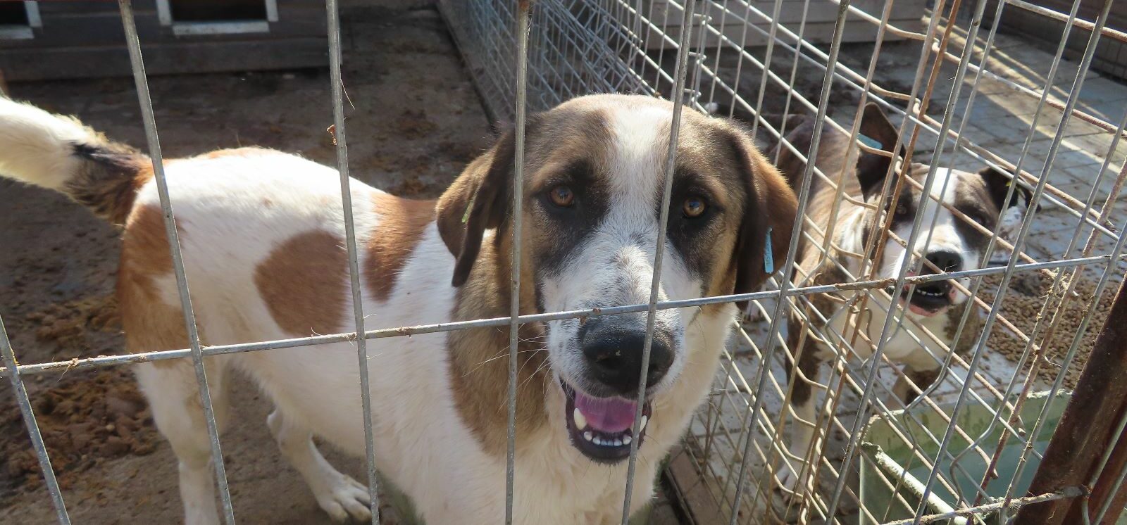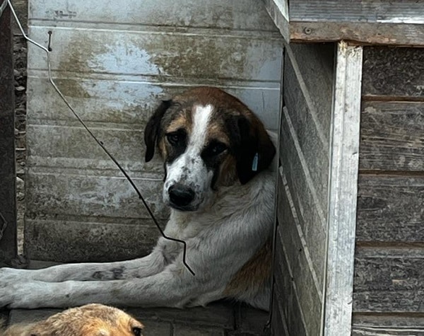 KAROL lag völlig fertig und anteilnahmslos nur hinter der Hütte. Leider gibt in seinem Kennel ein anderer Rüde (kleiner als KAROL) den Ton an, der auch auf uns nicht gut zu sprechen war. Wir konnten KAROL daher nur aus einer gewissen Entfernung locken, ihn aber nicht zum Aufstehen animieren. Er erwartet leider nichts mehr vom Leben. Der arme, sanfte Kerl hat keinen Lebenswillen mehr…