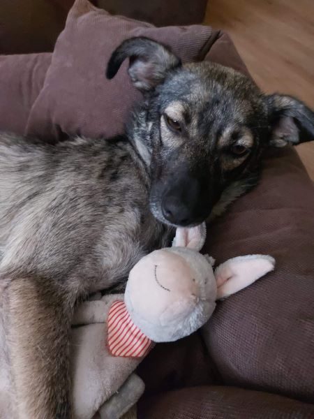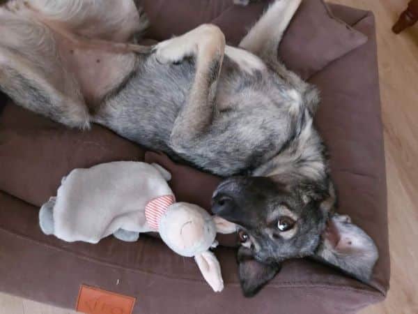 Zuhause kommt sie jedoch super zur Ruhe und ist sehr verkuschelt. Auch alleine bleiben kann sie auch schon für ca. 2-3 Stunden. Mit unserem Hund spielt sie auch sehr sehr gerne… da sieht man auch mal ihren Coyotenblick. Der ist herrlich frech und einfach nur süß!