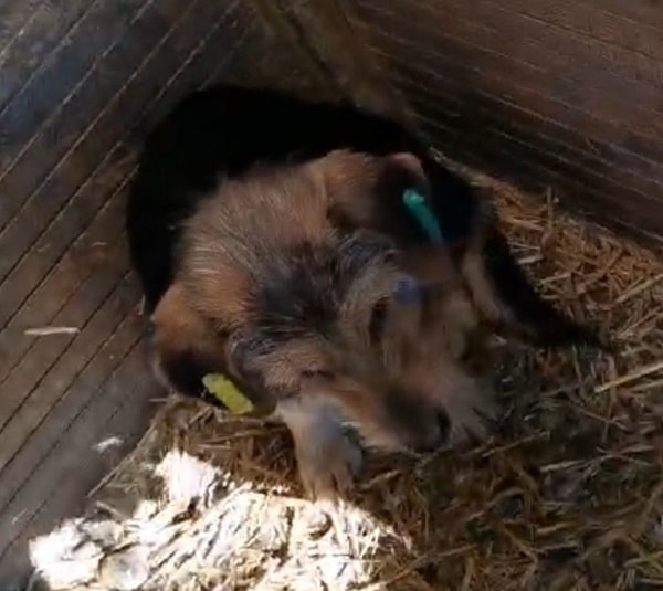 KATHIE sitzt mit einer weitern Hündin in einem Kennel zwischen kleinen wuselnden Welpen. Sie ist mit der Situation sichtlich überfordert. Entsprechend haben wir sie in einer Hütte in eine Ecke gedrückt gefunden. Mit etwas zureden kam sie nach einer Weile neugierig nach vorne. Dabei konnten wir sie vorsichtig an der Schnauze berühren. Aus der Hütte heraus traute sie sich aber nicht. Als wir sie in der Hütte bedrängten, schnappte sie nach der falschen Hand. Sie versuchte auch, sich durch Flucht der falschen Hand zu entziehen, was ihr aber nicht gelang. Sie geriet dabei aber nicht in Panik.