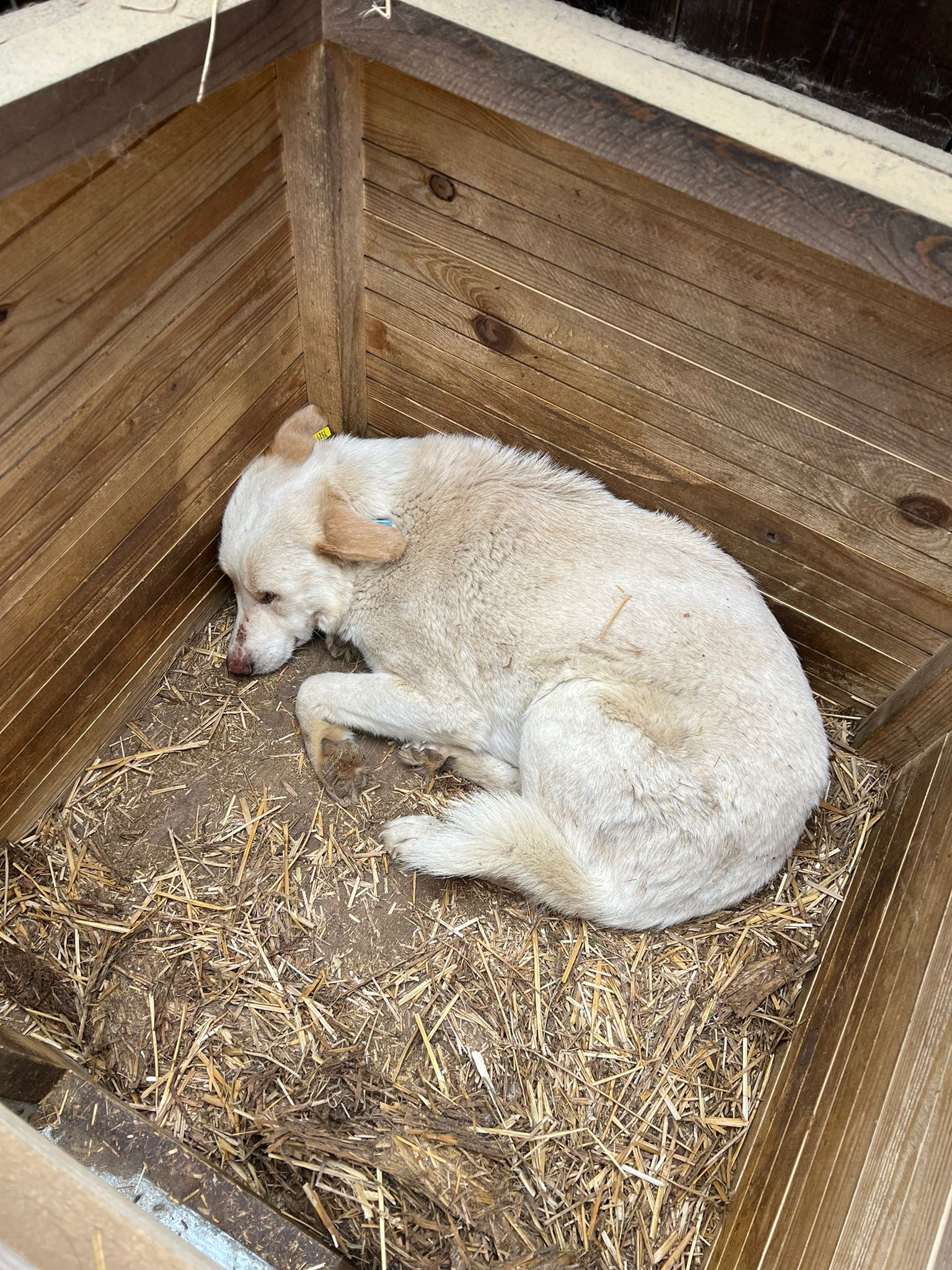 KEIJO ist verständlicherweise dennoch völlig am Ende und liegt nur in seiner Hütte. Hier zeigt er sich sehr lieb und problemlos anfassbar.