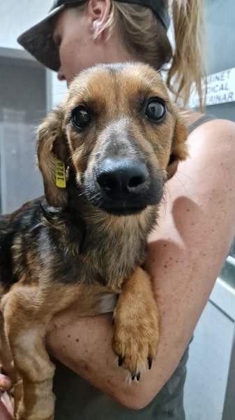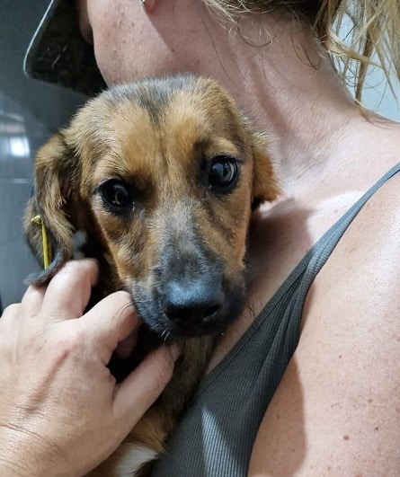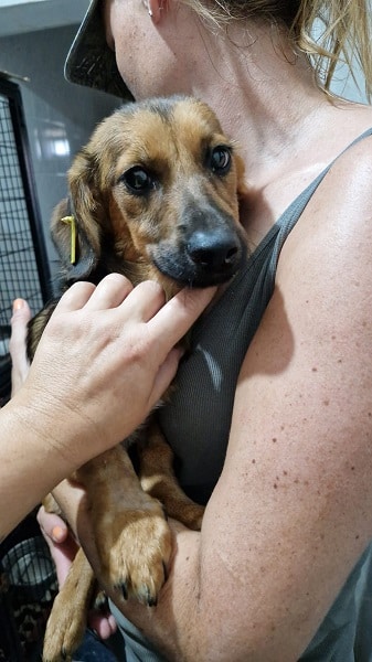 Dieser wirklich kleine Rüde sitzt aktuell im Haus zusammen mit einem Welpen in einem Käfig. Er hat sich sehr über unseren Besuch gefreut und sich völlig problemlos rausholen und auf dem Arm nehmen lassen.