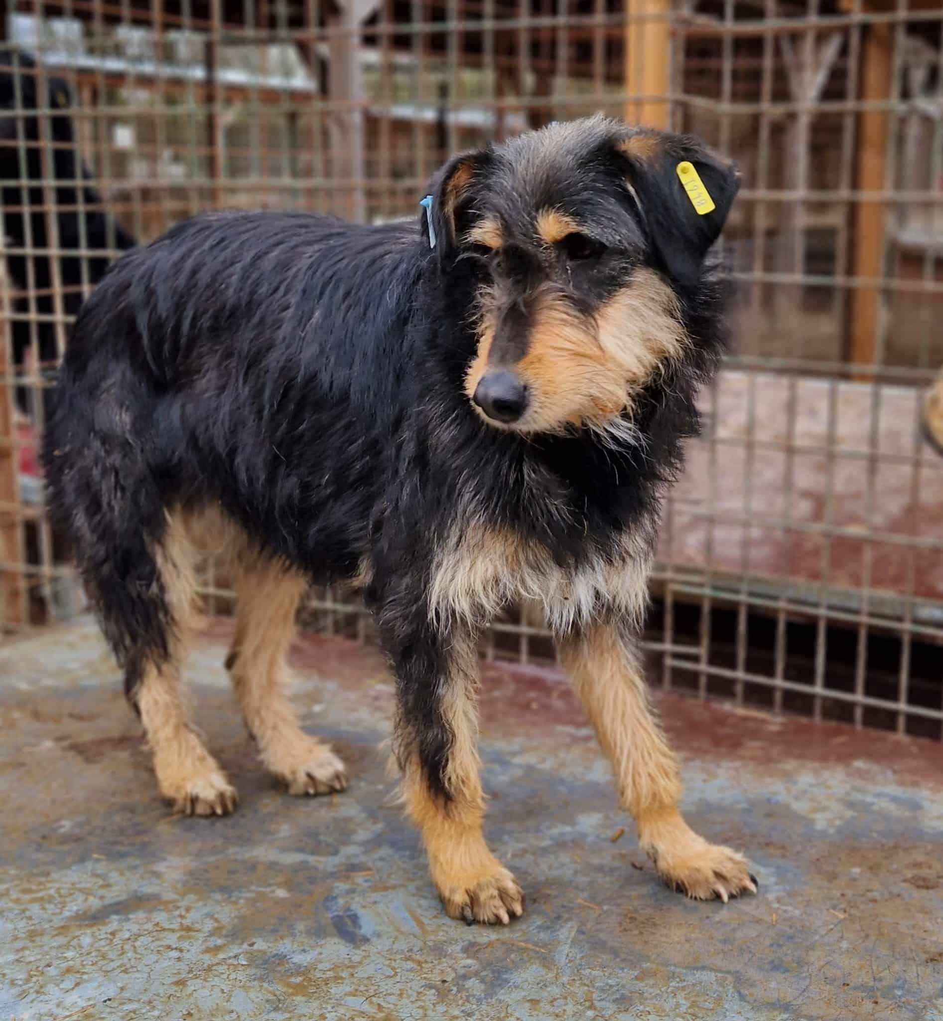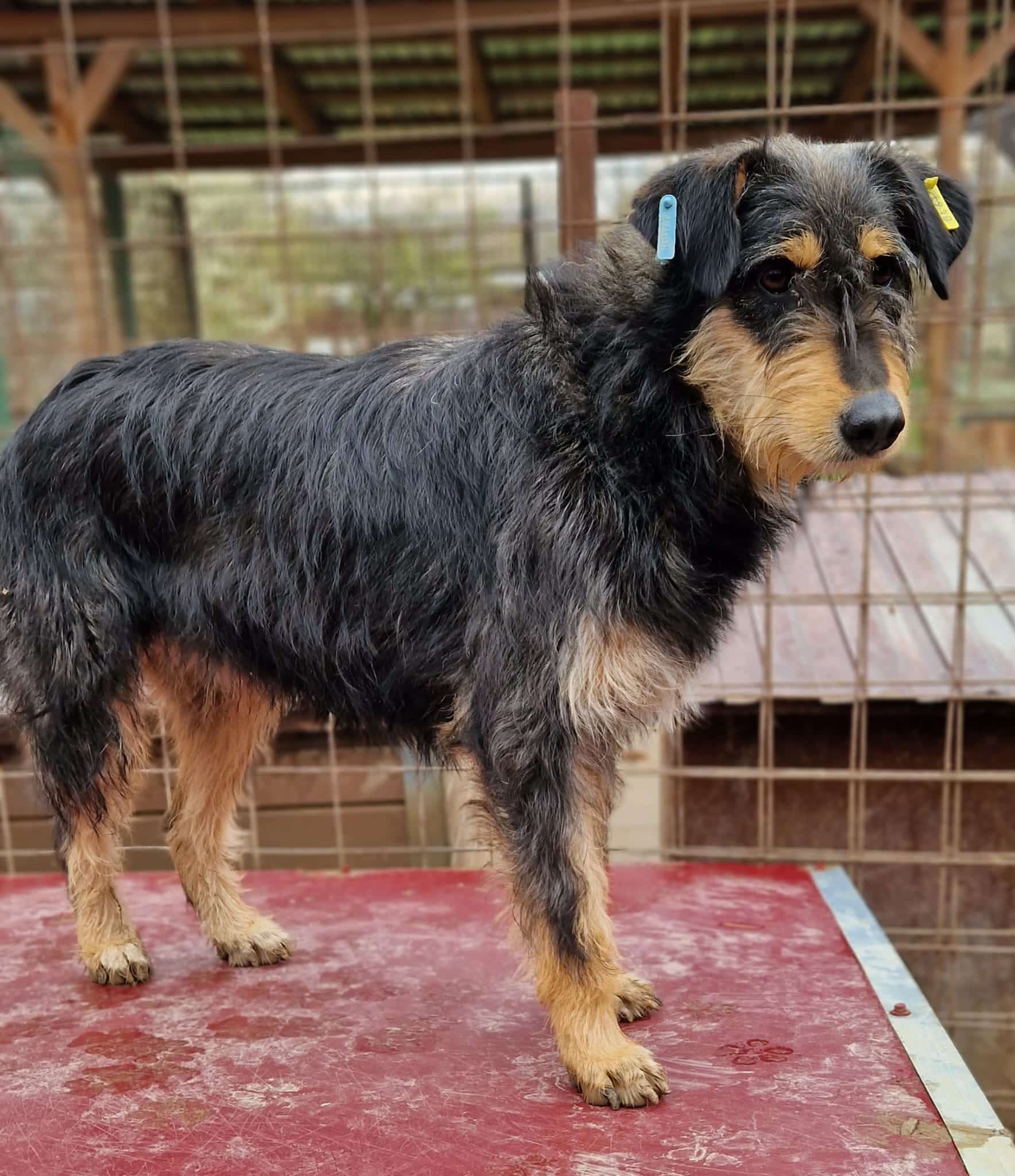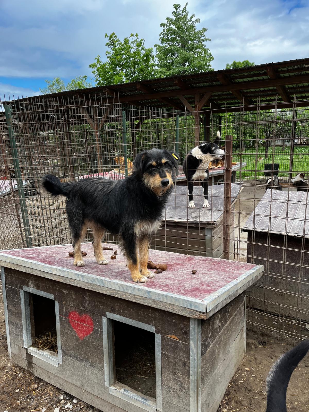 wir konnten keine Interaktionen mit anderen Hunden beobachten, in ihrem Kennel sitzt ein junger aktiver Rüde, möglich, dass sie wegen seiner Energie das Hüttendach nicht verließ, wir schätzen sie schon verträglich ein