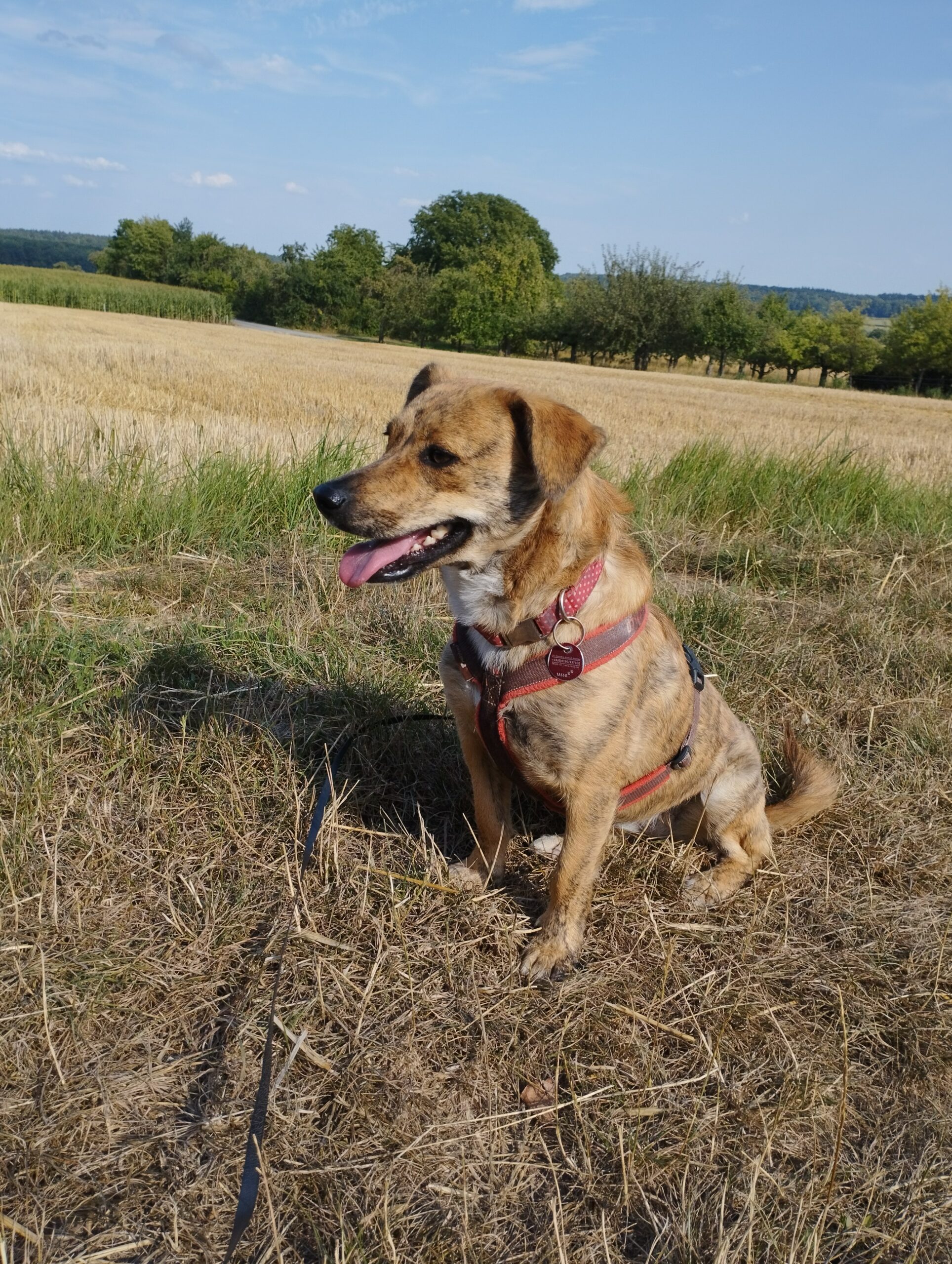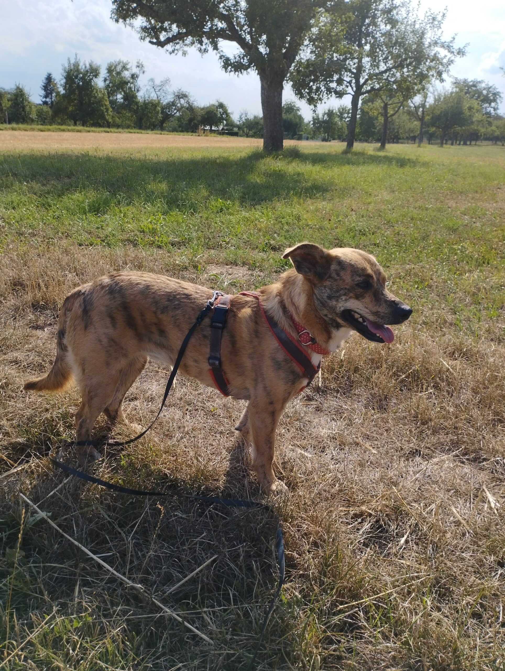 Sie hat einen leichten Jagdtrieb, der, wenn man sich Zeit für sie nimmt, kontrolliert werden kann. Sie geht super gern spazieren und läuft da auch toll an der Leine.